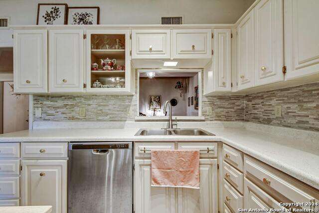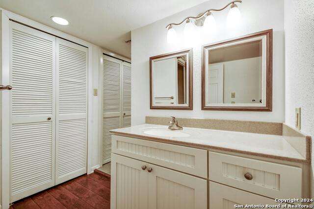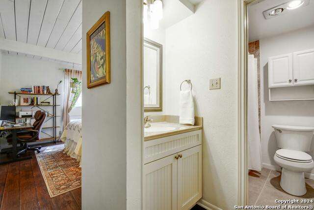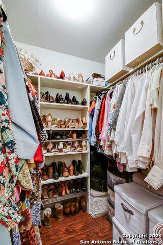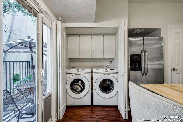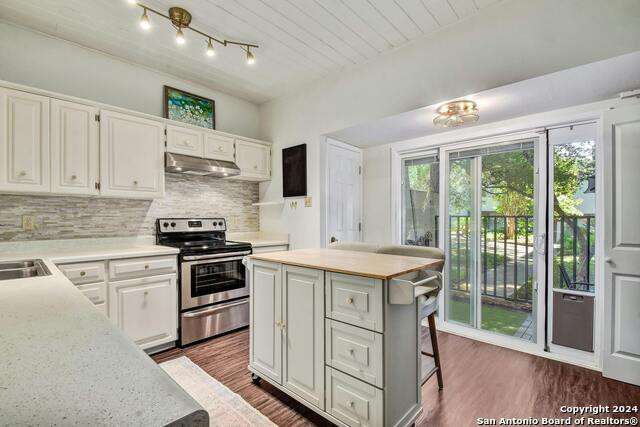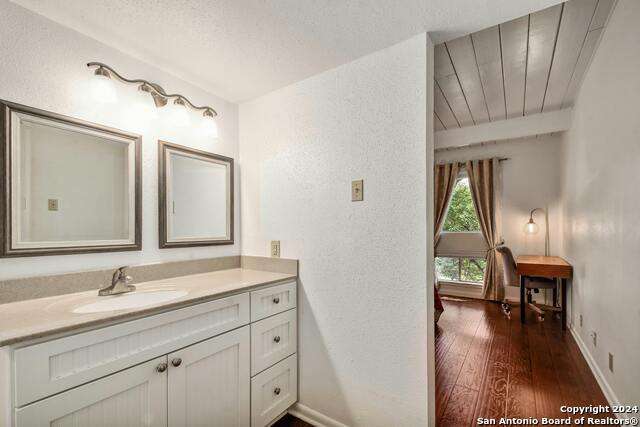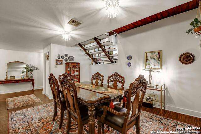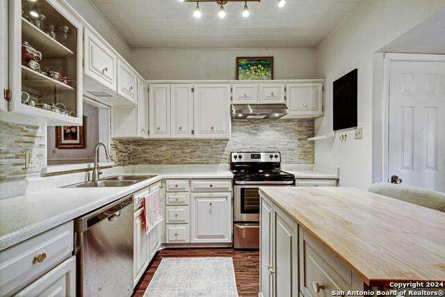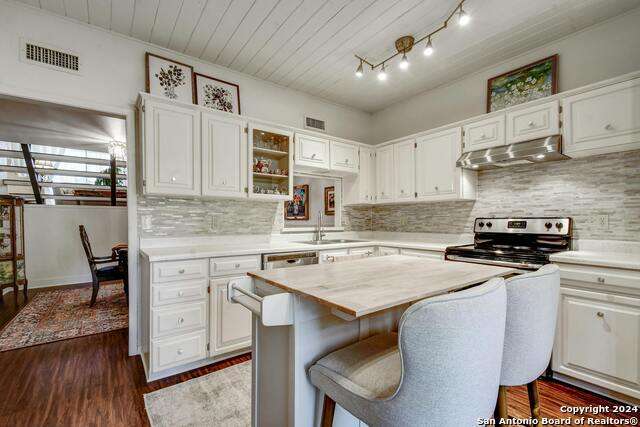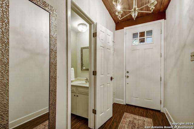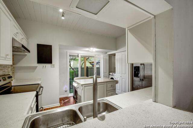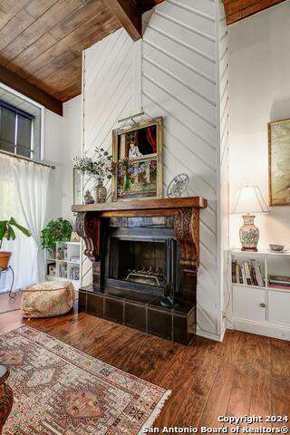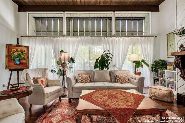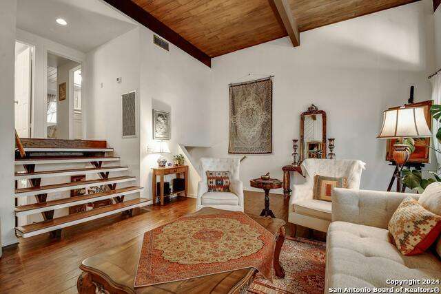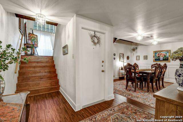 Open House 10/13 3-5 pm. Discover this stunning mid-century modern home, brimming with space and amenities. Enter through a private gated patio or the attached two-car garage. Inside, you'll find soaring 13' ceilings in the main living area, complete with an oversized wood-burning fireplace, ample wall space for art & hanging decor, and abundant natural light. The private kitchen features updated appliances, stylish light fixtures, freshly painted cabinets with new hardware, backsplash, along with access to the first-floor patio. The home boasts beautiful wood paneling accents on the walls & ceilings, two full baths, and a half bath for guests on the first floor. The second floor offers an extended balcony overlooking Pike Road, and the entire residence is carpet-free. Nestled in a tranquil corner of Terrell Heights, it provides quick access to Harry Wurzbach and Austin Hwy. The Woodbridge Condominiums include amenities such as pools, a clubhouse, an enclosed dog park, a koi pond, mature trees, and courts for basketball, pickleball, and tennis, along with exterior maintenance services. Recent upgrades include remodeled modern bathrooms, patio doors, HVAC system updated in May 2024, Roof 7 years old (60 mil GAF Everguard TPO). Enjoy evenings and down time in the multiple outdoor spaces of the home or community, or strolls throughout the neighborhood and nearby shopping & dining. From the red door entrance to the floating steps and wood carved mantle, this home comes to life with unique characters at every turn.