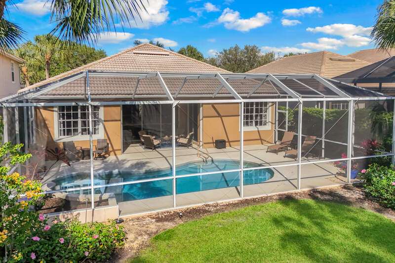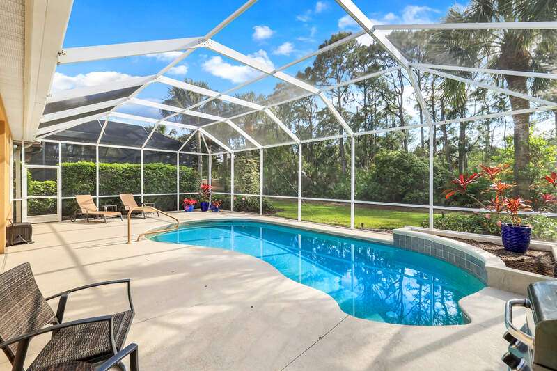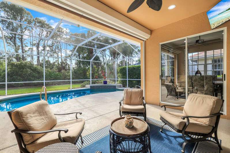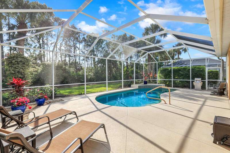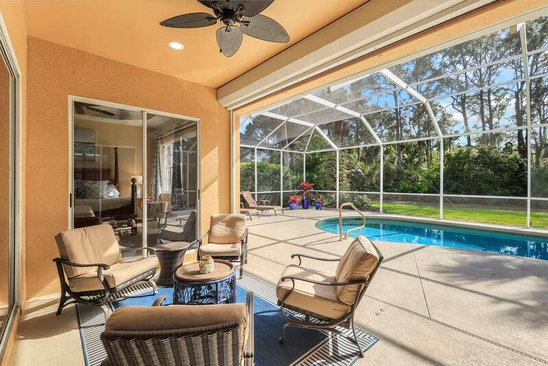 Brand NEW ROOF & NEW AC installed!!! This is THE ONE you've been waiting for! Conveniently located in the desirable Oak Strand neighborhood of Shadow Wood at the Brooks, this rarely available 3 bedroom/2 bathroom Ibis floor plan has been completely reimagined to offer a truly one-of-a-kind living experience. The seamless, open floor plan was created by removing the wall between the kitchen and the great room, making it ideal for entertaining and everyday family life. In the kitchen, granite countertops, stainless steel appliances, upgraded cabinetry and an oversized bar for ample seating, are sure to delight the family chef. Other notable features include an abundance of recessed lighting installed throughout the home, grand 8-foot doors throughout, and striking 18-inch travertine flooring on the diagonal that exude sophistication. The former den has been thoughtfully converted into a third bedroom, complete with a spacious walk-in closet, providing flexibility to suit your lifestyle. Step outside into your own private oasis, where Southern exposure means sun-soaked afternoons by your private pool all season long. Beyond the pool, discover a secluded backyard retreat with lush landscaping and preserve views for maximum privacy. For seasonal owners, an electric hurricane shutter completely encloses the lanai, providing convenience and peace of mind during the summer months. Don't miss the opportunity to make this slice of paradise your own! Shadow Wood Country Club offers private membership with 54 holes of Rees Jones re-designed championship golf, outstanding dining & activities, lighted tennis courts (9) and bocce ball courts (3). Recently approved by the membership, the NEW Lifestyle center will introduce a resort style pool, 6 indoor air-conditioned pickle ball courts, 8 new tennis courts with stadium style seating (replacing the existing courts), a new outdoor covered pool side restaurant and new tennis/racquet shop all located in the central clubhouse area creating a complete resort area of fun. Also available within the Brooks complex is the Commons Club, a private membership only entity with lakeside restaurant, outstanding state of the art Fitness Center, Enrichment Center, Beach Club and more!