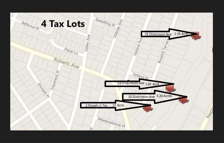 Welcome to Dickinson's Gardens! A hidden away, 7-acre parcel of land! There are currently 4 large tax lots in this sale and they may be subdivided into 5000 SF building lots for single family houses. 3 lots on Dickinson Ave and one lot located at 2 Rose Hill Ter. Dickinson Ave is mostly an unimproved St and once developed, it can be opened up, going through to Lewis St. On Lewis you will see curbing as to where the street will open. The zoning is S50, which means, min. requirements are 50 frontage and 5000 SF per lot. Engineer has proposed that 47 building lots can be established, as of right. Seller offers no guarantees. Subdivide as you see fit. Great opportunity to build a new development in Yonkers. Possible Townhouse Development, cluster housing, with applications to the Yonkers Planning Board. Area is close to Saw Mill Pkwy, St John's Hospital, New Boyce Thompson Center and Untermeyer Park and Gardens. Survey and sewer maps are available. Sewers at each end of Dickinson Ave. No subdivision process has been started. Owner financing might be available for qualified persons with 1 mil down payment. They aren't making any more land, don't miss your chance!