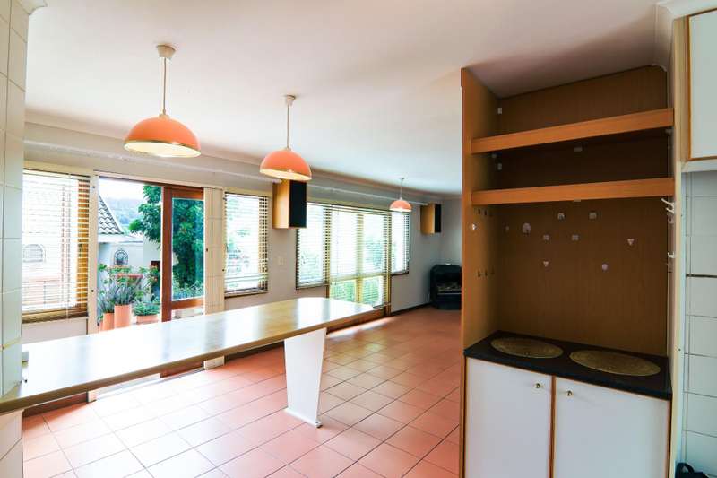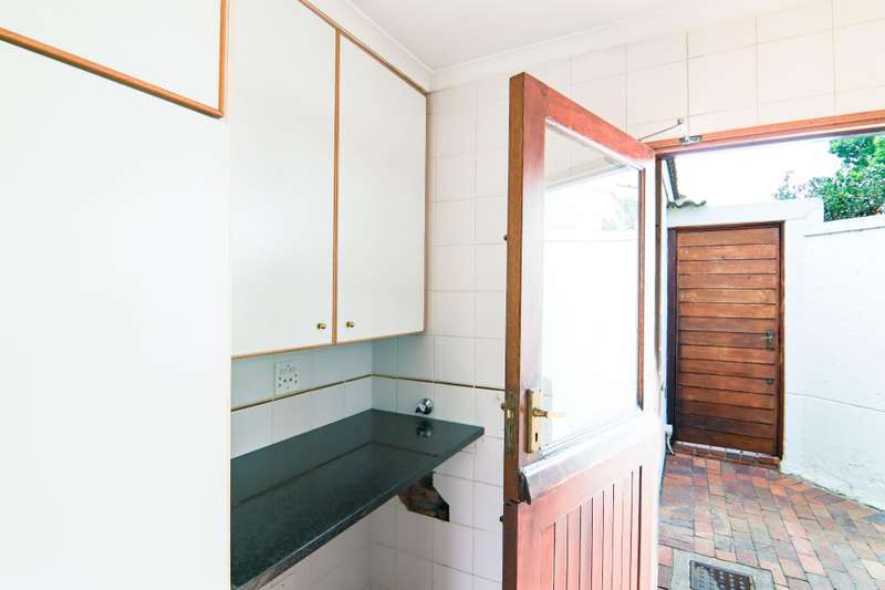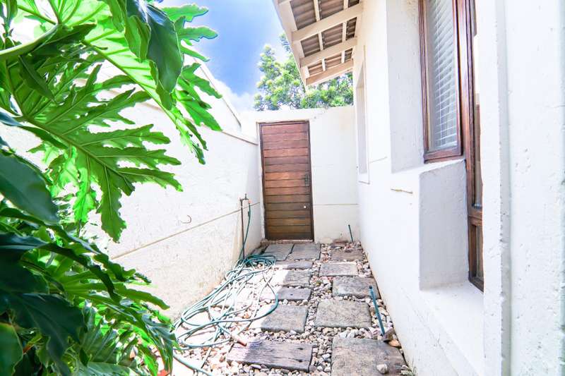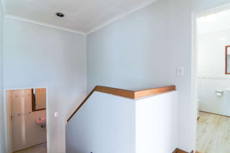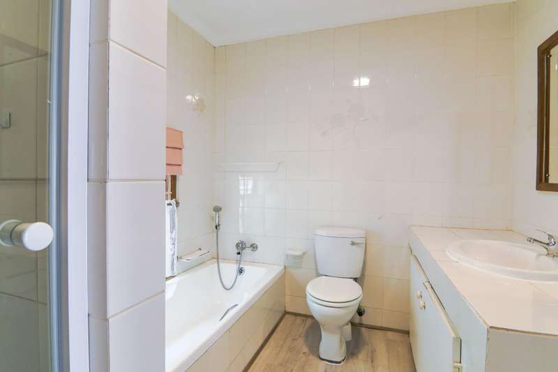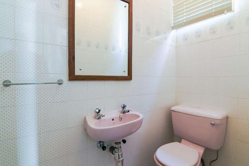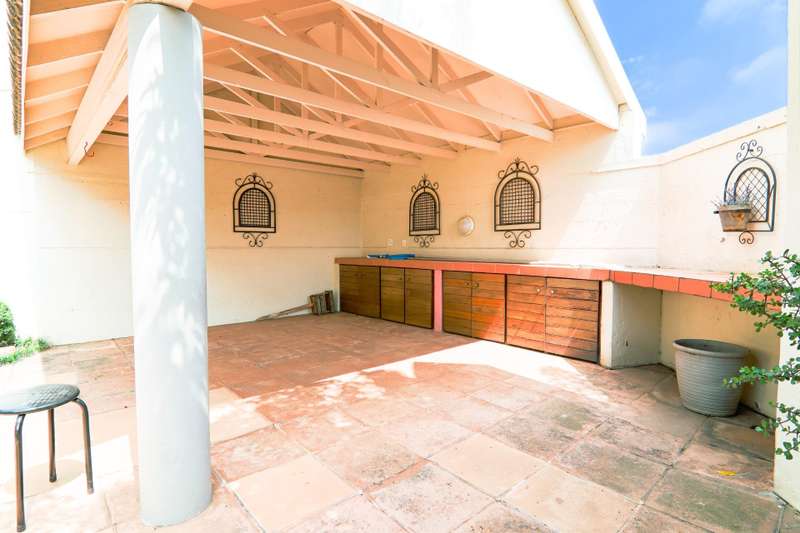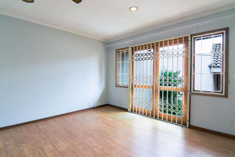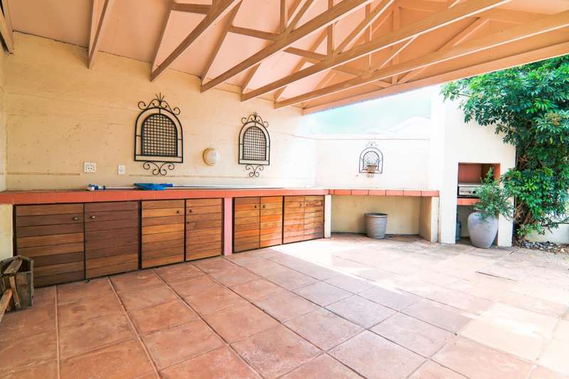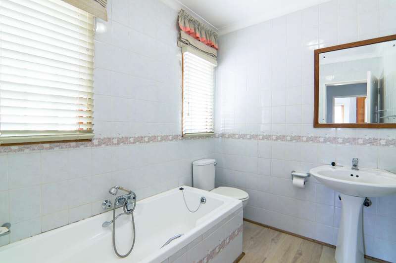 You will find the main bedroom and bathroom at the end of the house on the ground level adjacent to the living rooms. The lovely spacious and sunny North facing bedroom has laminated flooring, a shoe cabinet,built-in cupboards and a separate linen cupboard. The full en-suite bathroom with a shower, bath, single vanity and toilet. Doors fitted with security gates leads from the the bedroom to the pool and entertainment area. Much thought was put into the layout of this home.
