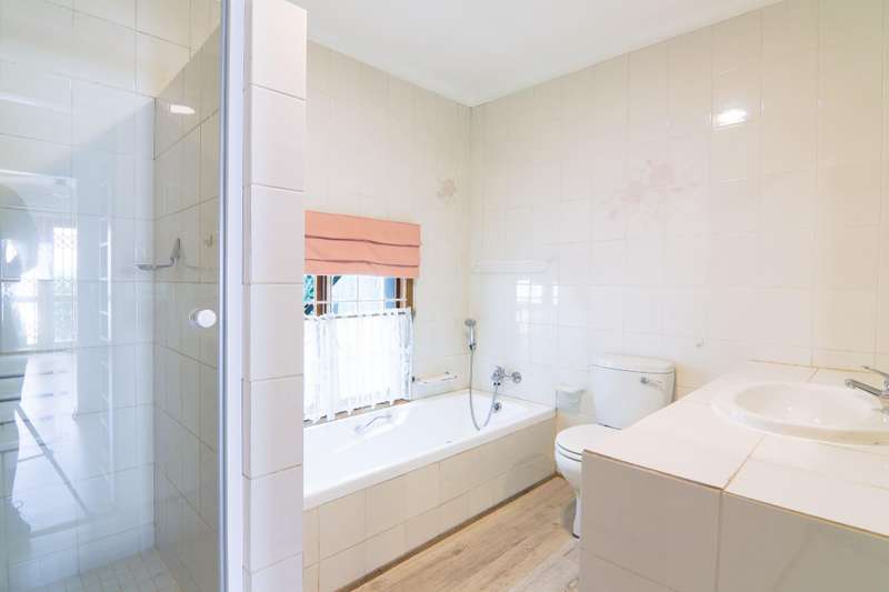 The fourth upstairs bedroom has an air-conditioning unit, built-in cupboards, blinds and carpets and has it's own ensuite bathroom comprising of a bath, basin and toilet.