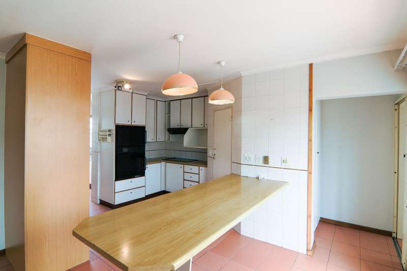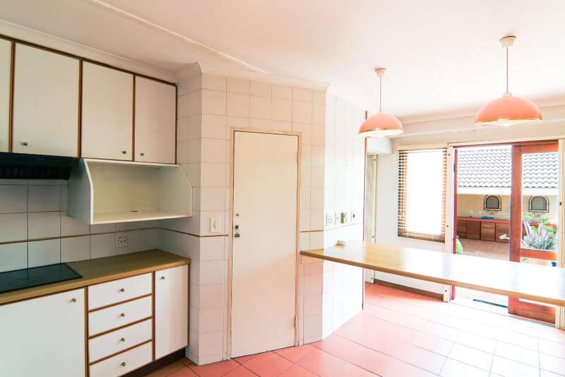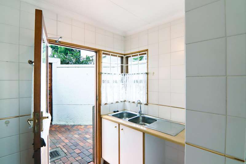The delightful kitchen with a central breakfast nook, a pantry and a generous amount of cupboard space and countertops, and can eye level double door oven and a warming oven, glass top hob and extractor fan. The kitchen and scullery has enough space for at least 3 more appliances and can host a double door fridge as well. There's an access door leading out from the scullery to the enclosed private courtyard with a bespoke tiny garden bed complete with a cat ramp.