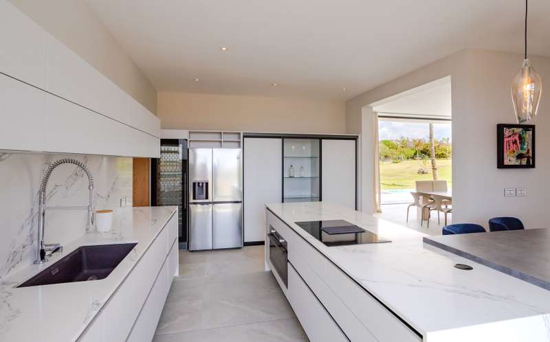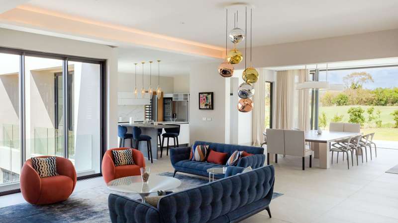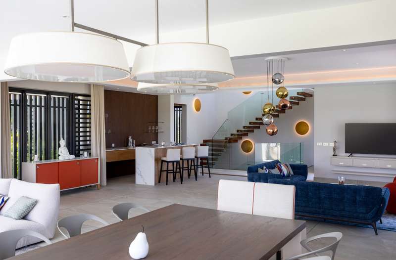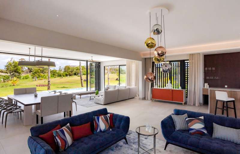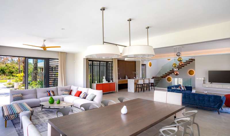 Located between holes 13 & 14, this exquisite 5-bedroom golf villa offers unparalleled luxury and breathtaking views. Set within a vast 2,000m² plot, the villa spans 730m² of living space over three beautifully designed floors. With its prime position overlooking the prestigious Ernie Els Golf Course, this property is a true masterpiece of architectural and interior design. The first floor features an expansive open-plan living area with a spacious TV lounge, a bar, a dining room, and a fully-equipped kitchen, complete with a back kitchen for added convenience. Premium finishes are evident throughout, with tiles imported from Italy and Spain, as well as luxurious fabric furnishings from France. Every room is uniquely designed and individually decorated, creating a one-of-a-kind living experience. On the third floor, in addition to the bedrooms, a large outdoor terrace offers panoramic views of the surrounding golf course, making it the perfect space for outdoor dining, relaxation, or entertaining guests. While the villa’s stunning artwork is not included in the price, it is available for separate purchase. As a resident of this villa, you will enjoy exclusive access to the 5-star facilities and services of Anahita, including fine dining, a world-class spa, fitness center, and recreational amenities. Additionally, upon purchase, you will receive permanent residency, ensuring a seamless transition to life in paradise. This exceptional property is ideal for those seeking privacy, luxury, and a unique lifestyle on one of the most renowned golf courses in the region.