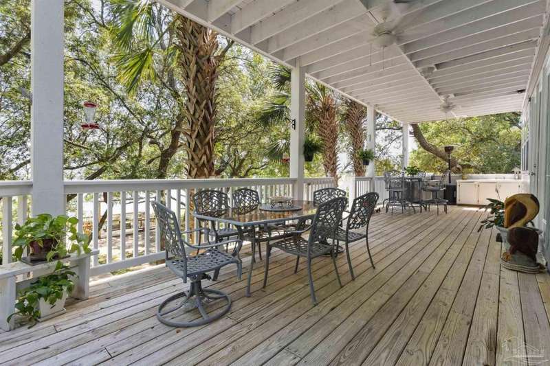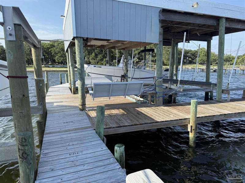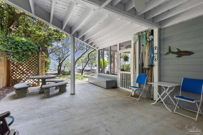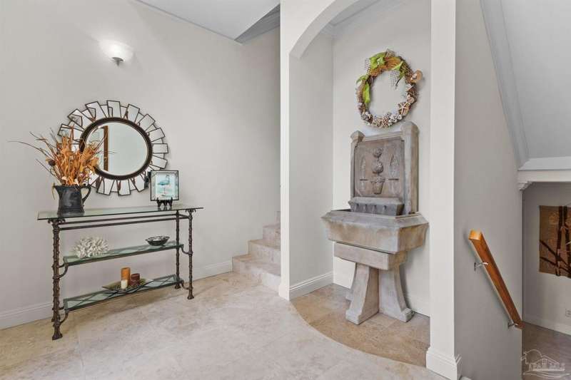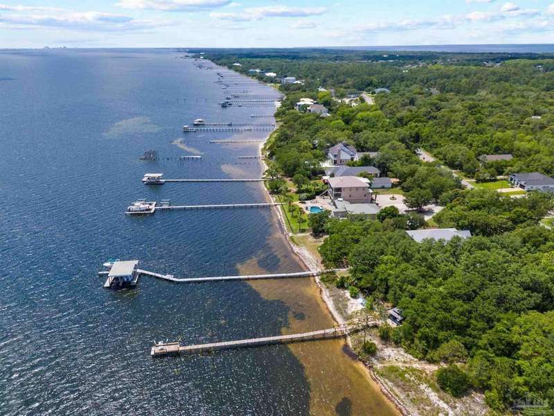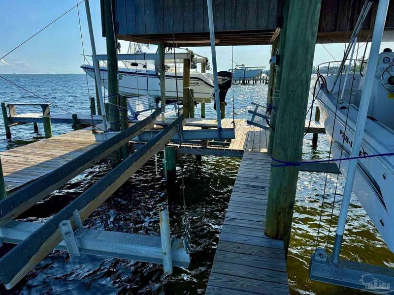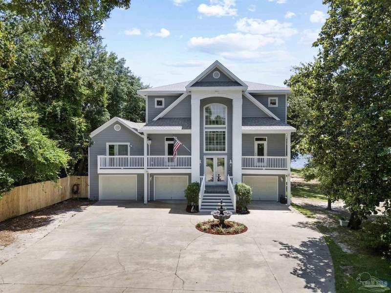 WATERFRONT PARADISE WITH PANORAMIC VIEWS - Discover the ultimate in coastal living in this masterfully crafted waterfront home offering exclusive Santa Rosa Sound frontage and sweeping vistas of the protected National Seashore. Built with extraordinary structural strength-metal-reinforced concrete block, steel beams, and impact-rated storm glass. Framed by oak and palm trees, a private white sand beach, protective seawall, and dock with boathouse, 3 heavy capacity lifts, and swings for fishing, wildlife-watching, or sunset lounging. Outdoor showers-2 dock+H/C at house. A public boat launch is just a block away. Multiple covered expansive porches across all levels create effortless outdoor living spaces. Spanning three levels with elevator access, the layout is designed for versatility. The ground floor offers a party room - counter space, sink, refrigerator and half bath-perfect for entertaining. The 4-car+ U-shaped garage features multi entry points, an additional storage garage, and a large central storage room The second floor centers around an open living/dining area adorned with custom wood trim, a private bar with sink, wine chiller, and tapped fridge. The kitchen includes a new gas cooktop, stainless appliances, silestone counters, dining bar, solid wood cabinetry, prep island with sink, and a desk nook. A spacious laundry room with sink, freezer space, storage, and desk sits nearby. A private guest apartment 'The Treehouse' with full kitchen, bedroom, bath, and living space is perfect for multi-generational living or guests. The third floor opens to a gracious foyer and hosts three bedrooms, including a spacious primary suite w/ AM bar, dual walk-in closets, heated jetted tub, separate shower, and double vanities. Two additional bedrooms share a Jack-and-Jill bath. New roof (2025), HVAC (2022), and fresh interior/exterior paint. Zoned for A-rated Gulf Breeze schools, including the future Soundside High. Minutes from Pensacola Bch, Navarre Bch and Downtown.