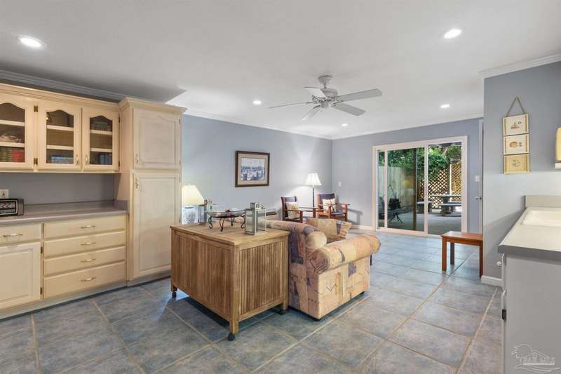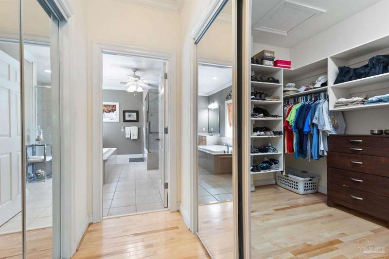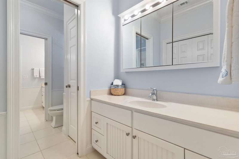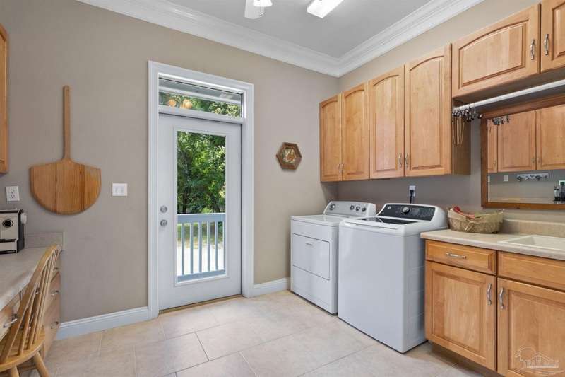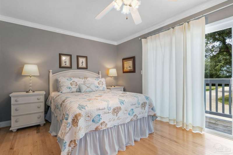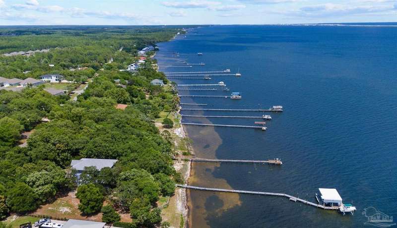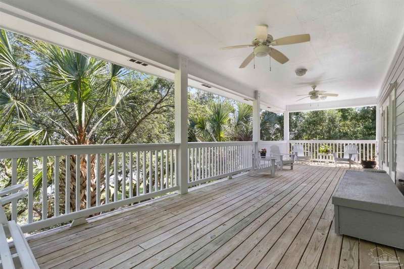 WATERFRONT PARADISE WITH PANORAMIC VIEWS - Discover the ultimate in coastal living in this masterfully crafted waterfront home offering exclusive Santa Rosa Sound frontage and sweeping vistas of the protected National Seashore. Built with extraordinary structural strength-metal-reinforced concrete block, steel beams, and impact-rated storm glass. Framed by oak and palm trees, a private white sand beach, protective seawall, and dock with boathouse, 3 heavy capacity lifts, and swings for fishing, wildlife-watching, or sunset lounging. Outdoor showers-2 dock+H/C at house. A public boat launch is just a block away. Multiple covered expansive porches across all levels create effortless outdoor living spaces. Spanning three levels with elevator access, the layout is designed for versatility. The ground floor offers a party room - counter space, sink, refrigerator and half bath-perfect for entertaining. The 4-car+ U-shaped garage features multi entry points, an additional storage garage, and a large central storage room The second floor centers around an open living/dining area adorned with custom wood trim, a private bar with sink, wine chiller, and tapped fridge. The kitchen includes a new gas cooktop, stainless appliances, silestone counters, dining bar, solid wood cabinetry, prep island with sink, and a desk nook. A spacious laundry room with sink, freezer space, storage, and desk sits nearby. A private guest apartment 'The Treehouse' with full kitchen, bedroom, bath, and living space is perfect for multi-generational living or guests. The third floor opens to a gracious foyer and hosts three bedrooms, including a spacious primary suite w/ AM bar, dual walk-in closets, heated jetted tub, separate shower, and double vanities. Two additional bedrooms share a Jack-and-Jill bath. New roof (2025), HVAC (2022), and fresh interior/exterior paint. Zoned for A-rated Gulf Breeze schools, including the future Soundside High. Minutes from Pensacola Bch, Navarre Bch and Downtown.