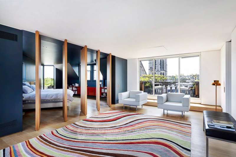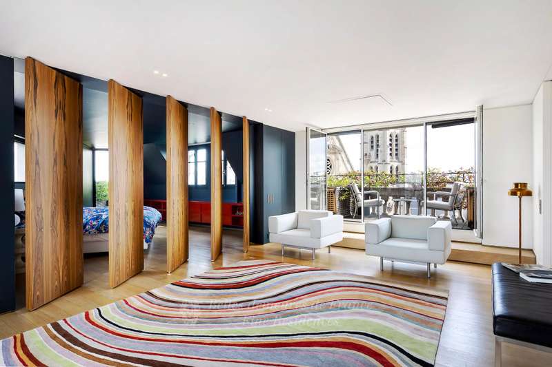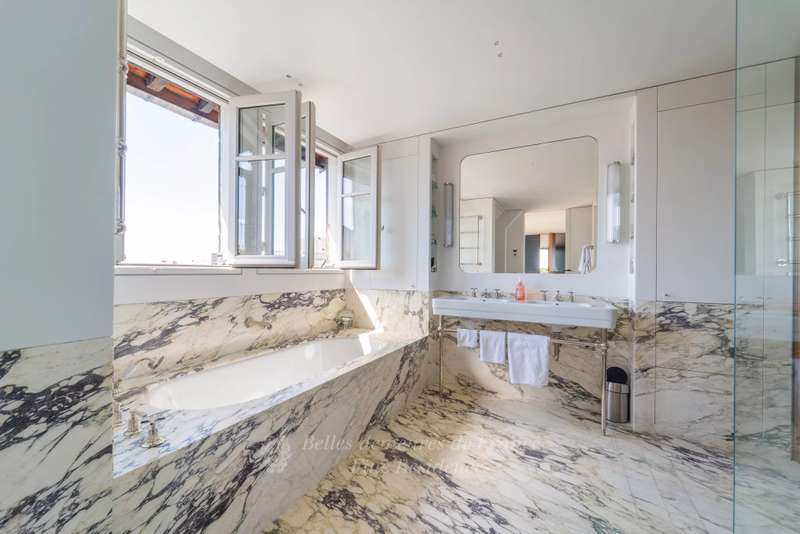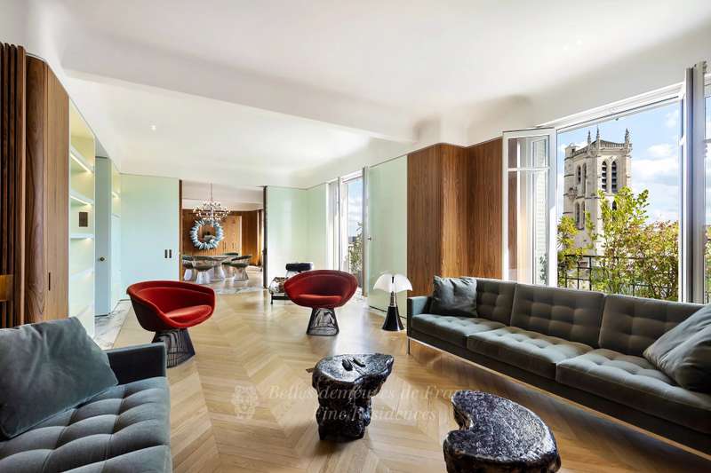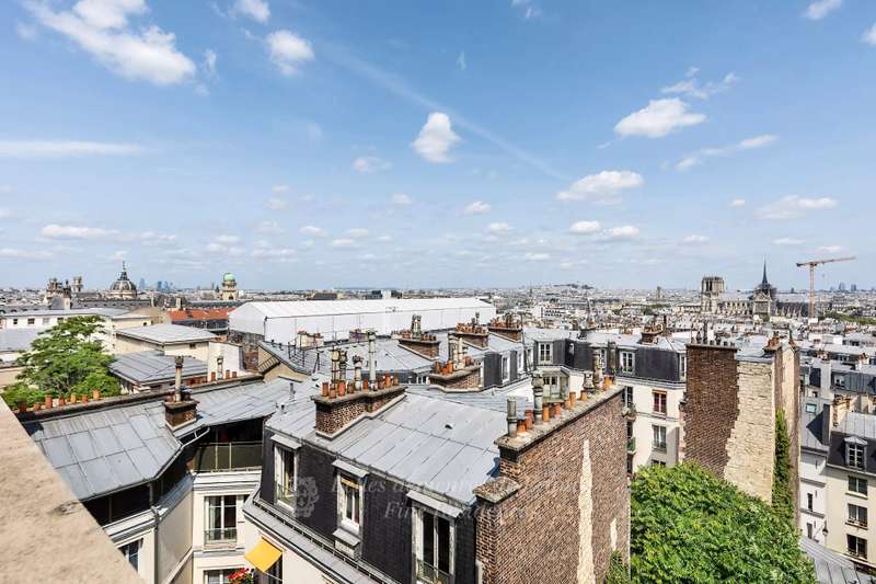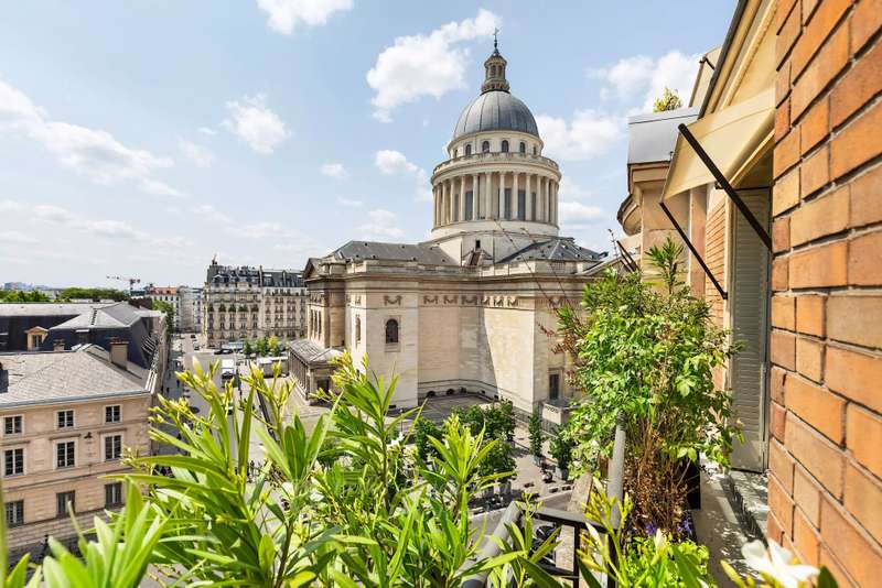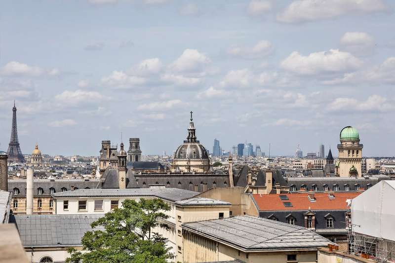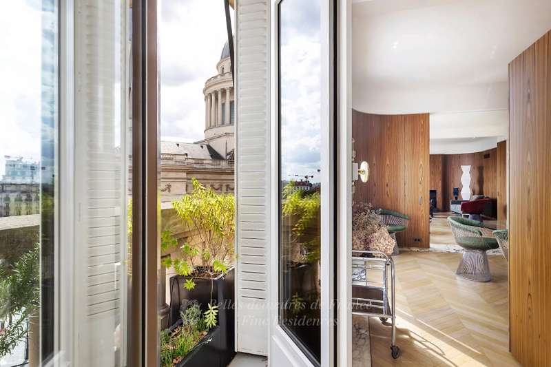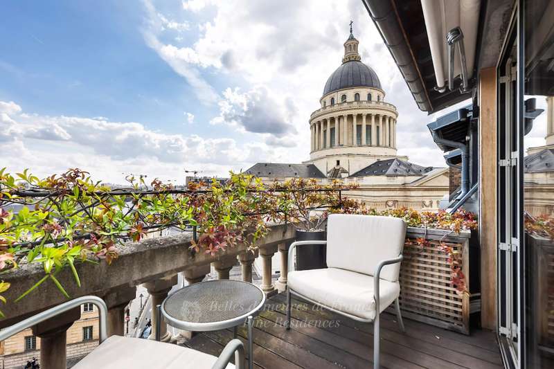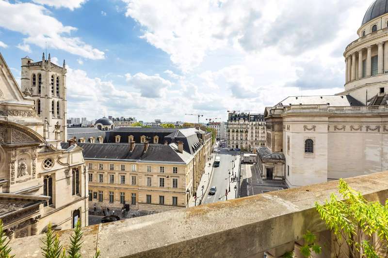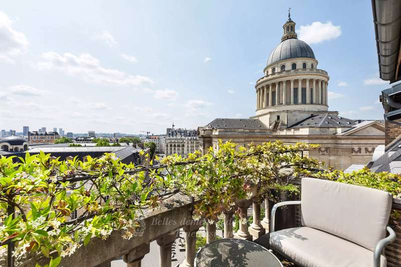 This magnificent 230 sqm apartment on the top floors of a luxurious late 1920s building includes a particularly sunny living/reception room opening onto balconies and commanding stunning views of Place du Pantheon and the church, a kitchen with dining facilities, two bedrooms with bathrooms, and a study. The upper floor boasts breathtaking views of the capital and its landmarks, and comprises a master bedroom opening onto two terraces, and a study/home cinema. A parking space nearby is available for purchase or rental. Henri IV catchment area.