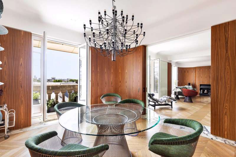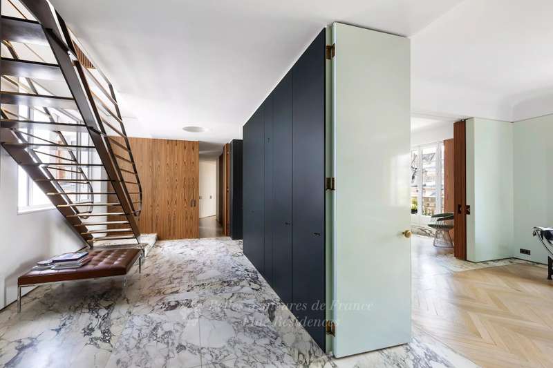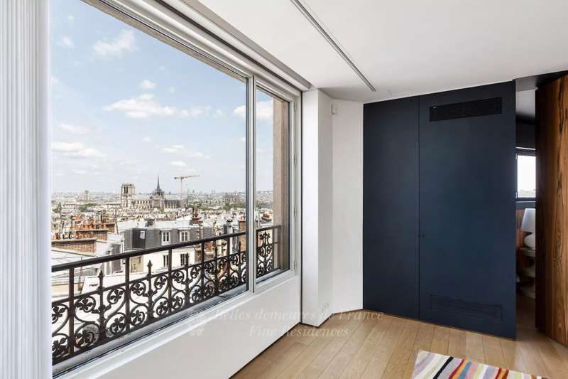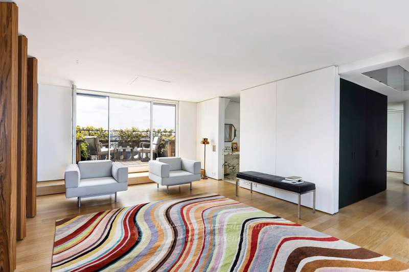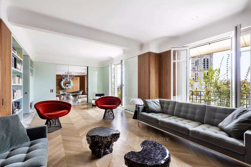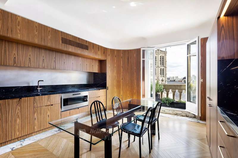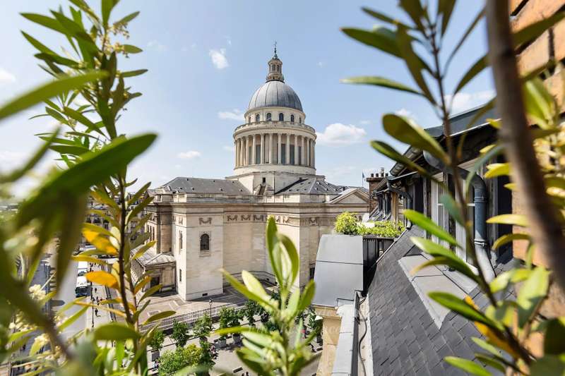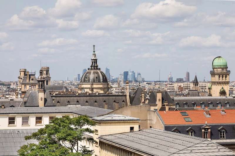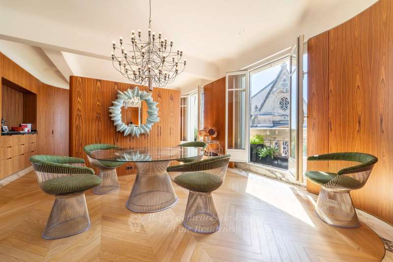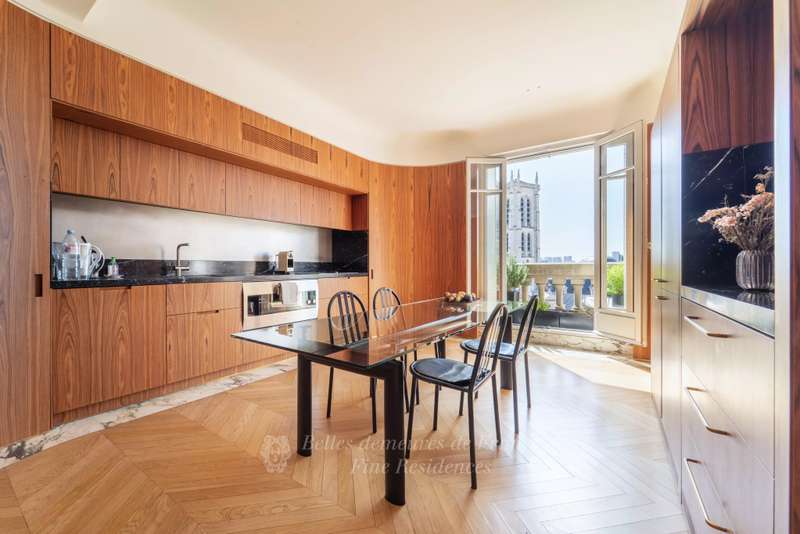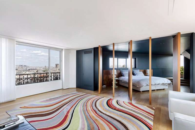 This magnificent 230 sqm apartment on the top floors of a luxurious late 1920s building includes a particularly sunny living/reception room opening onto balconies and commanding stunning views of Place du Pantheon and the church, a kitchen with dining facilities, two bedrooms with bathrooms, and a study. The upper floor boasts breathtaking views of the capital and its landmarks, and comprises a master bedroom opening onto two terraces, and a study/home cinema. A parking space nearby is available for purchase or rental. Henri IV catchment area.