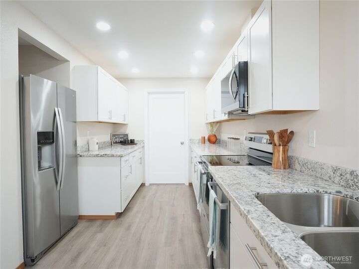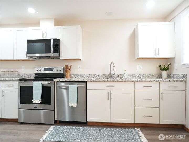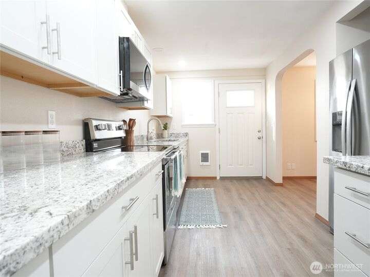 Check out this fully remodeled and updated Mt View home within walking distance to everything! No expense was spared updating any portion of this two bedroom, 1.5 bath one-level. A new kitchen boasting stainless steel appliances and solid surface counters graces the home, and a separate dining area separates the kitchen from the living area features classic arched doorway openings. Both baths are new as well as all flooring, doors and trim throughout. The main bath features a tiled shower/ tub combo and the 2nd bath includes ample room for a washer and dryer. Outside there is a fully fenced backyard with a 10 x 12 storage building, and a 20 x 26 detached garage w/ attic storage above and a carport attached. Hurry, this jewel wont last long!