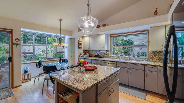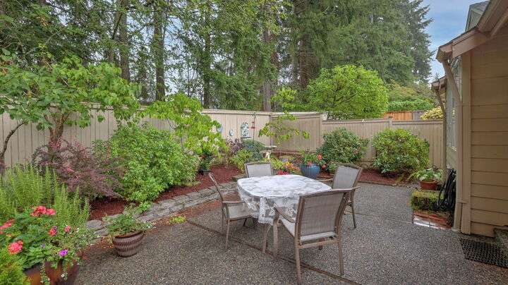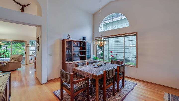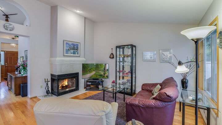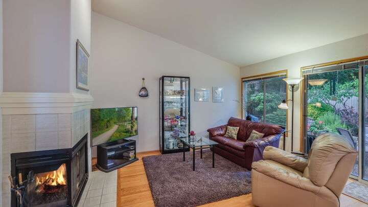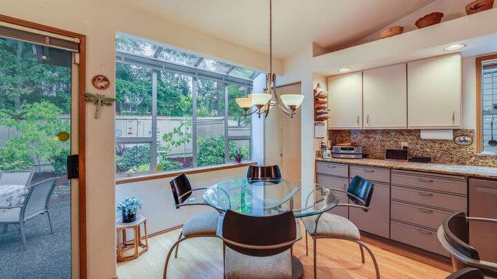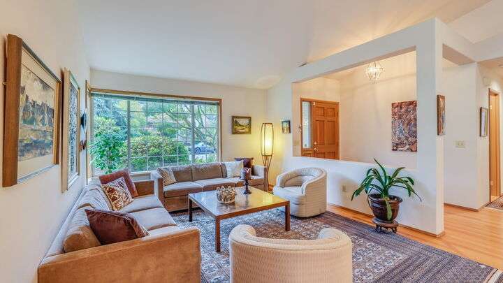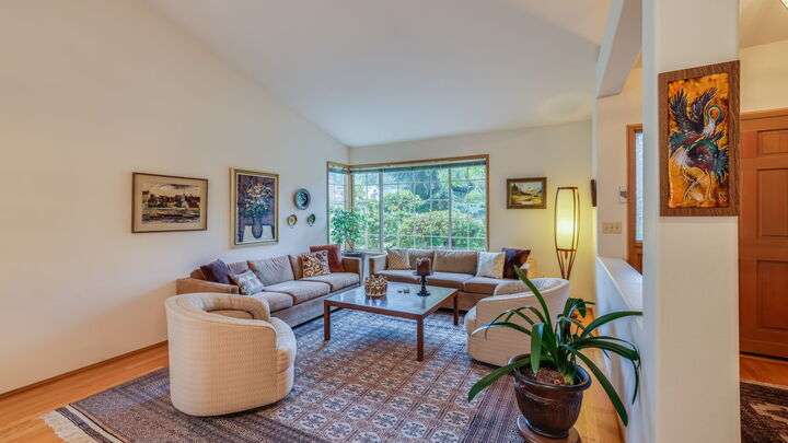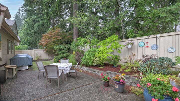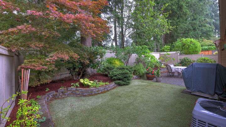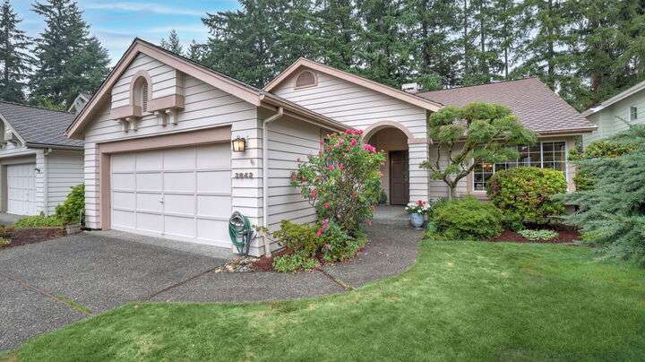 Sought after single level home in Klahanie is walking distance to Klahanie's tremendous amenities. Hardwood floors through much of the home. Vaulted ceilings & large windows in the living room & dining room. Nicely updated kitchen is open & airy & offers hardwood floors, granite counter tops, garden window, pantry, center island & eating nook. The family room has a tall ceiling & gas log FP. Spacious primary bedroom w/vaulted ceiling and primary bath with hardwood floors, granite counter tops, tall ceiling & mirrored clst.. 2 addtl bedrooms & updated full hall bath. The sunny backyard is mostly fenced. The patio is large, and the backyard grass is synthetic. Features include a new furnace (Jan 2025), new A/C (Sept 2021), and Leaf Guard sys