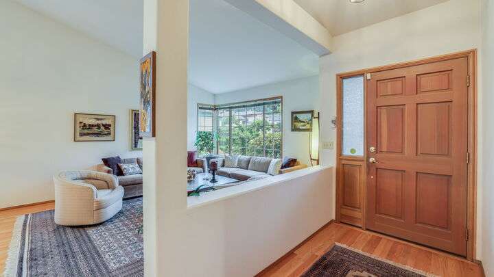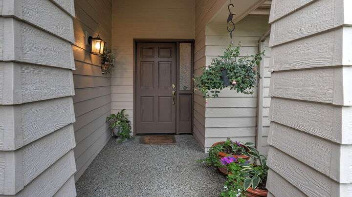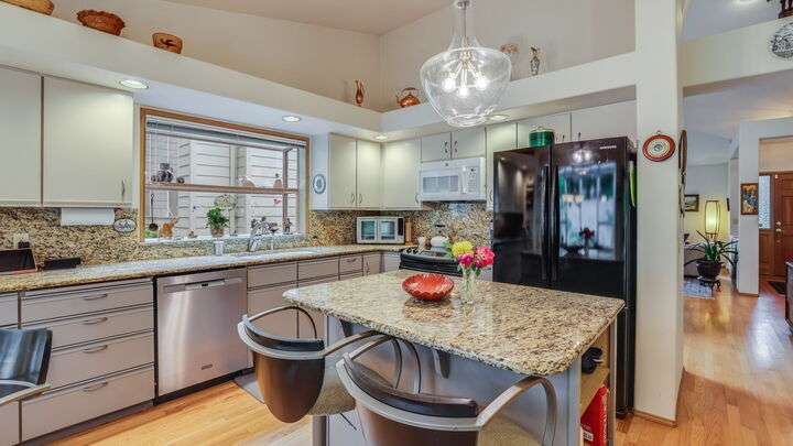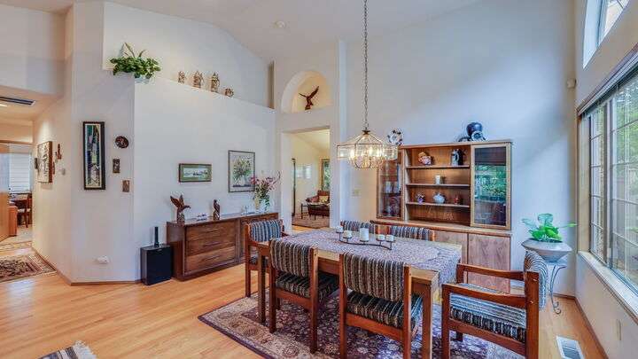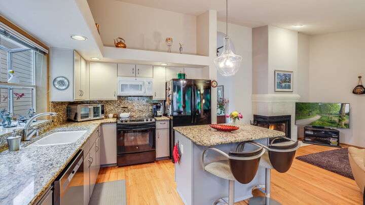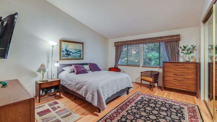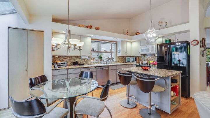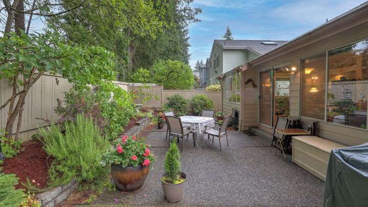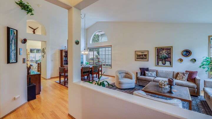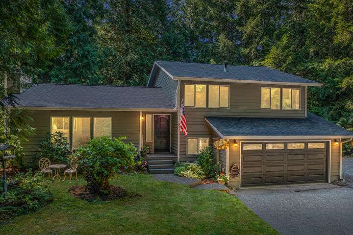 Sought after single level home in Klahanie is walking distance to Klahanie's tremendous amenities. Hardwood floors through much of the home. Vaulted ceilings & large windows in the living room & dining room. Nicely updated kitchen is open & airy & offers hardwood floors, granite counter tops, garden window, pantry, center island & eating nook. The family room has a tall ceiling & gas log FP. Spacious primary bedroom w/vaulted ceiling and primary bath with hardwood floors, granite counter tops, tall ceiling & mirrored clst.. 2 addtl bedrooms & updated full hall bath. The sunny backyard is mostly fenced. The patio is large, and the backyard grass is synthetic. Features include a new furnace (Jan 2025), new A/C (Sept 2021), and Leaf Guard sys