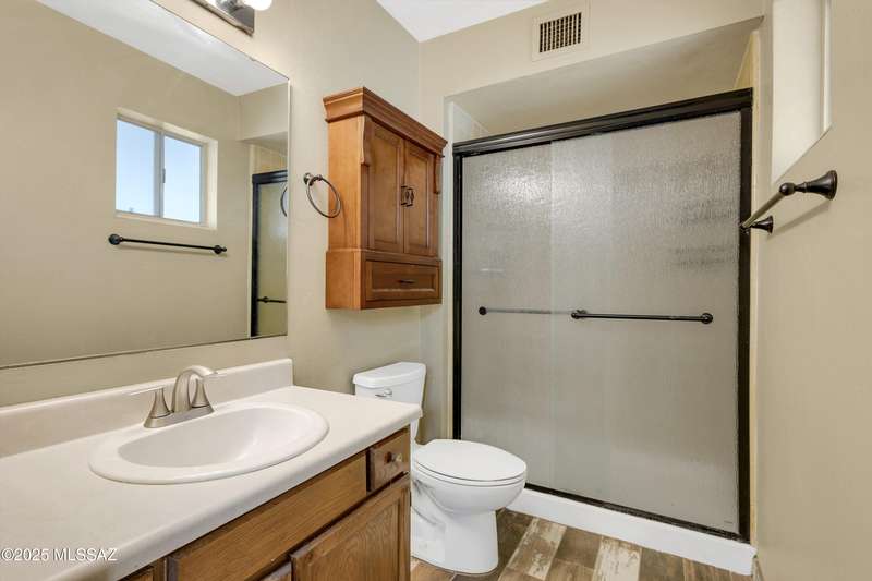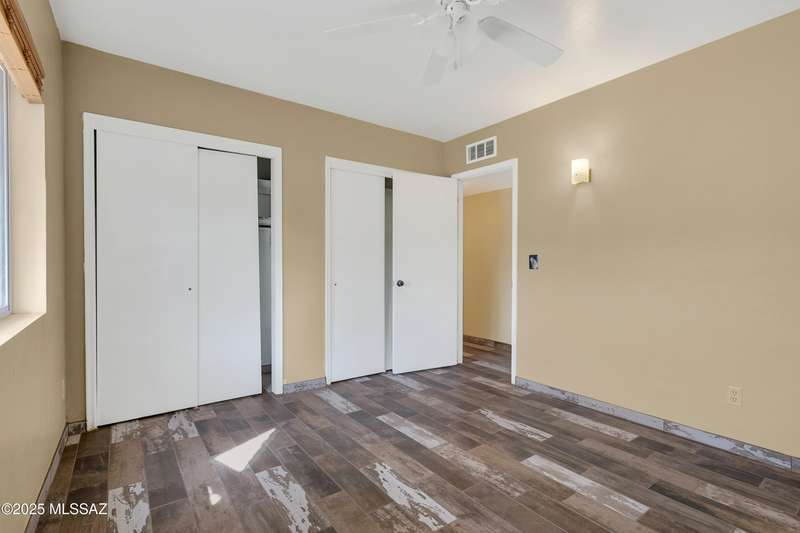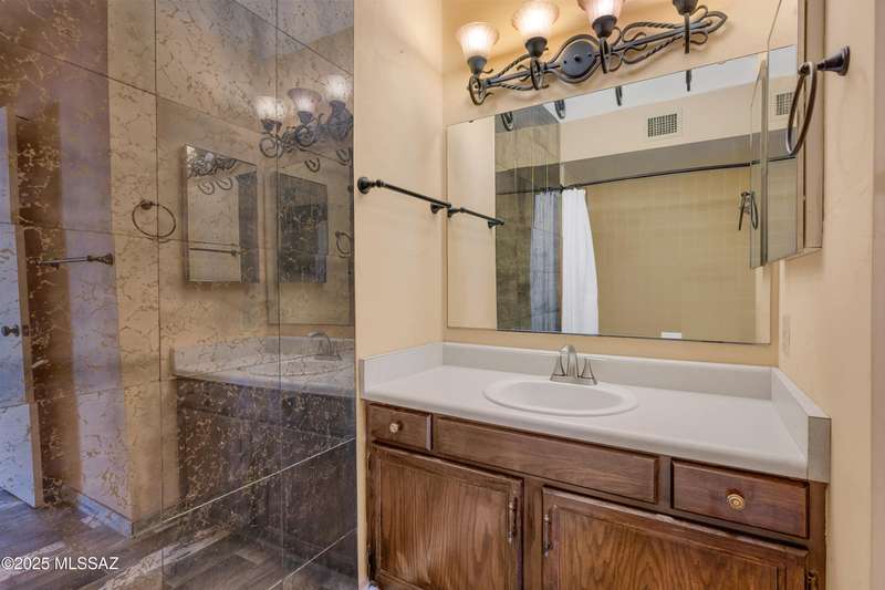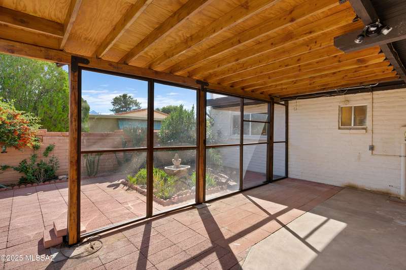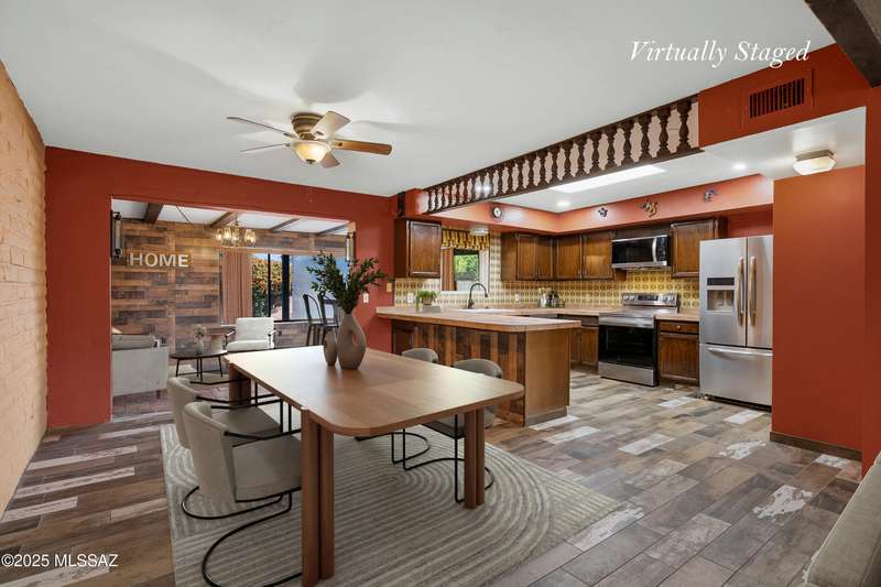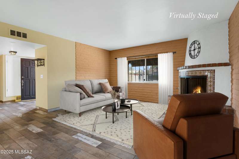 Welcome to this beautifully remodeled Territorial-style 2-bedroom, 2-bath home-an exceptional blend of Southwest charm, modern updates, and low-maintenance living. Immaculately maintained and thoughtfully enhanced, this residence offers and inviting ambiance from the moment you arrive. Step inside to discover all-new ceramic tile plank flooring flowing seamlessly throughout the home-no carpeting anywhere, making upkeep effortless and ideal for desert living. The spacious living room is anchored by a cozy Southwest beehive fireplace, creating a warm and welcoming focal point. Abundant natural light pours in through multiple skylights, highlighting the home's open, airy design and enhancing its bright and cheerful atmosphere. This property offers two main living areas, perfect for flexible