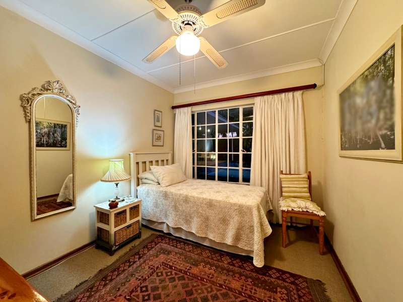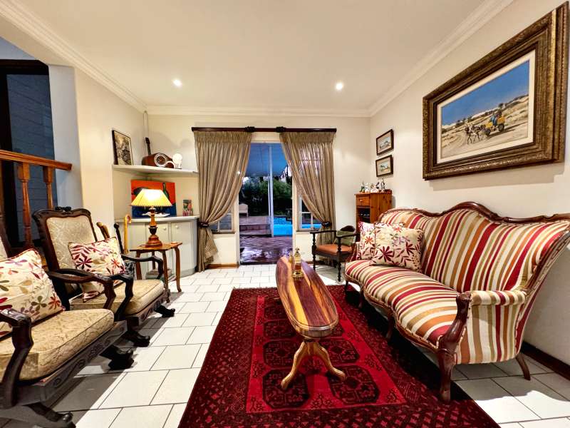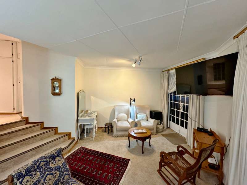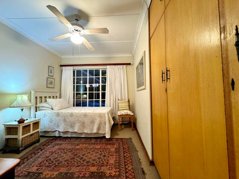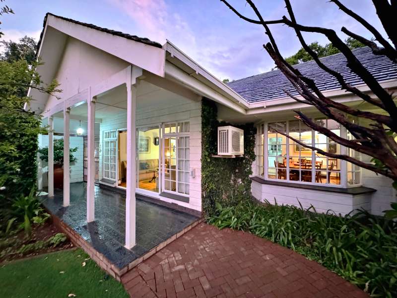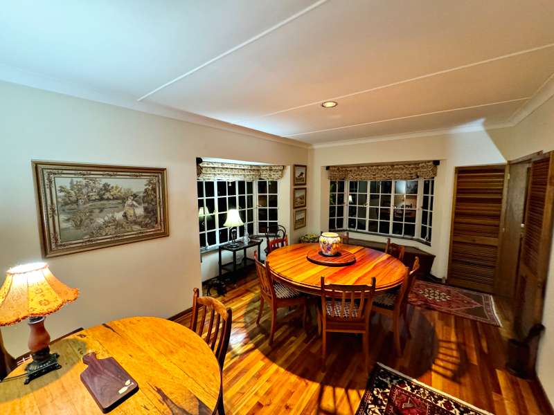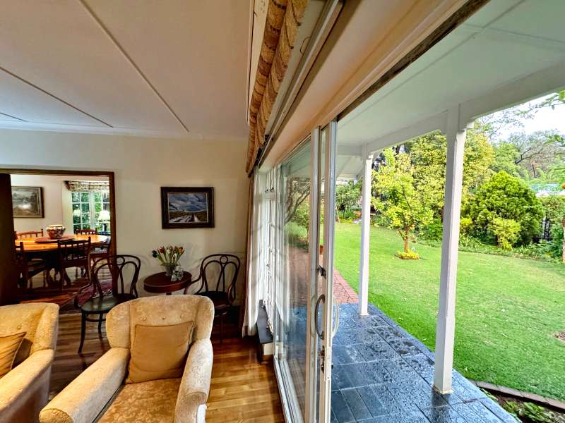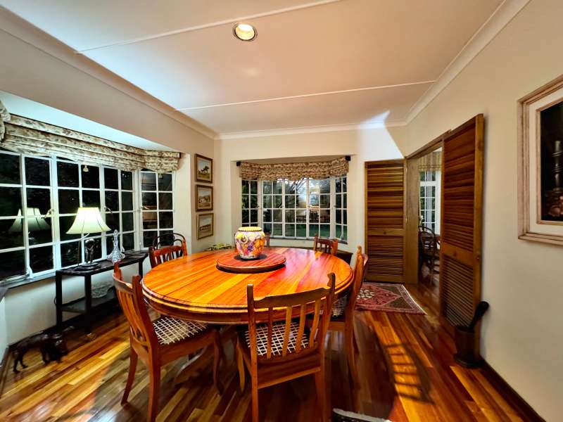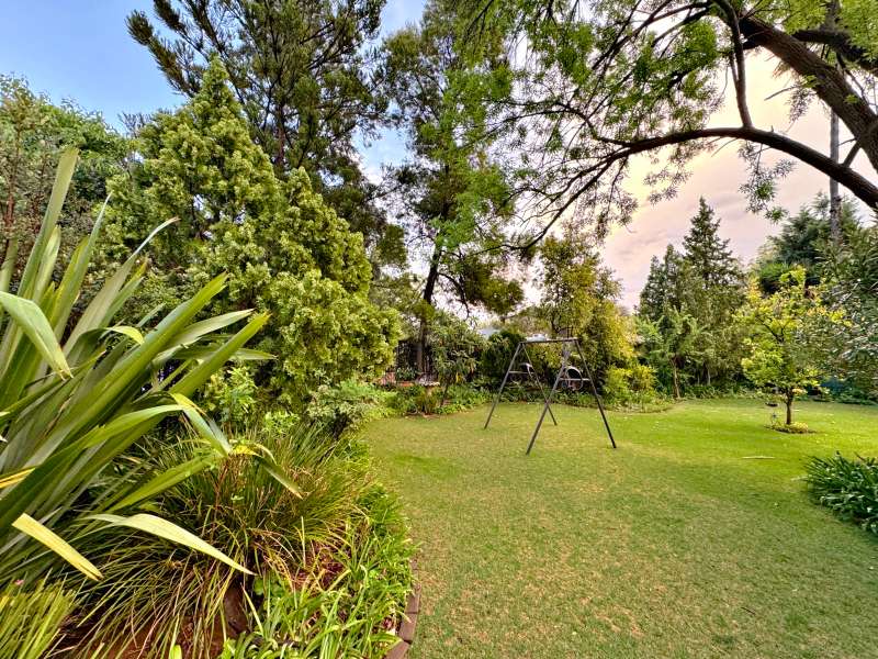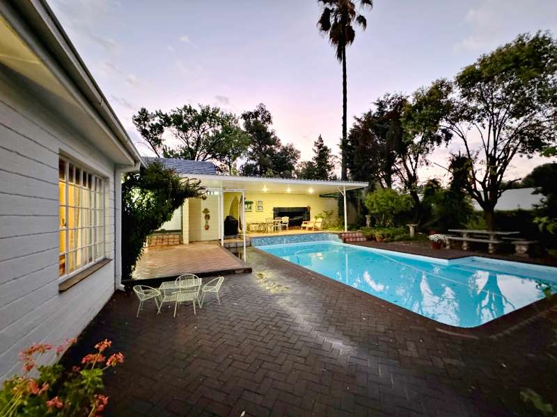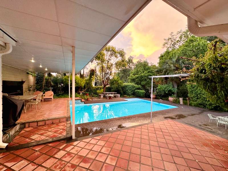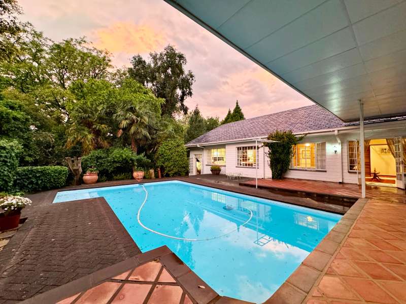 Nestled in a peaceful crescent, this impeccably maintained property with its classic slate roof and lush, tree-filled garden offers the perfect blend of comfort and tranquility. The welcoming entrance hall leads into a spacious lounge area with built-in fireplace and wooden floors, adjacent to the dining room with bay windows overlooking the lushes garden. The TV room flows seamlessly onto an undercover patio with a built-in braai next to the sparkling swimming pool, ideal for entertaining. A formal study with built-in cupboards is ideal for working from home. The well-appointed kitchen with breakfast nook, boasts an eye-level oven, pantry storage and a convenient scullery, with an additional outside laundry area for practicality. The main bedroom is a private retreat with a walk-in closet, en-suite bathroom and direct access to the patio, pool and garden. The other 3 bedrooms share two and a half bathrooms. Additional features include a double garage, double covered parking, domestic quarters, pre-paid electricity, municipal water, a well equipped with a pump for irrigation purposes and a back-up water tank as well as an alarm system for peace of mind. This exceptional home is perfect for those seeking a quiet yet luxurious lifestyle surrounded by nature.