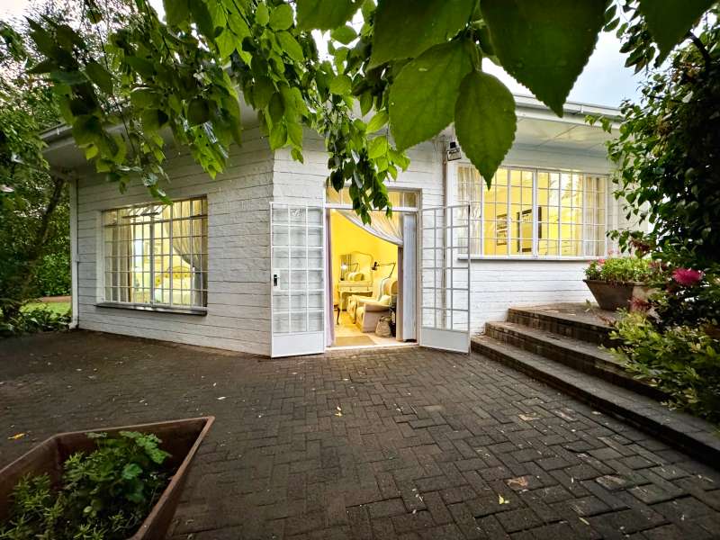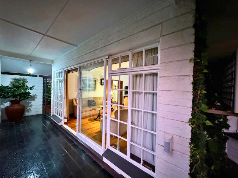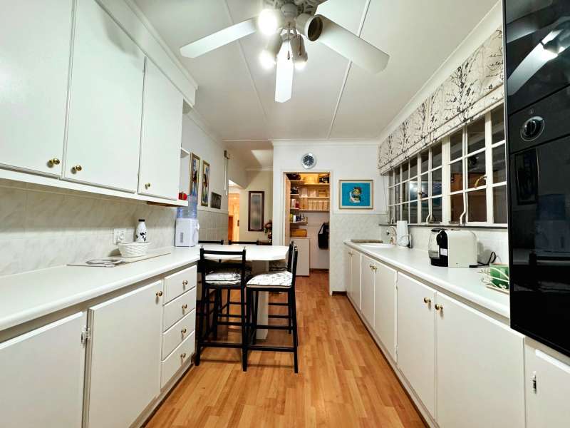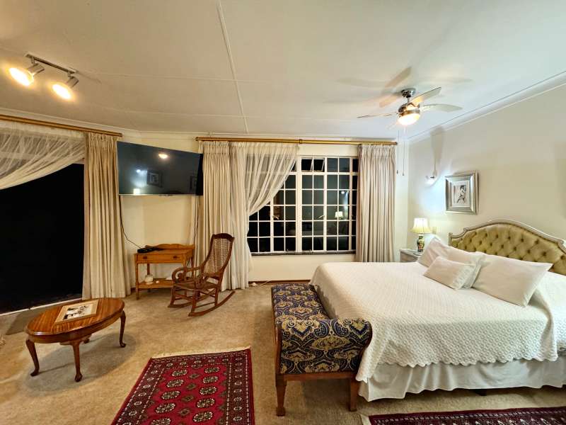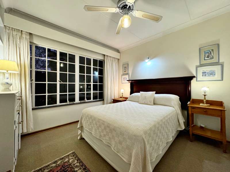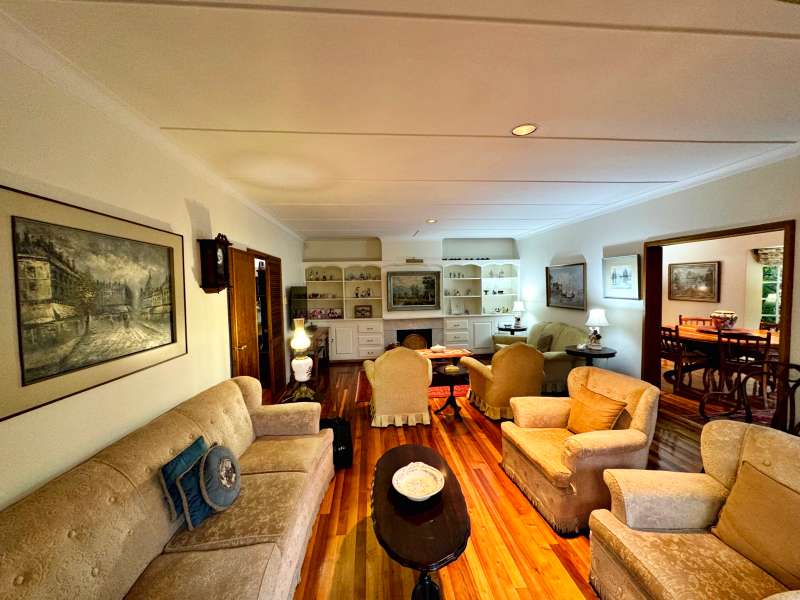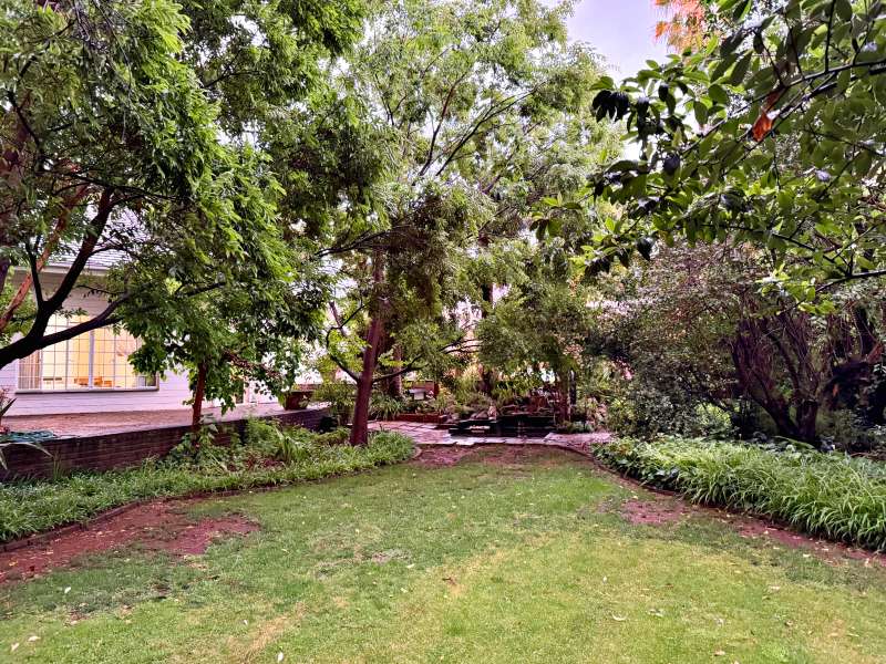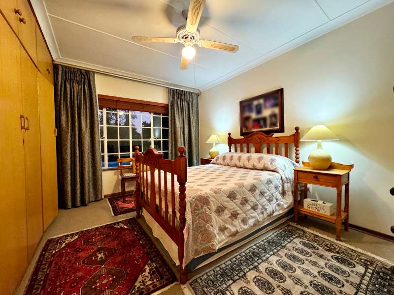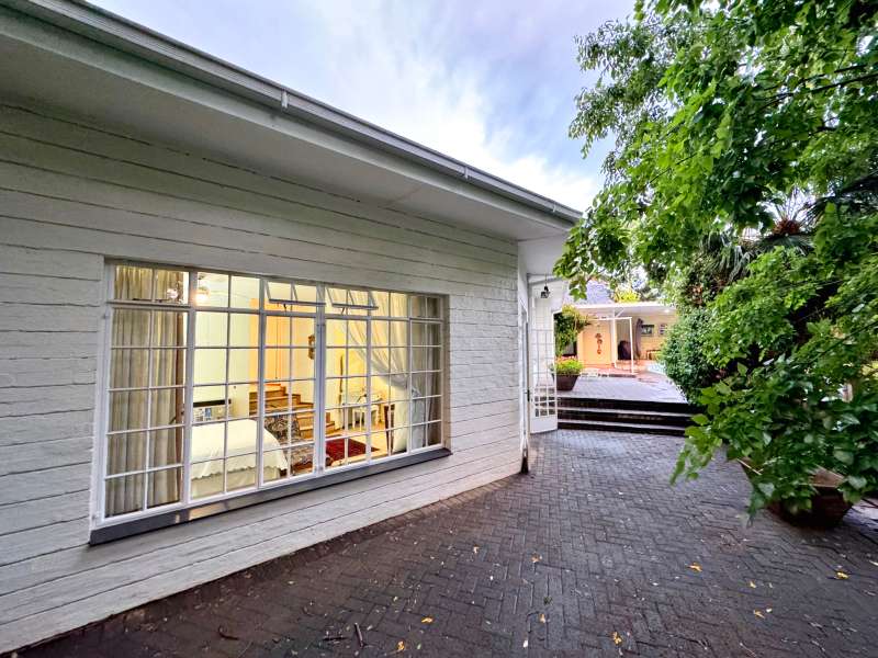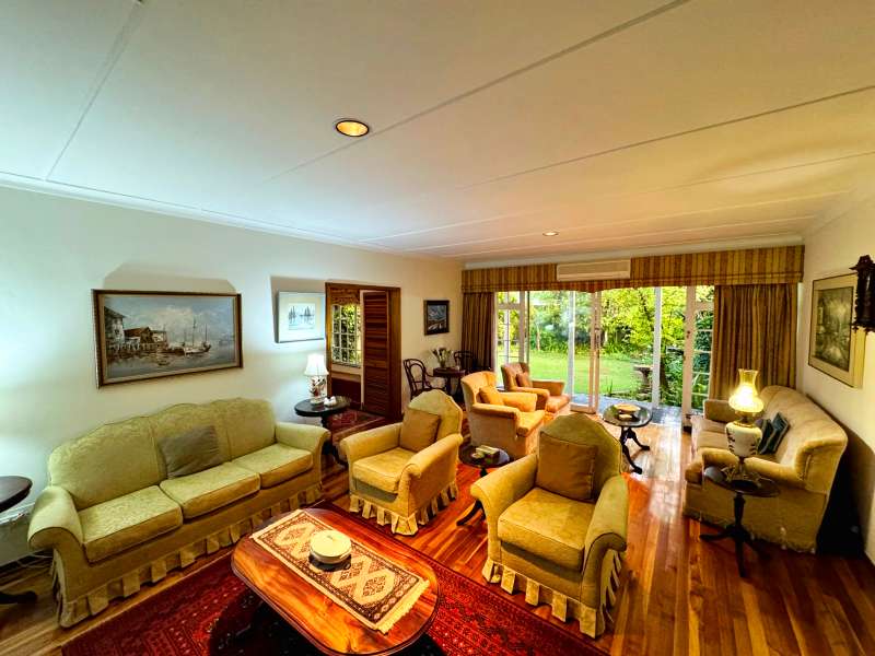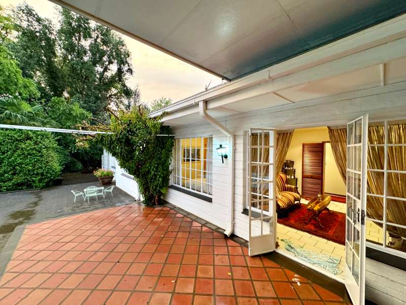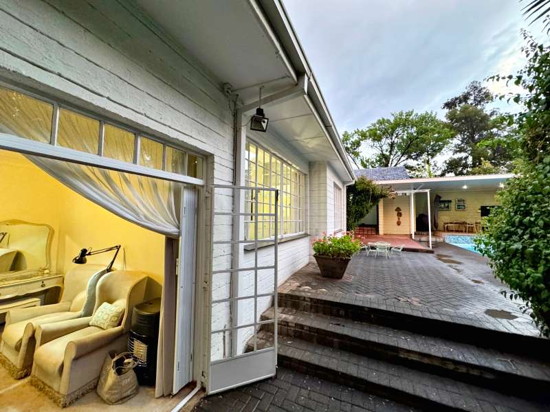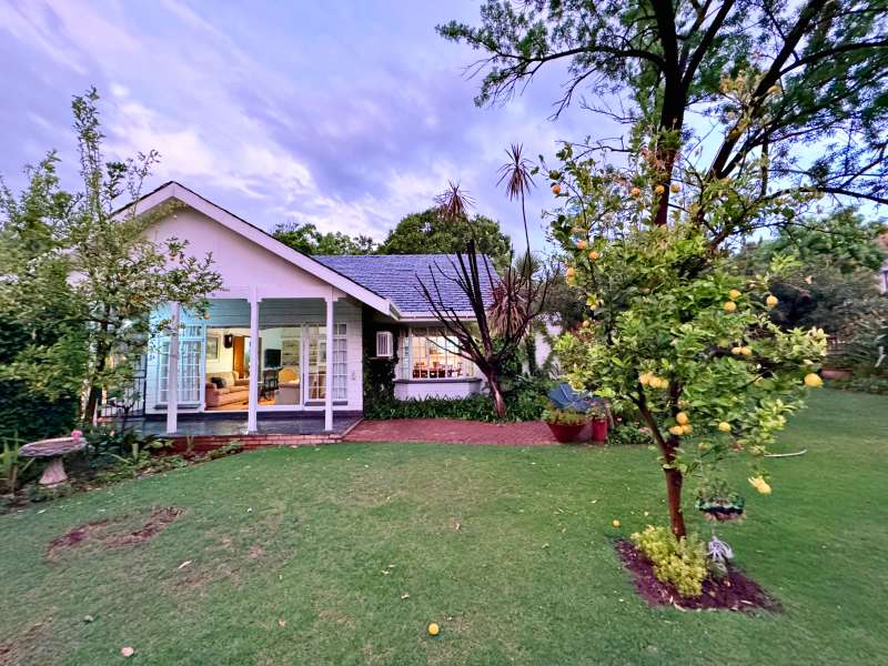 Nestled in a peaceful crescent, this impeccably maintained property with its classic slate roof and lush, tree-filled garden offers the perfect blend of comfort and tranquility. The welcoming entrance hall leads into a spacious lounge area with built-in fireplace and wooden floors, adjacent to the dining room with bay windows overlooking the lushes garden. The TV room flows seamlessly onto an undercover patio with a built-in braai next to the sparkling swimming pool, ideal for entertaining. A formal study with built-in cupboards is ideal for working from home. The well-appointed kitchen with breakfast nook, boasts an eye-level oven, pantry storage and a convenient scullery, with an additional outside laundry area for practicality. The main bedroom is a private retreat with a walk-in closet, en-suite bathroom and direct access to the patio, pool and garden. The other 3 bedrooms share two and a half bathrooms. Additional features include a double garage, double covered parking, domestic quarters, pre-paid electricity, municipal water, a well equipped with a pump for irrigation purposes and a back-up water tank as well as an alarm system for peace of mind. This exceptional home is perfect for those seeking a quiet yet luxurious lifestyle surrounded by nature.