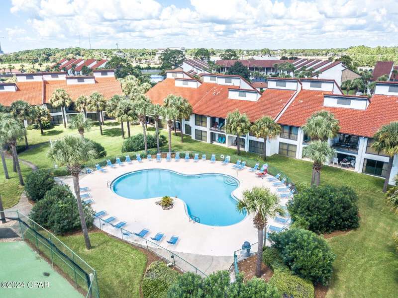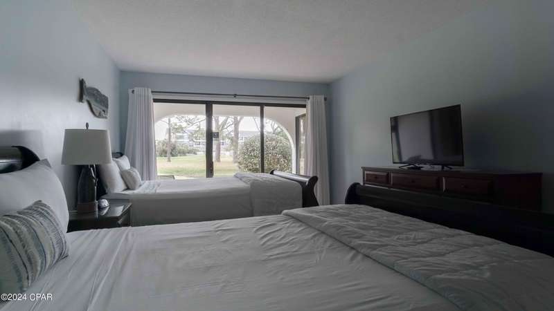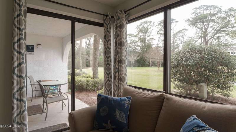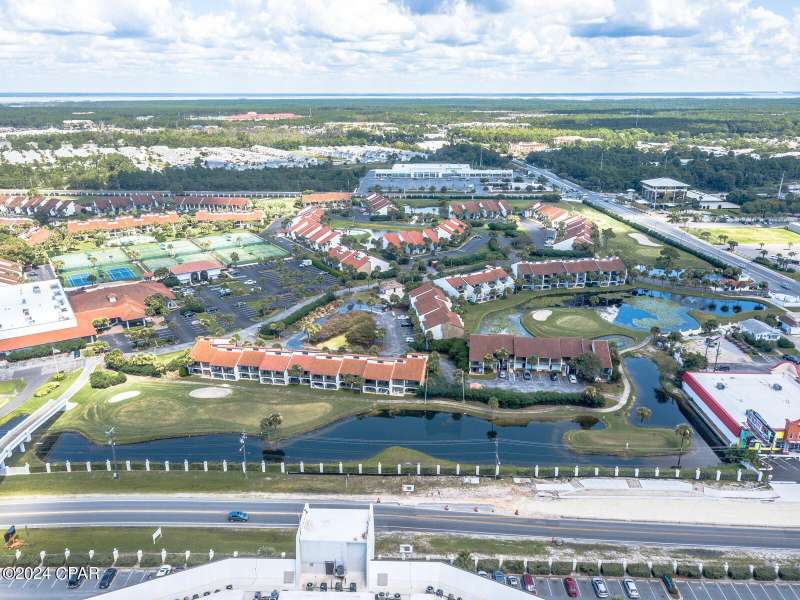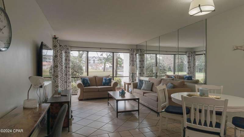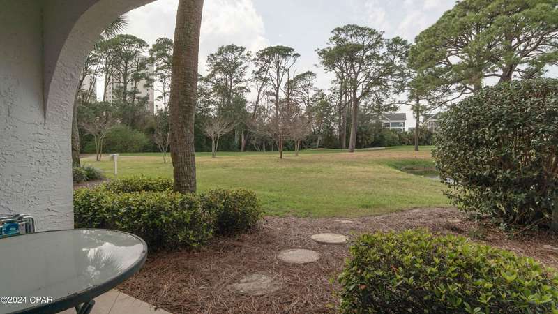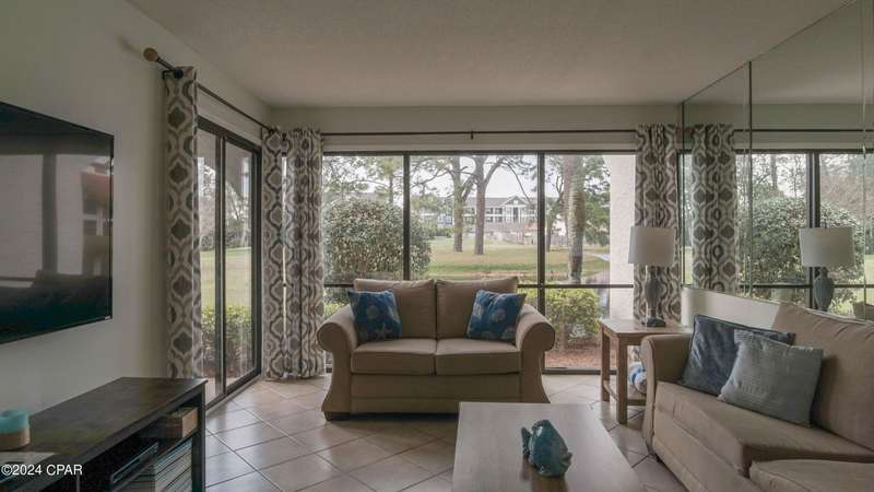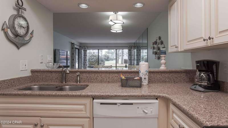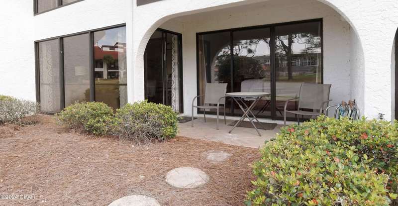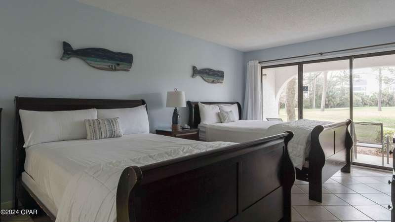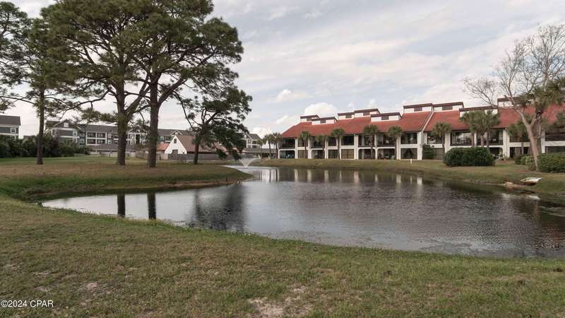 Ground floor Edgewater Golf Villa! Located near the community bridge to the community beach, this beautiful unit is fully furnished with 2 queen beds in the bedroom and a sofa sleeper in the Living Room. The unit features quartz counters, 2 full bathrooms, owner's storage closet, and fairway/pond view from the patio/bedroom/living room. Priced below market! This home is perfect for year round living, as your winter/summer getaway, or being a short term vacation rental. Edgewater is a huge gated community that features multiple pools, a beach, exercise room, bbq areas, golf, tennis, pickleball courts, and much more! Located only minutes from Pier Park, shopping, dining, and the beaches.