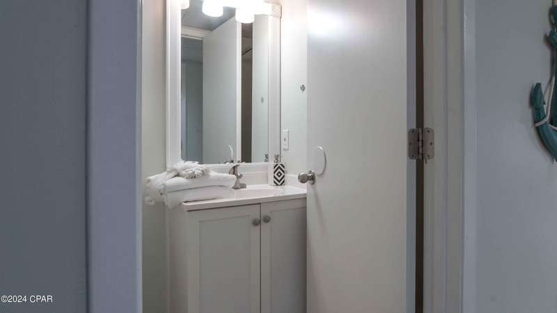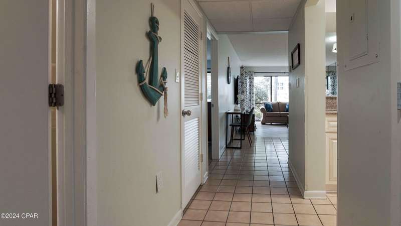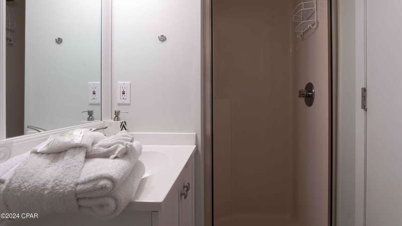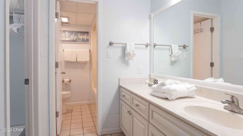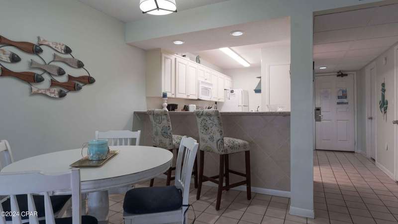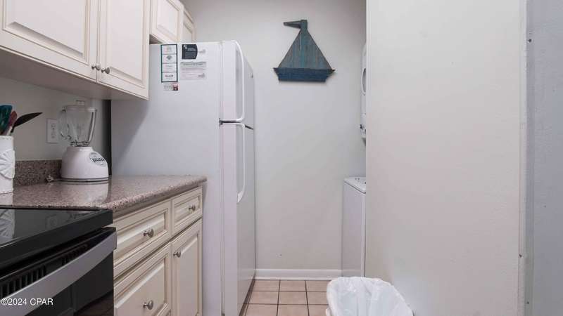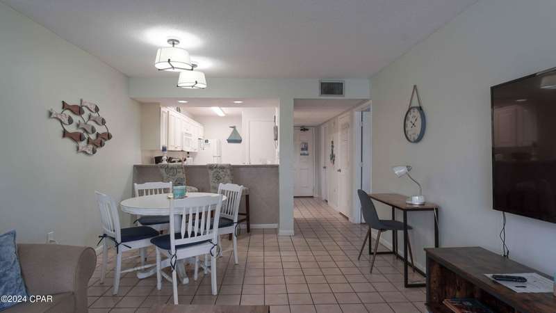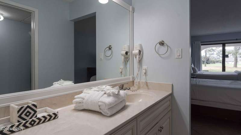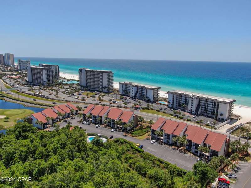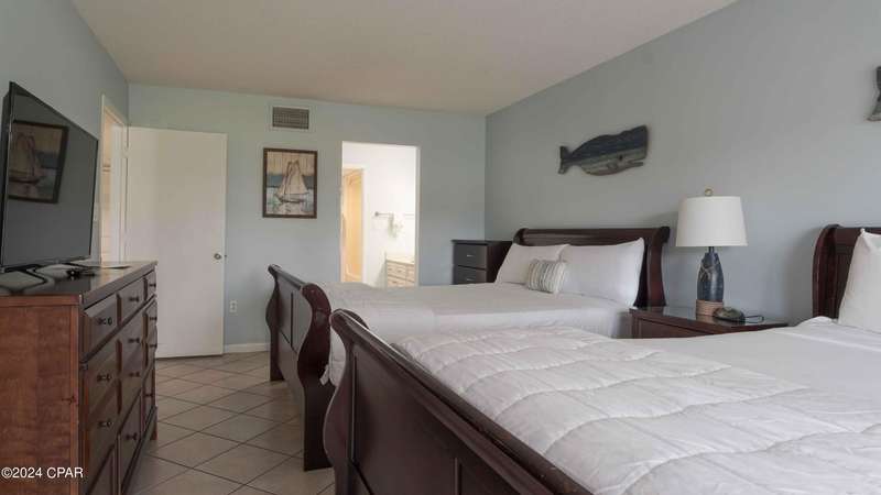 Ground floor Edgewater Golf Villa! Located near the community bridge to the community beach, this beautiful unit is fully furnished with 2 queen beds in the bedroom and a sofa sleeper in the Living Room. The unit features quartz counters, 2 full bathrooms, owner's storage closet, and fairway/pond view from the patio/bedroom/living room. Priced below market! This home is perfect for year round living, as your winter/summer getaway, or being a short term vacation rental. Edgewater is a huge gated community that features multiple pools, a beach, exercise room, bbq areas, golf, tennis, pickleball courts, and much more! Located only minutes from Pier Park, shopping, dining, and the beaches.