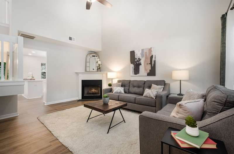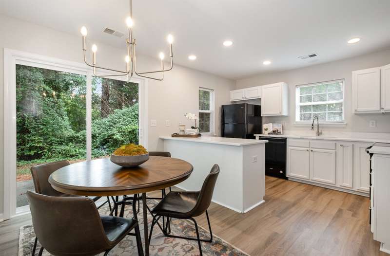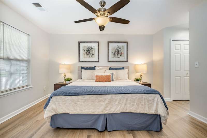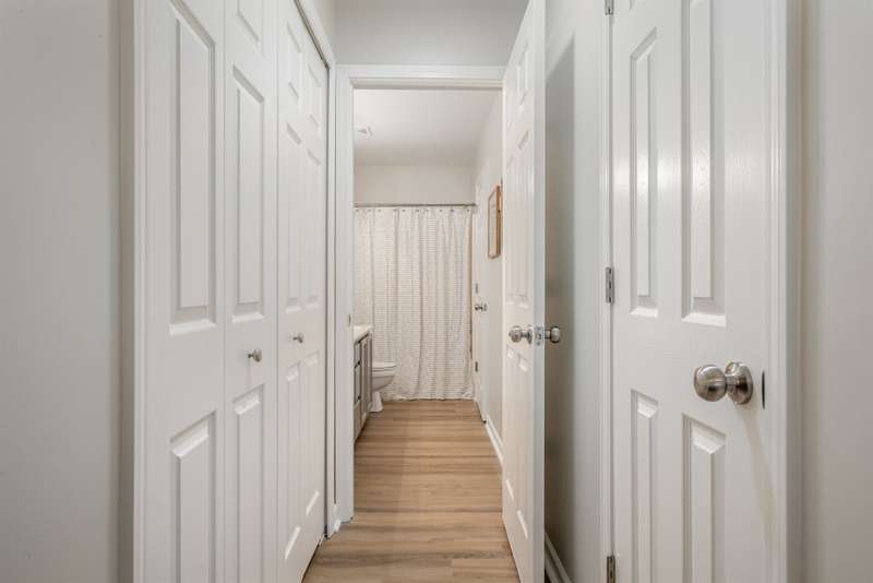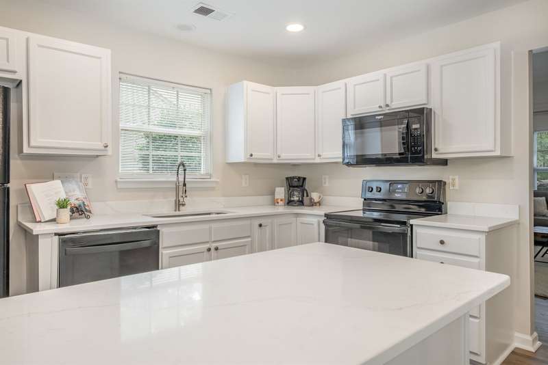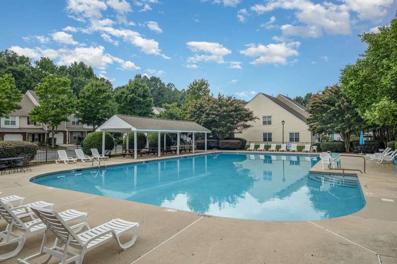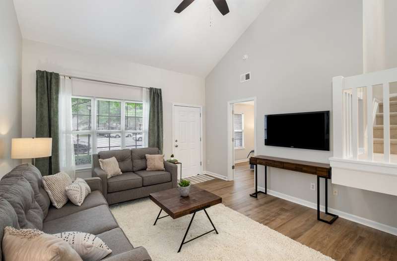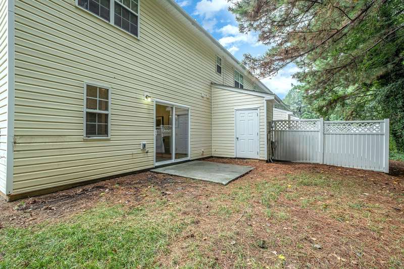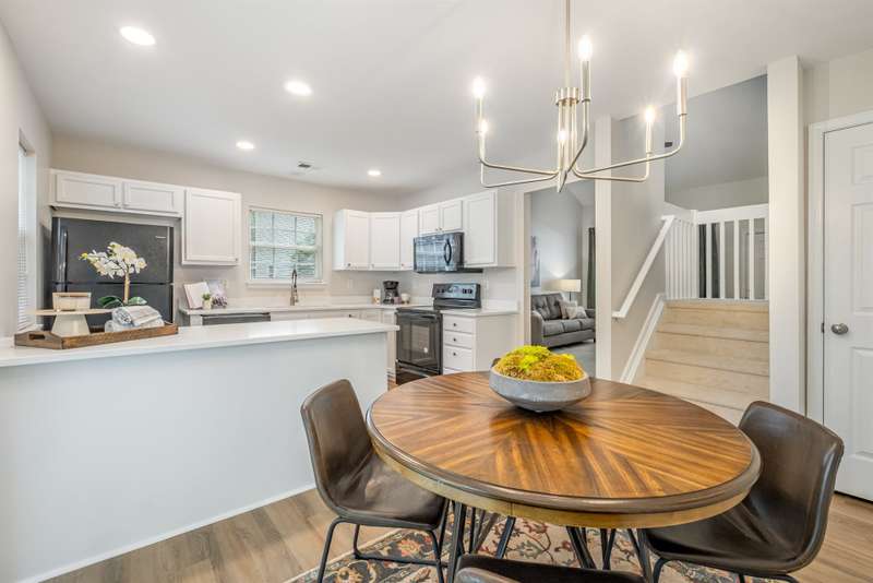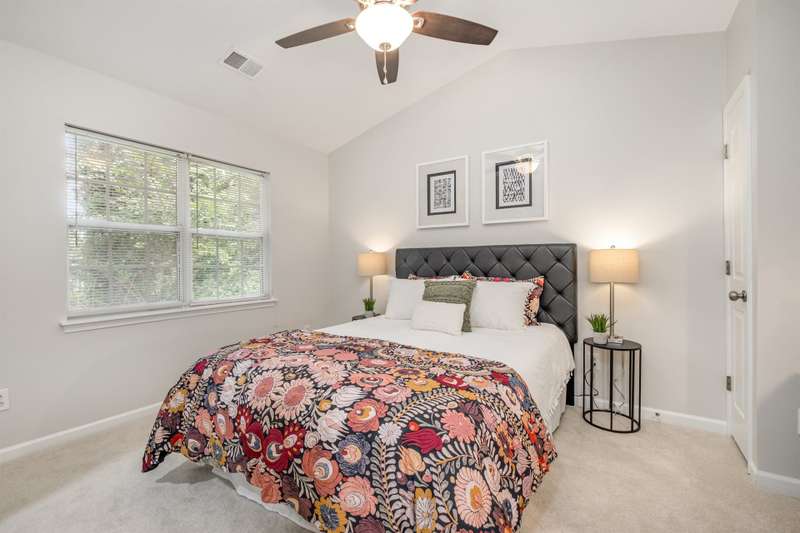 This end-unit townhome is a true standout, offering soaring two-story ceilings, an architecturally interesting staircase, & abundant natural light. Recent updates include smooth, bright white ceilings (no dated popcorn ceilings here!), fresh paint in a soft neutral, & light-toned LVP flooring that's a perfect blend of modern grey & sandy brown. Sleek brushed nickel hardware & lighting fixtures replaced dated brass. Spacious kitchen has tons of cabinets painted a fresh white & gorgeous new Quartz counters. The main-level primary suite offers two closets & dual vanity sinks. Upstairs offer new plush carpeting & spacious secondary bedrooms. A rear patio backs to natural space for private backyard dining. Holly Ridge charms with holiday themed street names, a community pool, pond, & walking path. Don't settle for a property that comes with a long to-do list, this property is ready for a new owner!