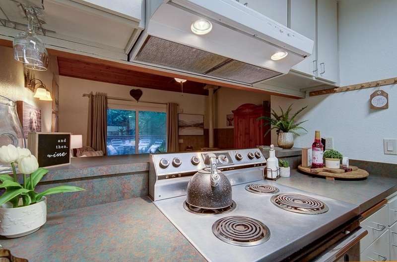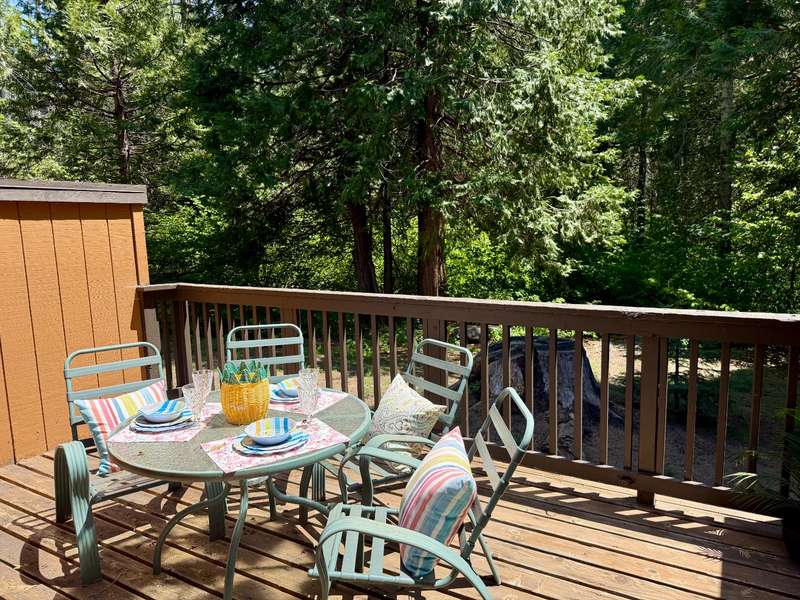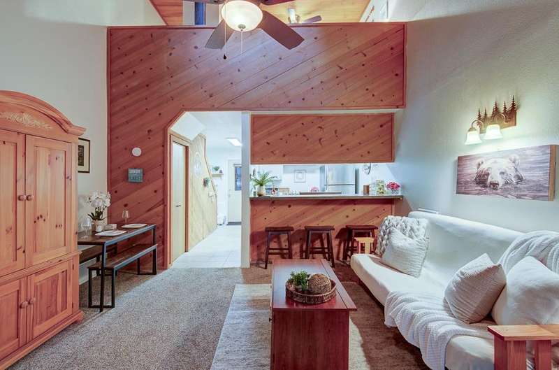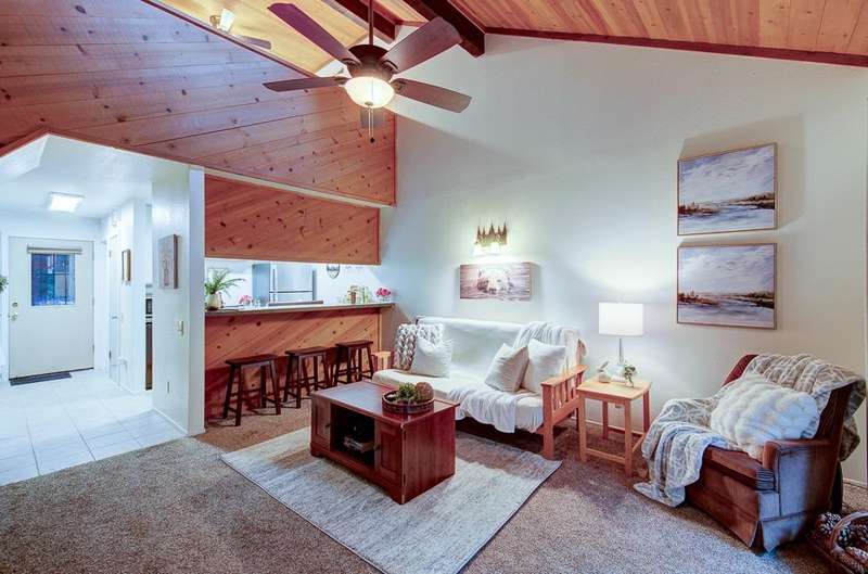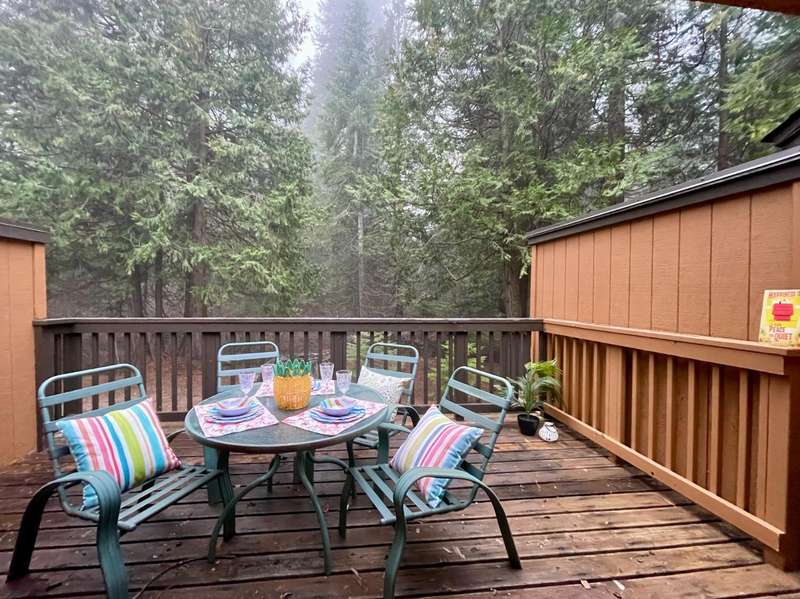BEST LOCATION in highly sought-after condos in beautiful Shaver Lake - backs right to the creek! Relax on your big deck to the sounds of a babbling brook. Pure tranquility & ultimate privacy w/only peaceful pines behind you. This deck truly extends your living space. Secret is out on Bretz Mill - monthly dues had a huge reduction. For what you'd pay on fire insurance alone on a house, you get fire insurance PLUS all exterior maintenance: roofs, painting, snow & pine needle removal, trash service, pool, hot tub, sauna, & seasonal boat/RV parking. Best deal on the mountain, plus 10 min to the lake & 30 to the slopes! The living room features a cozy propane fireplace & vaulted wood-lined ceiling up to the bedroom w/upgraded tongue-and-groove. Gaze out the newer vinyl slider at the trees. Kitchen opens onto the living room w/freshly painted cabinets, stainless steel fridge, & large breakfast bar, perfect for drinks with friends. Quite a view while you're cooking dinner! A 1st floor half bath means 2 toilets! And if you sleep 2 on the futon, there's only 2 stairs to get inside, so it's a great level-entry option. Head up to the generously sized bedroom, open to below. Feels like a luxury adult treehouse w/room for a king-sized bed, large closet, & private full bath. Sold furnished. All this privacy & still close to the hot tub/sauna for apres ski. Experience true vacation living where you can relax & have the HOA do all the work for you at a great price. Come check it out!