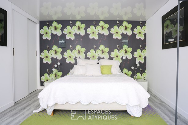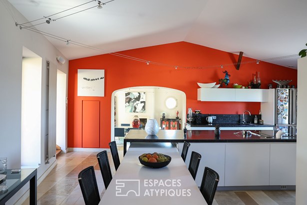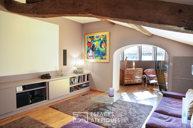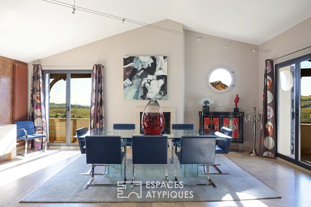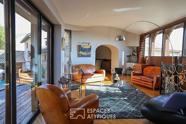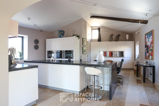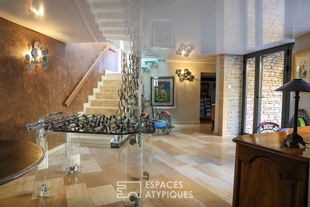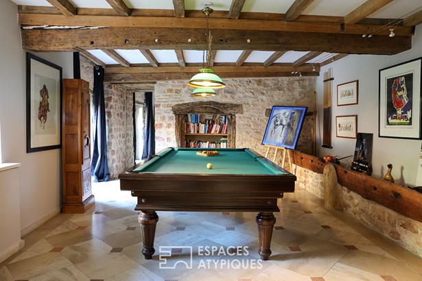 Upstairs, light becomes the main guest. A vast living room opening onto a terrace offers breathtaking unobstructed views of both the Romanesque church and the Saone Valley. A projection room equipped with an overhead projector invites you to enjoy movie nights by the fireplace.