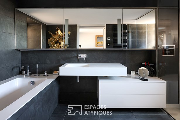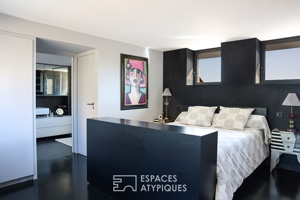 The sleeping area includes a master suite and an additional bedroom with a private bathroom. The contemporary kitchen, equipped with high-end furniture and appliances, connects to a dining room bathed in light and extended by a balcony overlooking the valley.