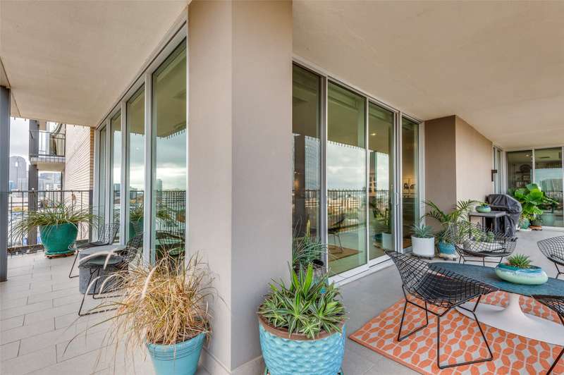 Discover the pinnacle of high-rise living with this reimagined corner penthouse in Park Towers, showcasing a complete renovation of timeless elegance and modern sophistication. Every detail of this expansive residence has been thoughtfully designed to blend luxury, comfort, and effortless style. The heart of the home is an impressive kitchen, where custom cabinetry, soapstone counters, and premium appliances create a refined culinary experience. Open to multiple living and dining areas, the layout invites seamless entertaining while maintaining intimate spaces for daily living. Walls of glass frame breathtaking panoramic views, while a sleek fireplace anchors the main living area with warmth and ambiance. The primary suite is a true retreat, featuring a spa-inspired bath, extraordinary closet space, and a private balcony for moments of quiet reflection. The guest suite offers generous proportions and an integrated office-study, while a versatile third bedroom doubles as an additional living area with pocket doors and a custom Murphy bedperfect for flexibility and hosting. Expansive outdoor balconies provide the ultimate extension of the living space, with abundant room for dining, entertaining, or cultivating a private garden against the backdrop of the city skyline. Recent upgrades include new windows, sliding doors, plumbing, electrical, HVAC systems, and striking white oak hardwoods throughout. Intelligent storage solutions, such as a butlers pantry, dedicated entertaining closet, and spacious utility room, enhance the functionality of the home without compromising style. Park Towers itself offers residents an unparalleled lifestyle with first-class service and security, community lounges, fitness center, pool, and direct access to the Katy Trail. With all utilities included in the HOA, this penthouse represents a rare opportunity to own a residence where design, convenience, and luxury converge in perfect harmony. Designed by Mitchell Garman Architects.