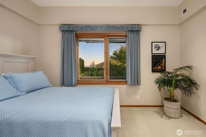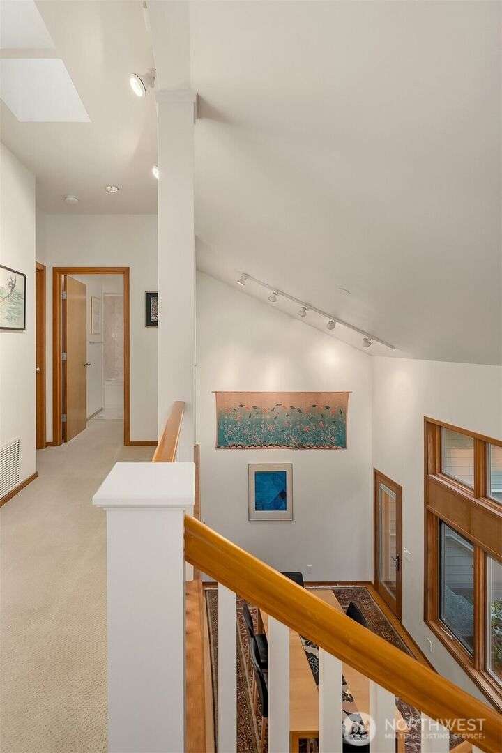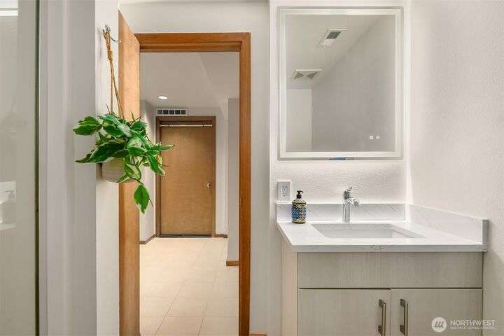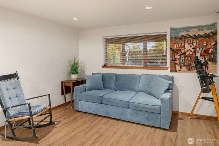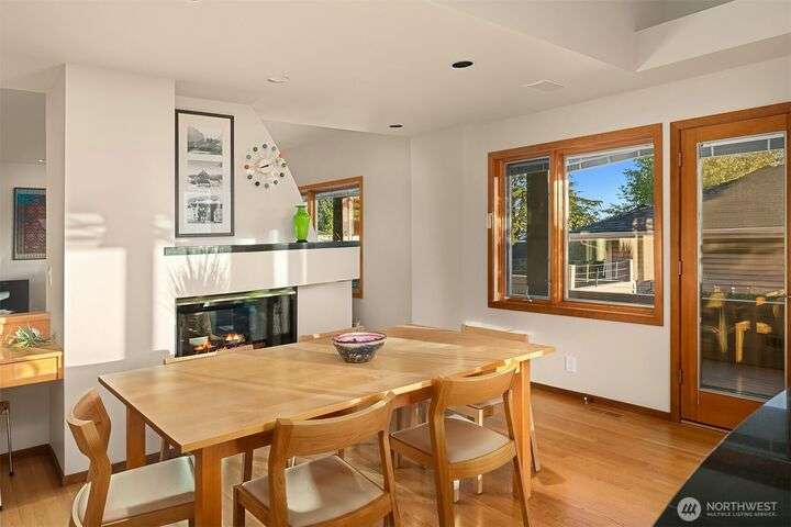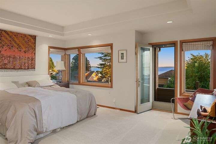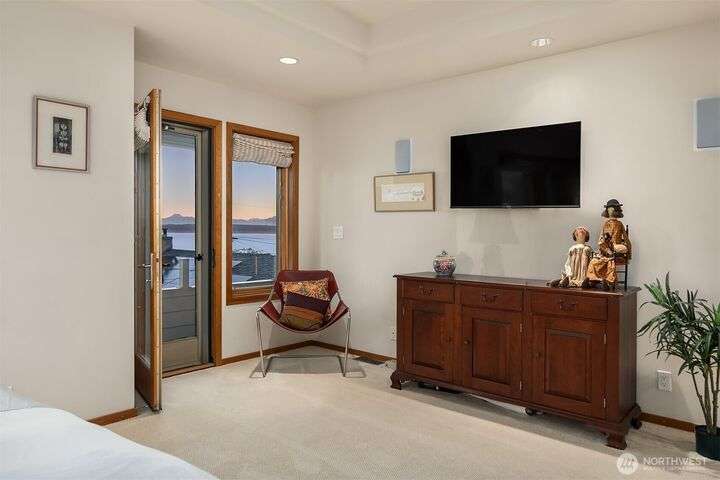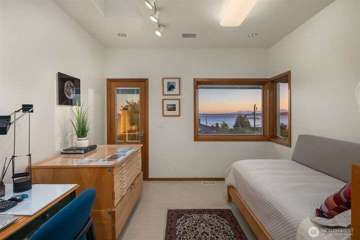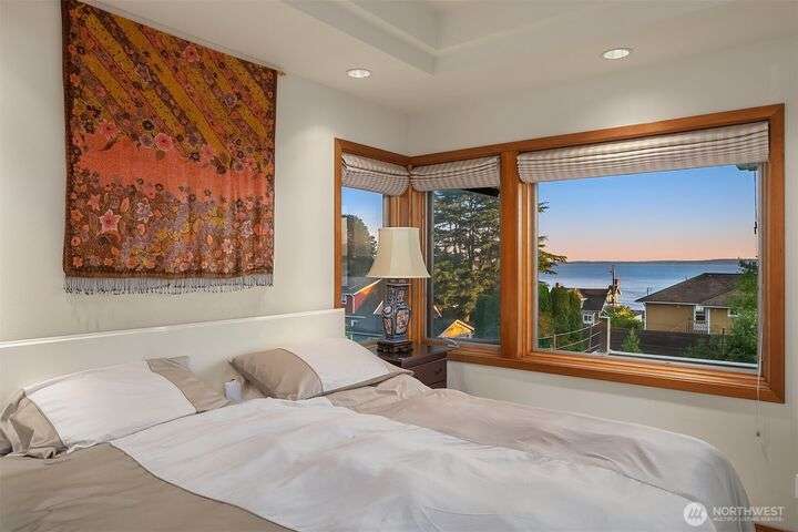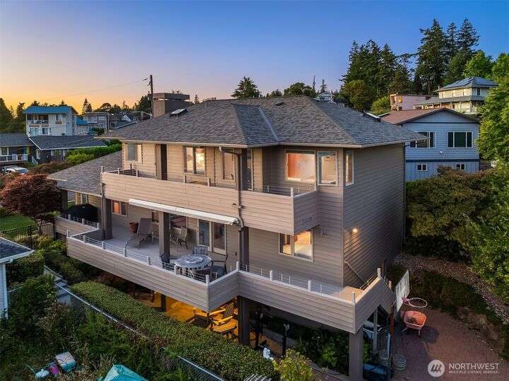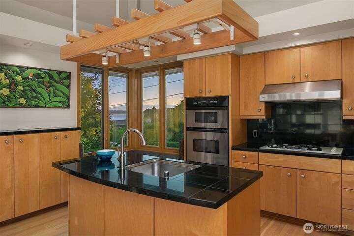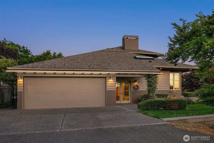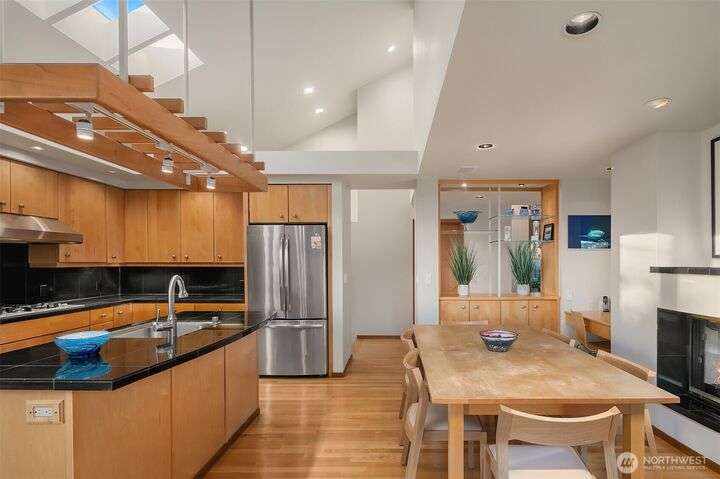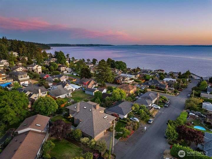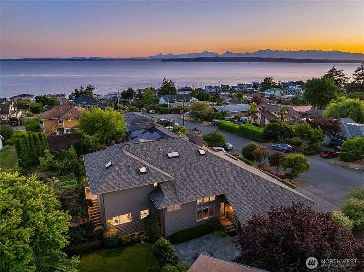 Nestled in Richmond Beach this architecturally rich NW Contemporary offers Sound & Olympic views. Light-filled 3-level design w/ dramatic vaulted ceilings, skylights, walls of windows. open-concept layout w/ cutouts that maintain airy sightlines while defining spaces. Chef’s kitchen features black granite, maple cabinetry, large island & built-in bench. Directional gallery lighting highlights display shelving & architecture. Modern 2-sided fireplace. Ideal layout w/ 2 beds on main, 3 up, den, bonus, & rec room. Expansive exotic wood wrap-around deck w/ 20 ft sunsetter awning. Primary suite w/ private view deck, WIC & spa bath. Landscaping w/ drip irrigation. Speakers & smart features. Tesla charger, new 2022 roof. Moments to Kings.