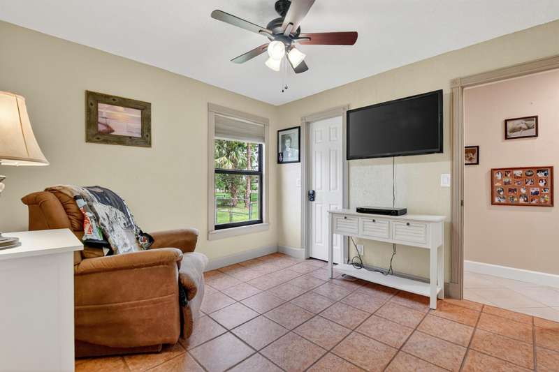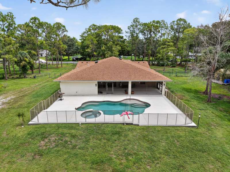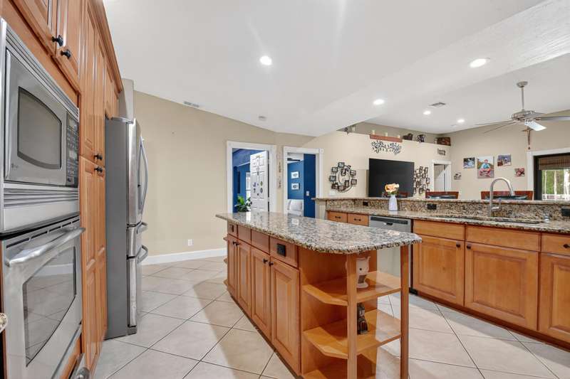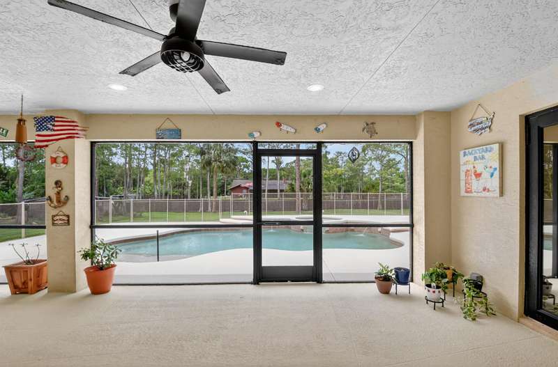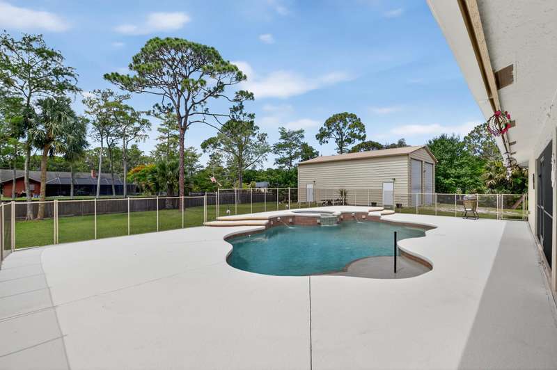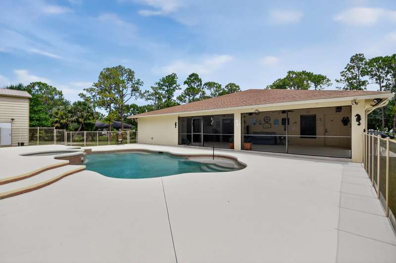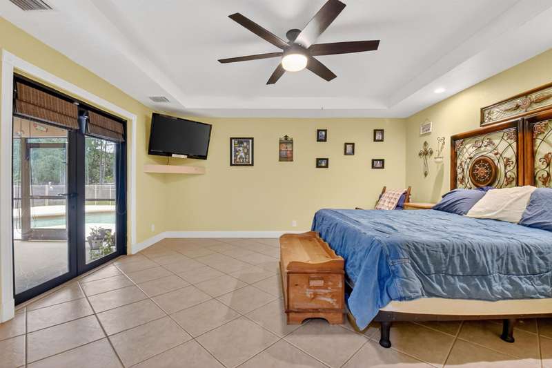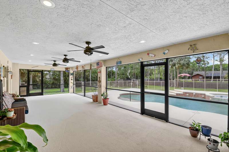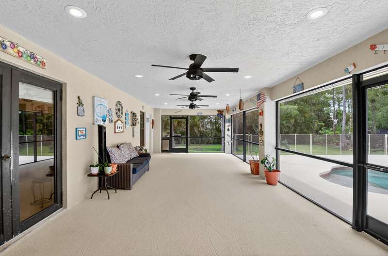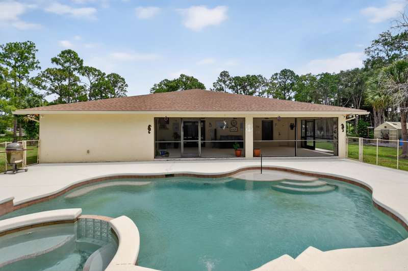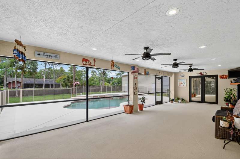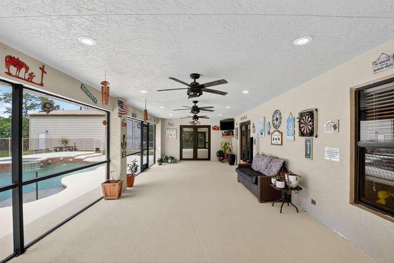 Beautiful family retreat in a tranquil country setting. This property sets on 1.41 acres where modern amenities meet country charm. This 5 BR residence features 2 master suites, 4 full baths + a versatile flex room.The expansive screened-in patio offers serene views of the lg property while the sparkling salt water pool/Jacuzzi invites you to relax & unwind. Inside,a gourmet kitchen boasts granite countertops, double ovens, a warming drawer, & a large island perfect for entertaining.Other highlights include an innovative safe room w/reinforced concrete walls & hurricane door, whole house impact windows and generator & solar roof fans for optimal attic cooling. A massive (30x40x16) 2ndary bldg, fully air-conditioned & insulated is perfect for housing boats or RVs. +Greenhouse & chickencoop