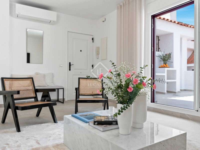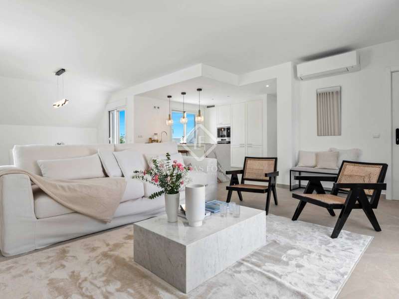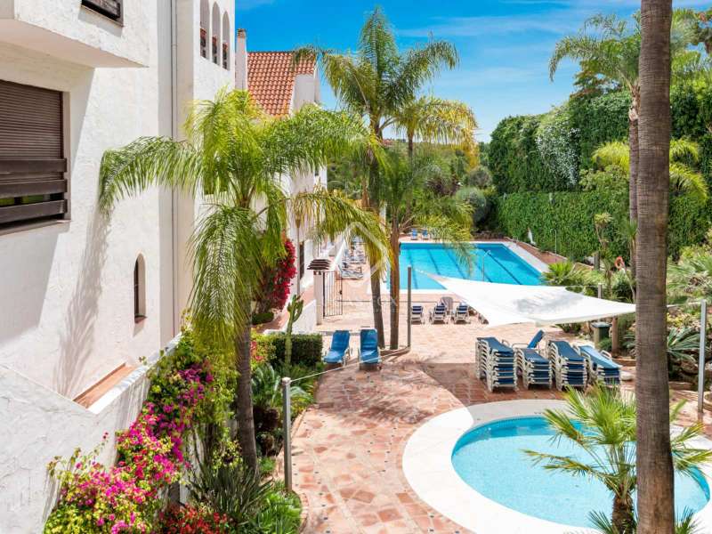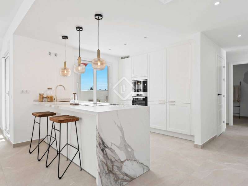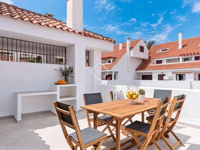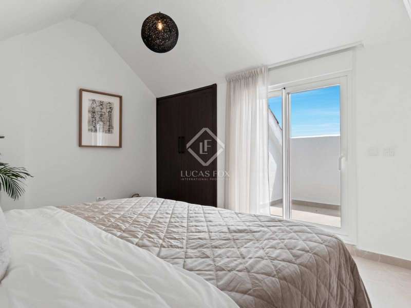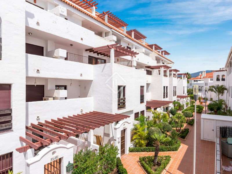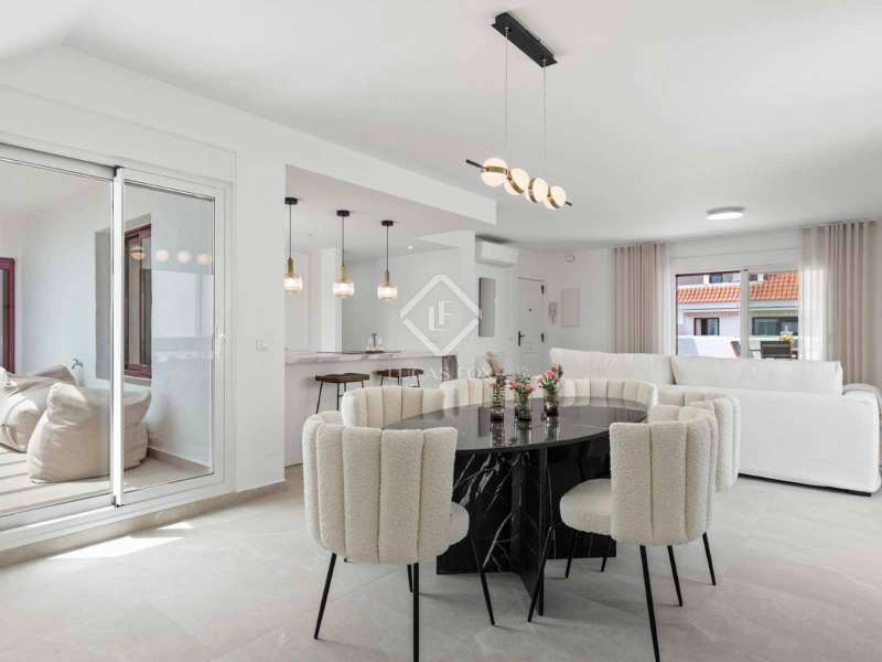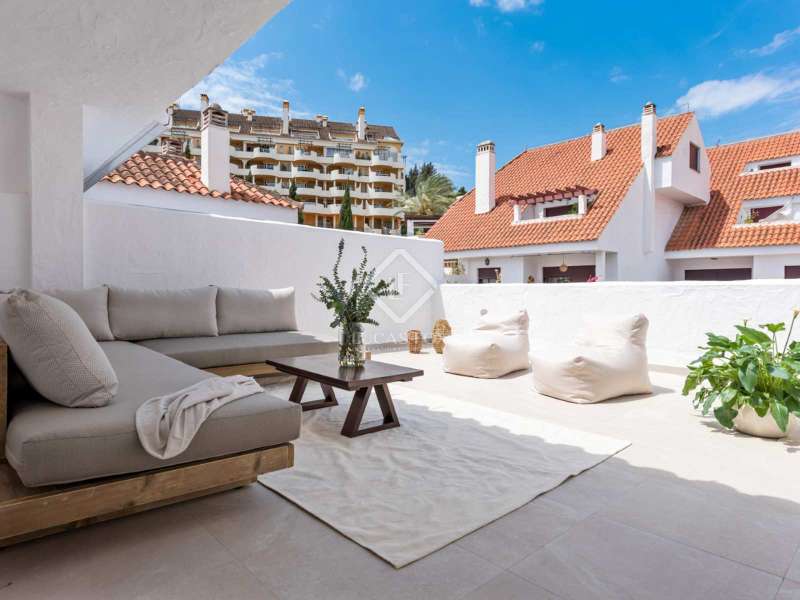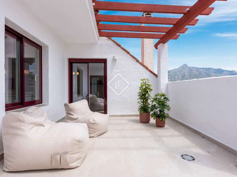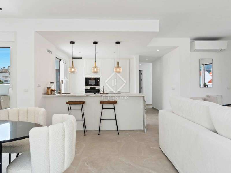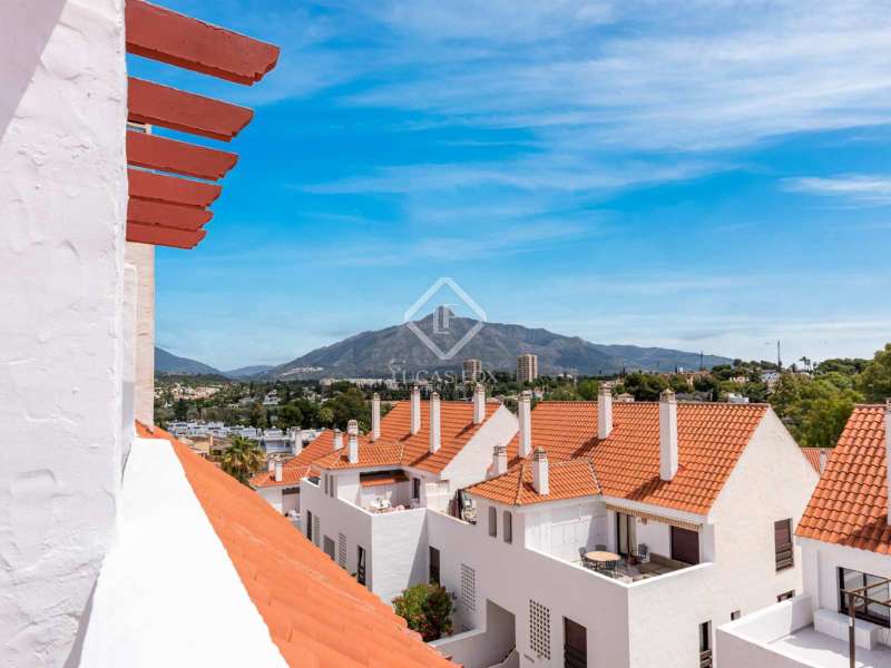 Discover this exquisite luxury duplex penthouse situated in the prestigious gated community of La Maestranza, centrally located in Nueva Andalucia, Marbella. Boasting a prime location, this property offers both security and convenience, just moments away from supermarkets, restaurants, and the popular Centro Plaza shopping centre. Within a mere 15-minute stroll, you can reach the beautiful beach and the vibrant Puerto Banus. This refurbished penthouse spans an impressive total area of 215 m² and comprises three bedrooms, two bathrooms, and a guest toilet. The main floor welcomes you with a bright living room featuring a dining space, an open-plan kitchen, and an east-facing terrace that offers breathtaking mountain views. The main bedroom, conveniently situated on the main floor, grants direct access to one of the spacious terraces. Ascending to the upper floor, you will find two guest bedrooms, each accompanied by a private balcony showcasing stunning views of the renowned La Concha mountain and the sparkling Mediterranean Sea. The property also includes two west-facing terraces that overlook the charming development. Residents of this exclusive complex can relish in the communal amenities, including two generously sized swimming pools nestled within the meticulously maintained community garden. The penthouse is equipped with air conditioning and is being sold fully furnished. Additional features encompass fitted wardrobes, a storage room, a security entrance, and individual air conditioning units. Characterized by its exceptional condition and recent renovations, this duplex penthouse offers a comfortable and stylish living space. The gated community ensures added security, while the presence of an elevator in the building enhances convenience. Furthermore, the property provides access to a communal garage for parking. Its proximity to shops, town, port, and schools makes it an ideal choice for families seeking a well-rounded lifestyle. A remarkable property in a highly sought-after location.