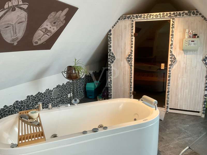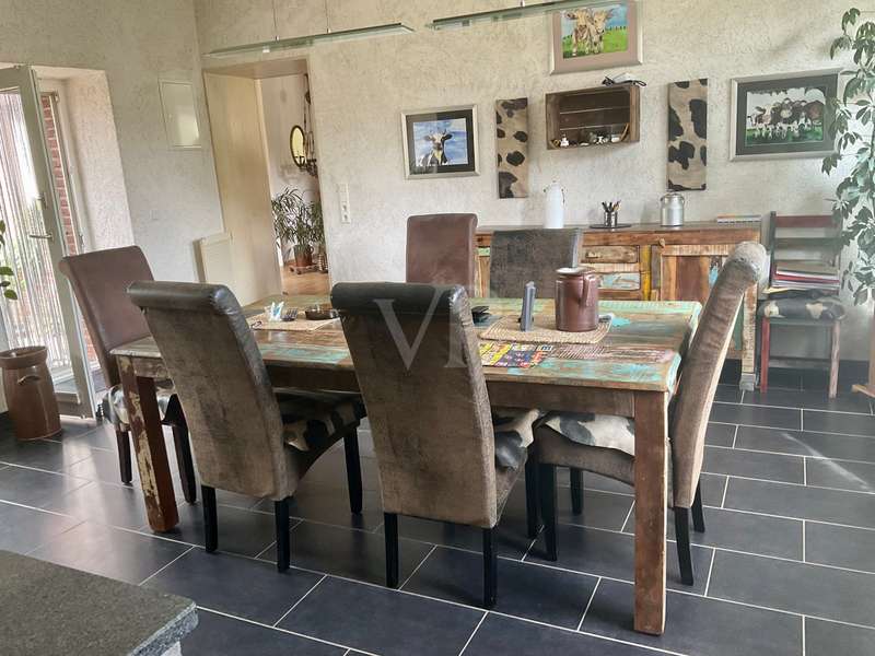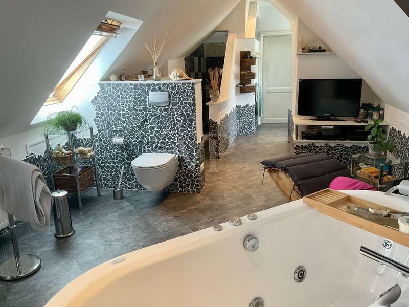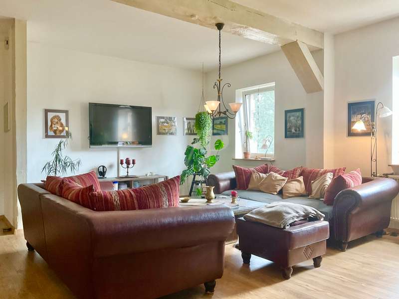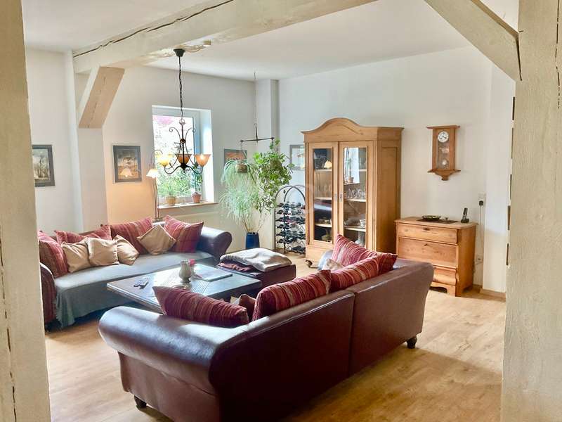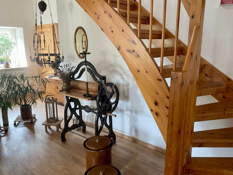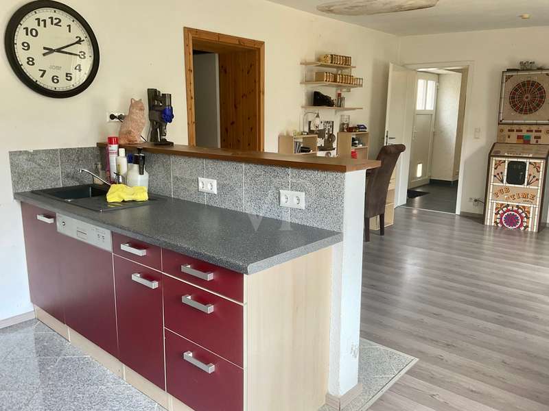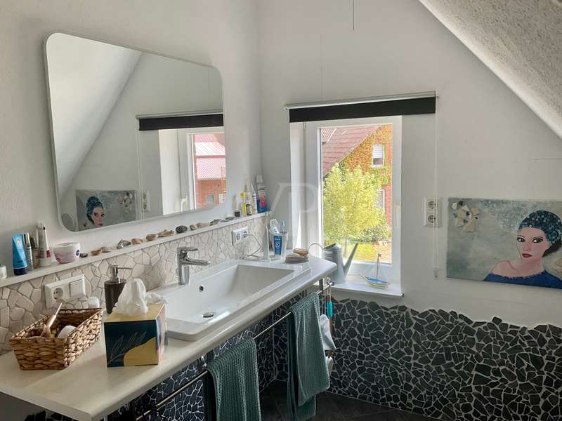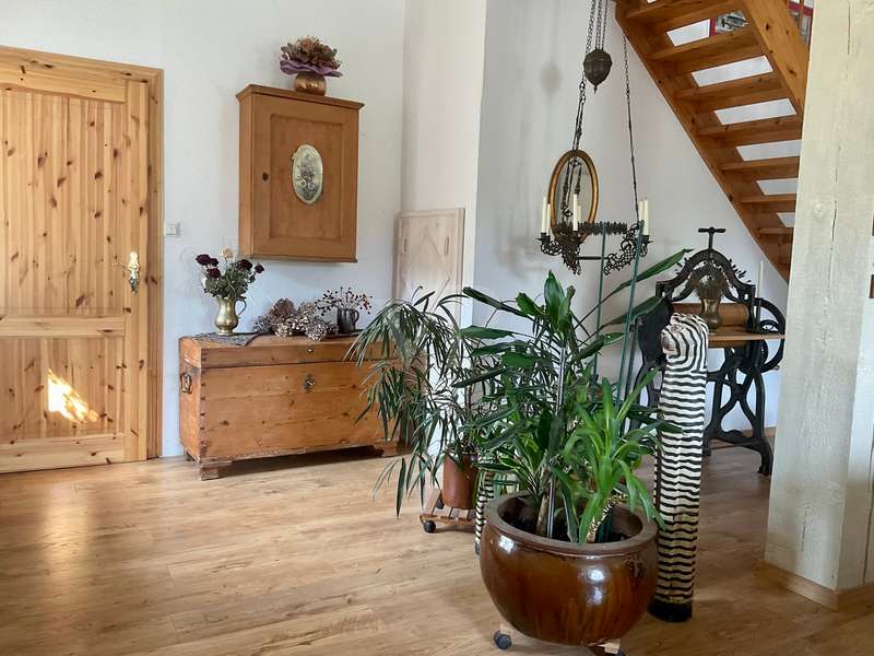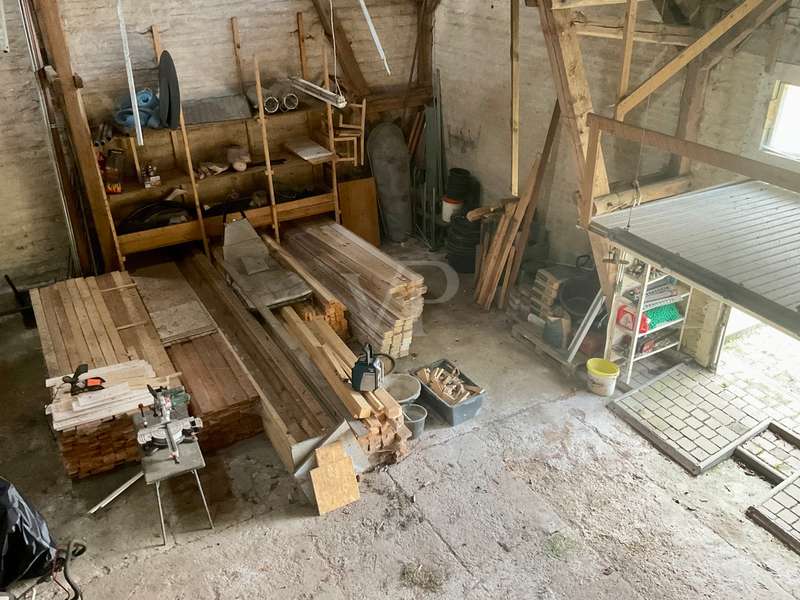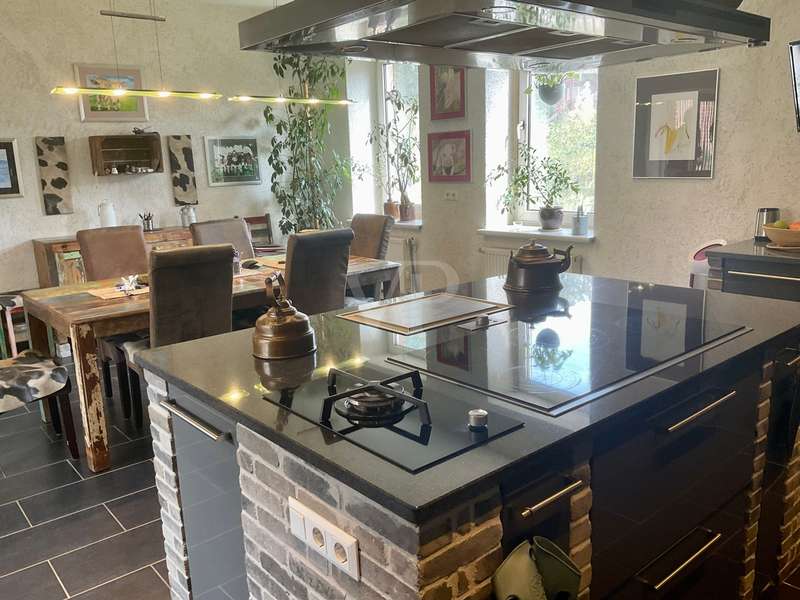 You enter the house through the entrance surrounded by roses. To the left and right of the entrance area are the living room and a bedroom with bathroom. This area could, for example, be your own small living unit or an office or a small practice (a kitchenette can be installed). You continue into the really large open-plan living room with access to the eat-in kitchen and the attic. From the eat-in kitchen, you enter the large terrace with a view of the green inner courtyard. Here you are protected from prying eyes and can enjoy the peace and quiet. The open-plan kitchen is a dream, with a cooking island and large dining area and all the technical refinements, such as a 5-burner ceramic hob, gas hob and tepanyaki plate, as well as a microwave, fridge-freezer and oven. The worktops are made of granite. It's fun to cook and entertain guests here. Adjacent to the kitchen is a small pantry or storage room. From the kitchen there is access to the granny apartment, which has a separate entrance. This apartment has a beautiful entrance area, a large living room with integrated kitchenette (fridge with freezer compartment, dishwasher, ceramic hob with 4 plates, oven) and a bedroom. The preparation for the installation of a bathroom in the adjoining rooms is available. This area would also be ideal as an office. On the top floor of the main apartment there is a bedroom with adjoining bathroom, where the sun bed is currently located, and a living room, which is currently also used as a small yoga room. The highlight of this floor, however, is the tastefully designed huge wellness area with sauna, free-standing bathtub (whirlpool) and relaxation areas with TV. Here you can unwind after a busy day. The outbuilding at the rear of the property is a large, solid barn, which is currently used as a storage area and workshop. There is also space here for larger vehicles such as motorhomes or boats, you can screw and grind and pursue your hobby or even apply for a change of use. Some adjoining rooms are used as a workshop and garden room. The connections for water, electricity and heating are located in the barn. The barn can be reached via the inner courtyard with access next to the residential building. There is a parking space in front of the entrance gate to the inner courtyard. There is a 40 m deep well on the property for garden water. The house has a small cellar in which the heating system is housed. This can be reached through a hatch in the floor from the utility room. There is a dryer and washing machine in the utility room.