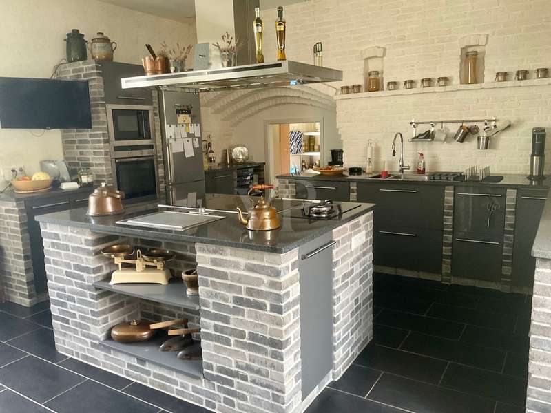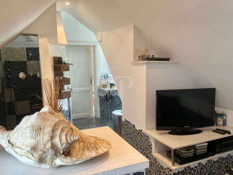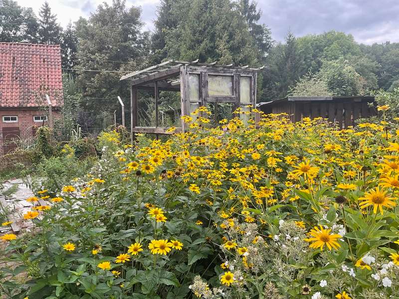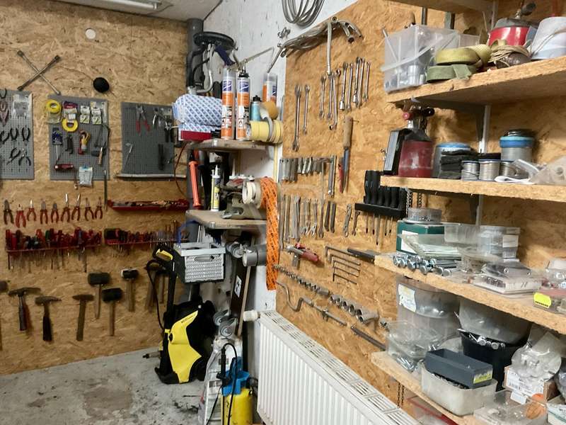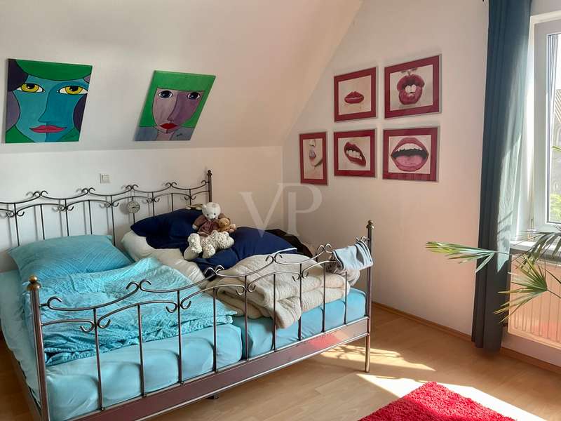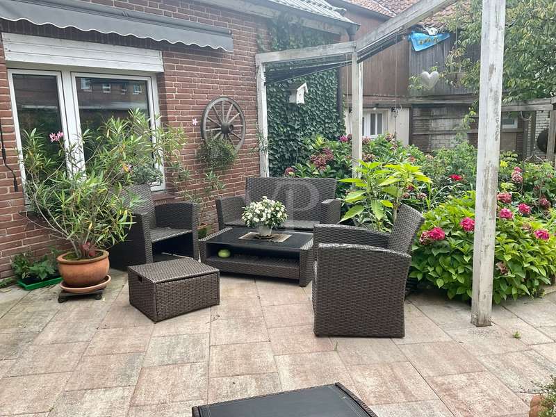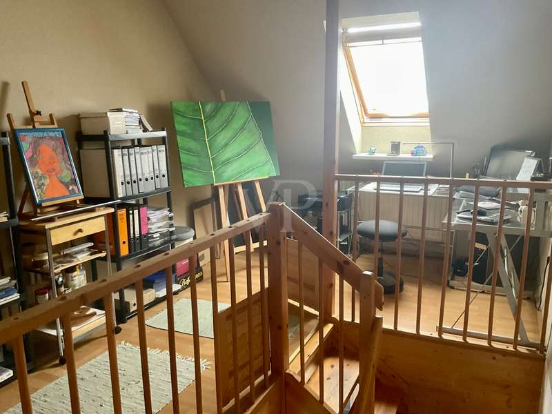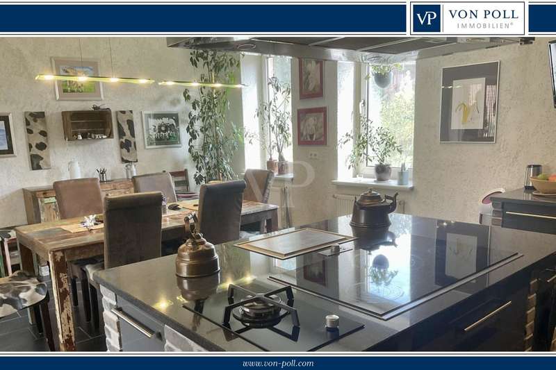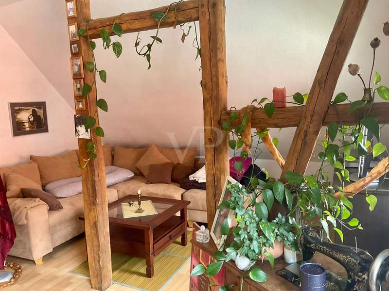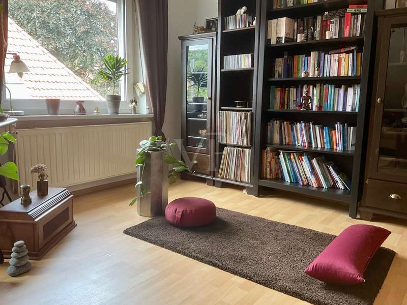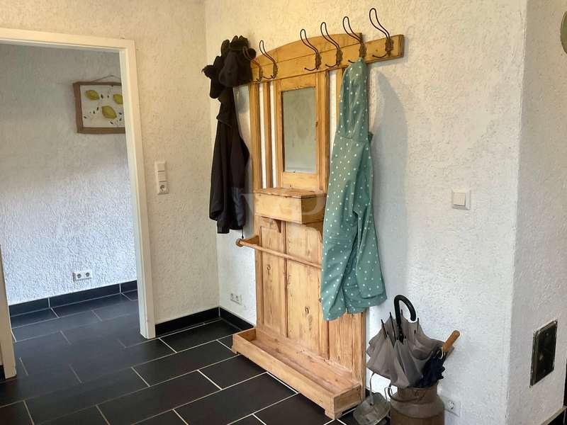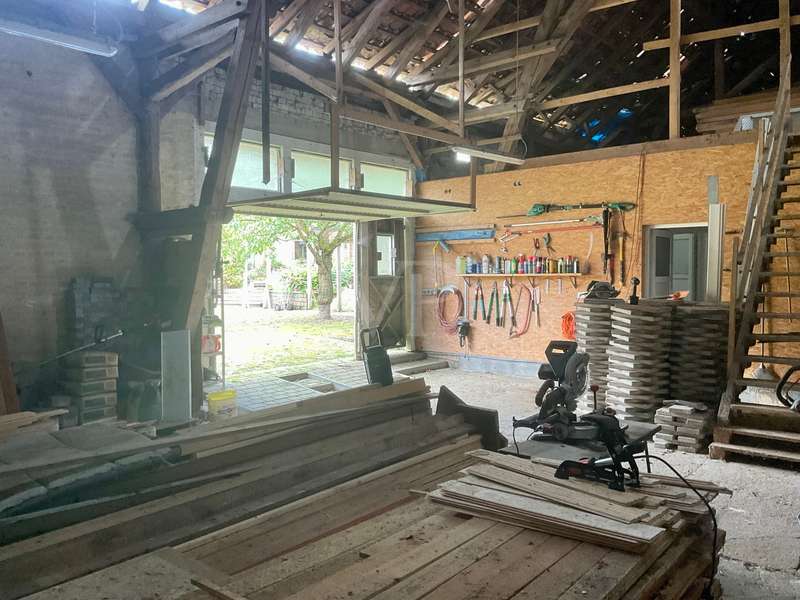 You enter the house through the entrance surrounded by roses. To the left and right of the entrance area are the living room and a bedroom with bathroom. This area could, for example, be your own small living unit or an office or a small practice (a kitchenette can be installed). You continue into the really large open-plan living room with access to the eat-in kitchen and the attic. From the eat-in kitchen, you enter the large terrace with a view of the green inner courtyard. Here you are protected from prying eyes and can enjoy the peace and quiet. The open-plan kitchen is a dream, with a cooking island and large dining area and all the technical refinements, such as a 5-burner ceramic hob, gas hob and tepanyaki plate, as well as a microwave, fridge-freezer and oven. The worktops are made of granite. It's fun to cook and entertain guests here. Adjacent to the kitchen is a small pantry or storage room. From the kitchen there is access to the granny apartment, which has a separate entrance. This apartment has a beautiful entrance area, a large living room with integrated kitchenette (fridge with freezer compartment, dishwasher, ceramic hob with 4 plates, oven) and a bedroom. The preparation for the installation of a bathroom in the adjoining rooms is available. This area would also be ideal as an office. On the top floor of the main apartment there is a bedroom with adjoining bathroom, where the sun bed is currently located, and a living room, which is currently also used as a small yoga room. The highlight of this floor, however, is the tastefully designed huge wellness area with sauna, free-standing bathtub (whirlpool) and relaxation areas with TV. Here you can unwind after a busy day. The outbuilding at the rear of the property is a large, solid barn, which is currently used as a storage area and workshop. There is also space here for larger vehicles such as motorhomes or boats, you can screw and grind and pursue your hobby or even apply for a change of use. Some adjoining rooms are used as a workshop and garden room. The connections for water, electricity and heating are located in the barn. The barn can be reached via the inner courtyard with access next to the residential building. There is a parking space in front of the entrance gate to the inner courtyard. There is a 40 m deep well on the property for garden water. The house has a small cellar in which the heating system is housed. This can be reached through a hatch in the floor from the utility room. There is a dryer and washing machine in the utility room.