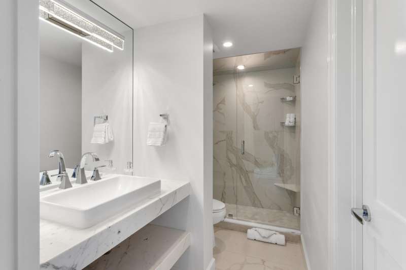 Direct Lakefront views from this 2BR/2BA first floor corner unit with an open living concept design. This gorgeous home was completely gutted and rebuilt in 2023/2024 with floor to ceiling windows and doors in every room. Enjoy unimpeded water and sunset views! Villa Serein condo complex living uniquely boutique with only 2 stories high and 8 units. Walk out on your private grassy lawn, enjoy a relaxing walk on Ibis Island Trail. New hurricane windows & doors, new kitchen, new baths, new coral tile floors, new hide-a-way Bluetooth blinds throughout. Exquisite finishes including Gracie hand painted wallpaper, elegant kitchen with under-lit counters & top of the line all new Thermador appliances. marble bathrooms with custom floating vanities. Designer furnished with an expert mix of