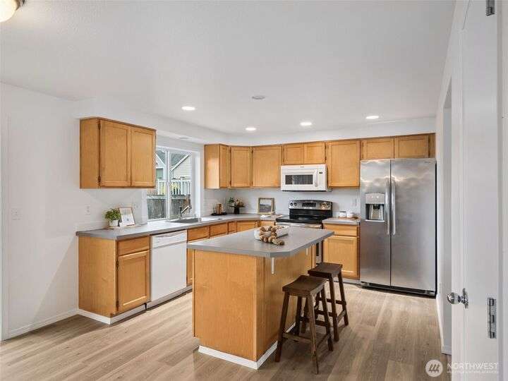 Beautifully Updated! Featuring hardwood entry, new gleaming laminate floors, new carpet & padding, fresh landscaping. New paint. Light-filled open floor plan boasts vaulted ceilings & skylights creating a bright & airy atmosphere. Formal living & dining, along w/ a modern kitchen equipped with all appliances, island bar, walk-in pantry and cozy eating nook. Family room features a gas fireplace. 4 spacious bedrooms, including a primary suite offering a walk-in closet, double sink vanity and a double headed shower. Seperate Laundry room/mud room. Situated on a fully fenced corner lot and resting on a cul-de-sac. Excellent location to schools, parks, shopping. MOVE IN READY!