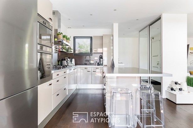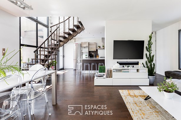 The entrance leads to a 56 sqm living space with clean lines, consisting of a living-dining room and a fully equipped open kitchen. Large bay windows allow natural light to enter every corner, accentuating the feeling of volume. The metal and wood staircase, with its resolutely industrial style, structures the space with elegance and gives a strong aesthetic signature to the whole.
