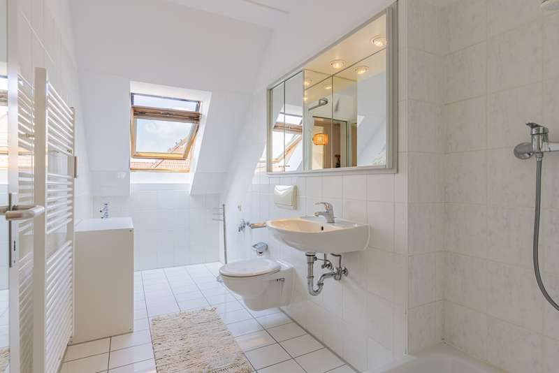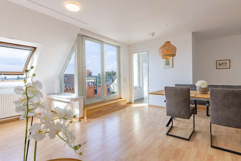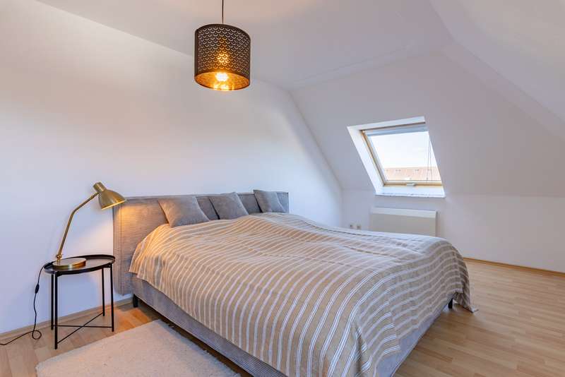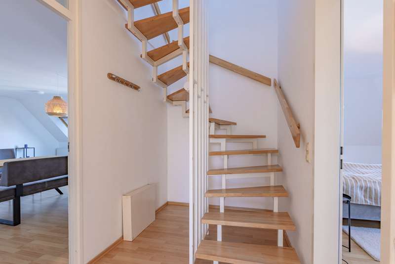 This well-kept and ready-to-move-in maisonette extends over two floors and, with a living space of approx. 108 m² spread over 4 rooms, offers a comfortable home for families or couples with space requirements. The apartment is located in a residential complex built in 1997 and impresses with its well thought-out room layout and bright, friendly atmosphere. The spacious, light-flooded living area welcomes you on the first floor. This is complemented by two well-designed bedrooms and a shower room. The living room leads out onto the loggia, where you can spend relaxing hours outdoors and enjoy a wonderful view over Werder (Havel). The adjoining kitchen area is equipped with a fitted kitchen and blends harmoniously into the living concept. A stylish wooden spiral staircase leads from the hallway to the top floor, where you will find an additional bedroom, a bathroom with bathtub and a practical storage area. The apartment is in a very well-kept and contemporary condition. A separate cellar room offers additional storage space, while the underground parking space belonging to the apartment ensures convenient and secure parking. The residential building is supplied by district heating. With energy efficiency class A, it meets contemporary and sustainable living standards. Not only the apartment itself is impressive, but also the landscaped communal area, which is available to all residents. Here you can spend relaxing hours in the countryside during the warmer months and enjoy the proximity to nature.