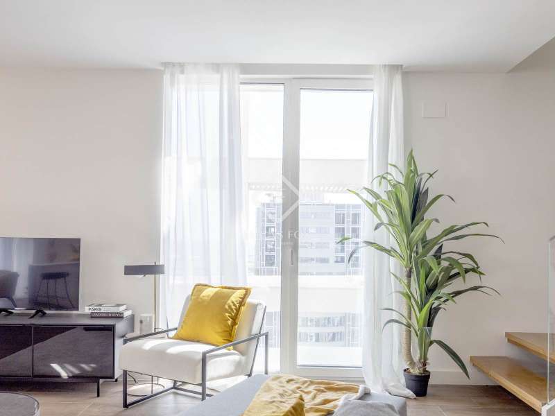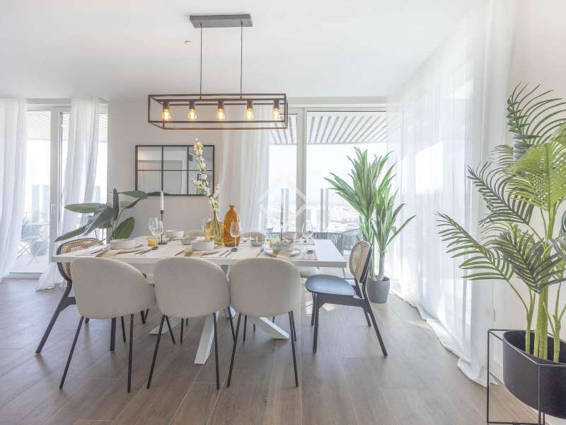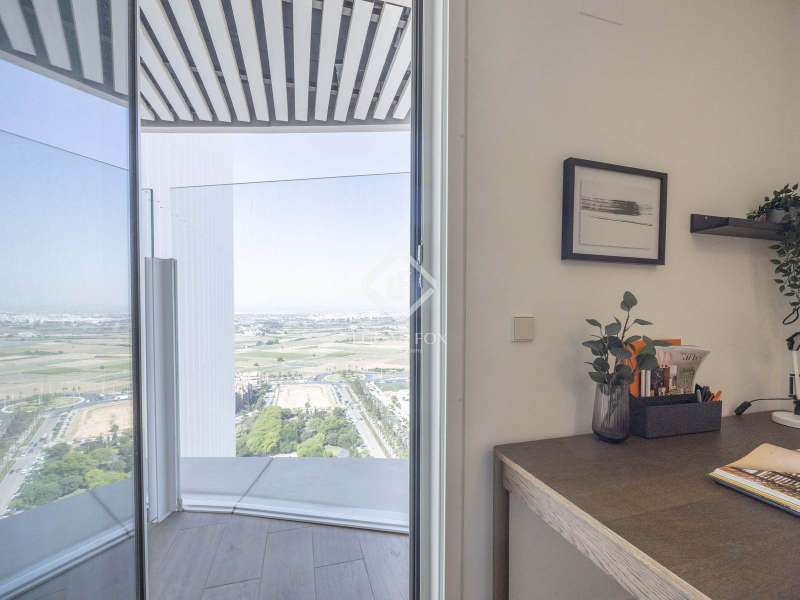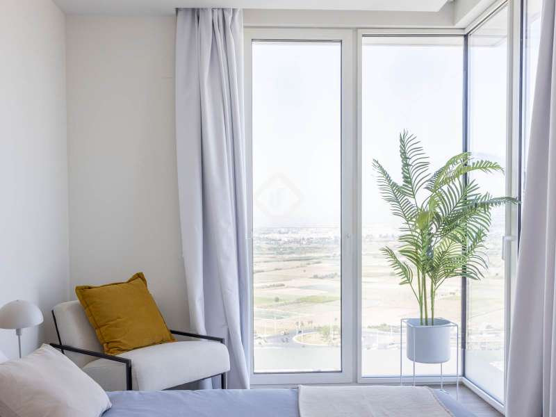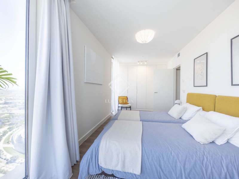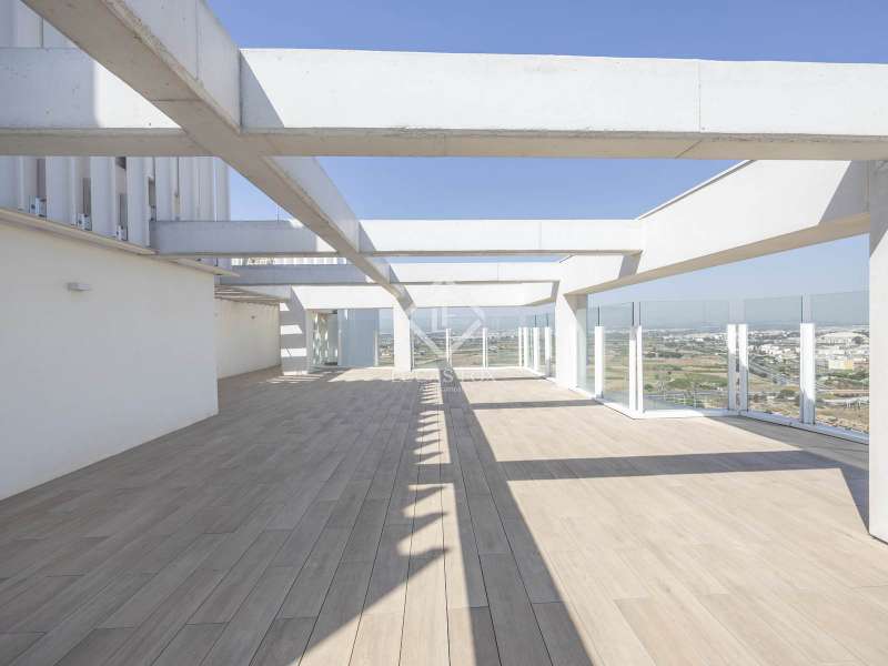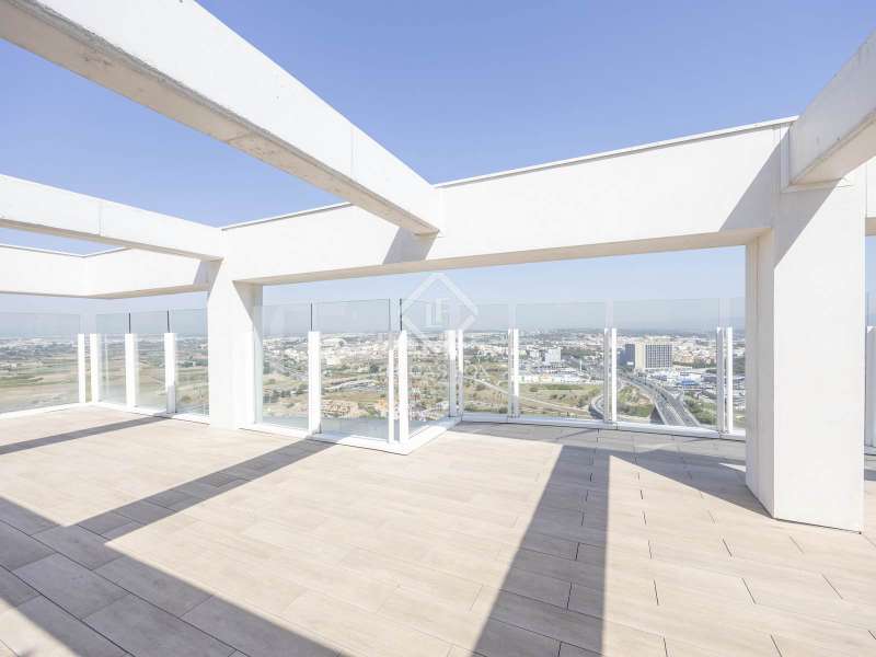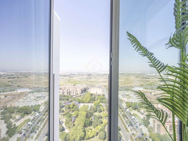 We present one of the most exclusive penthouses of the Ikon project, the new residential icon of the city of Valencia next to the Palacio de Congresos. The penthouse with more than 350 m² built is located on the 29th floor of tower A, from where you can enjoy the best panoramic views of the city. This very special penthouse of the development has excellent panoramic views of the capital and a northwest orientation. It benefits from perfectly distributed spaces and several terraces in different orientations, as well as an immense solarium on the upper floor. The penthouse is distributed over two floors. The living areas of the home are located on the access floor, while its large solarium with the option of a jacuzzi occupies the upper floor. The day area consists of a large living room with several windows and access to a large front terrace. Next to this space, there is a guest bathroom and the kitchen with island, dining area and access to the terrace. On the opposite side, there is the night area, made up of three double bedrooms and with large wardrobes. The master bedroom enjoys its private bathroom. The three bedrooms are exterior facing and have access to several terraces or have large corner windows that offer magnificent exterior views. The penthouse extends from the interior to the terraces, which with their large windows, present us with panoramic views of the city skyline; thus from the private space itself, a unique atmosphere is created where the blue sky and the urban landscape are part of the home. In it, the architecture reaches its maximum degree of design and quality, as can be seen in the decoration, layout and finishes, as well as the brands used and the sunny aspect of the home. The choice of materials and finishes, with their surfaces and textures, achieve an effect of integration and continuity, transmitting a feeling of purity and timelessness. Get in touch for detailed information on this exclusive penthouse located in the city's new residential icon, where dreams come true.