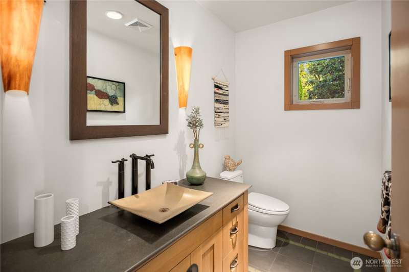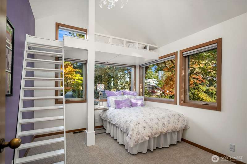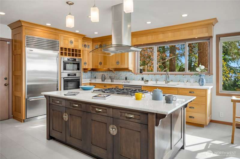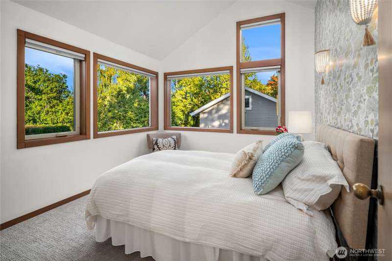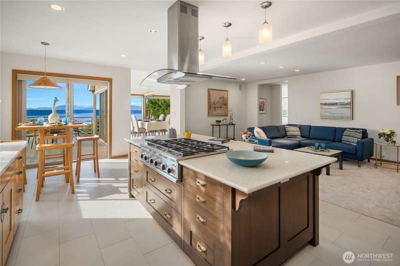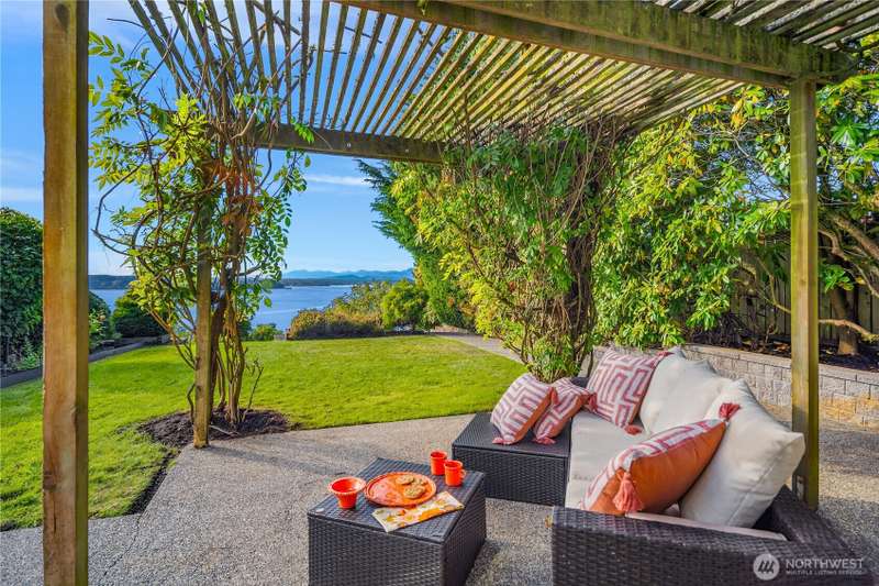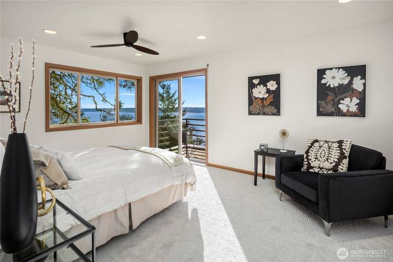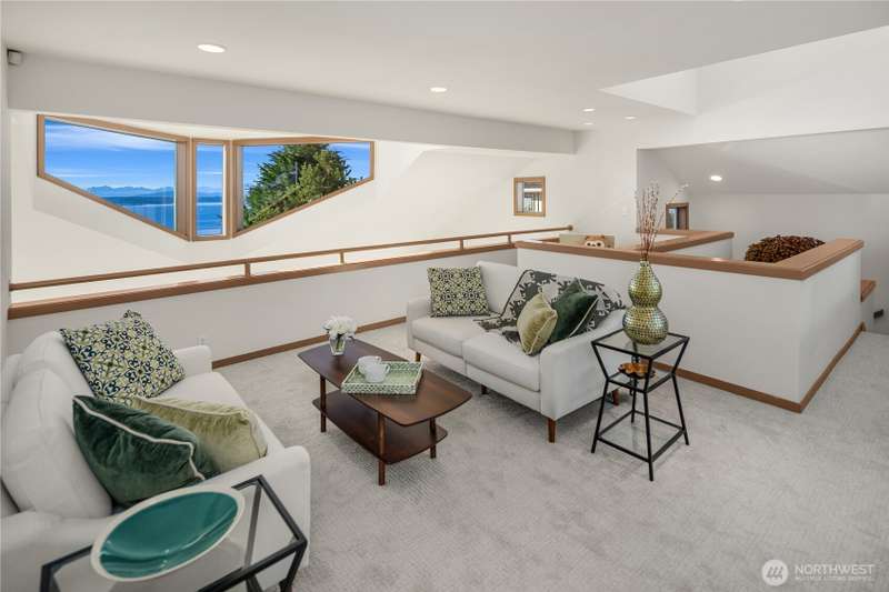 Amazing Northwest Contemporary home. Quiet and Peaceful. Sweeping Puget Sound views from all floors. Exceptional craftsmanship. Expansive living and dining areas. Family room next to gorgeous kitchen with dining nook and top of the line appliances. Upper floor features three bedrooms, two fantastic baths, and sitting room loft space. Downstairs has huge rec room, or use as 2nd primary suite, with glass doors leading to patio and backyard. Office area, exercise room too. New interior paint, carpet, and tile. Beautifully landscaped. Privately tucked away from street down circular driveway that accesses two garages. 2nd garage has electric, water, and sewer for potential extra unit. Level entry. A truly grand property. Whole house A/C!