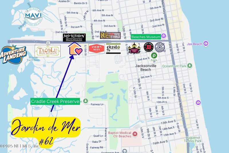 Walk to TacoLu's, Mojo BBQ, Mavi, Gusto and the Jacksonville Beach Golf Course from this beautiful ground floor Jardin de Mer condominium. Just 15 blocks to Jacksonville Beach's oceanfront and the nearby Paws Dog Park, it's a great community, a great location and a great value. This first floor condominium has 1500 square feet, 3 bedrooms, 2 baths, laundry room (washer & dryer included), storage room and wood burning fire place. It also includes an attached garage with an oversized storage closet. No carpet in this home, wood plank tile throughout the living space. Newer HVAC and Water Heater. You'll just love coming home to your 'Garden by the Sea'.