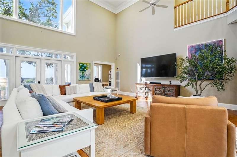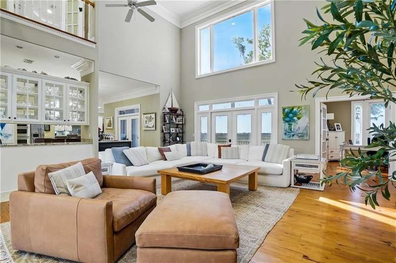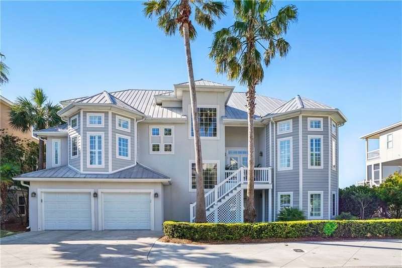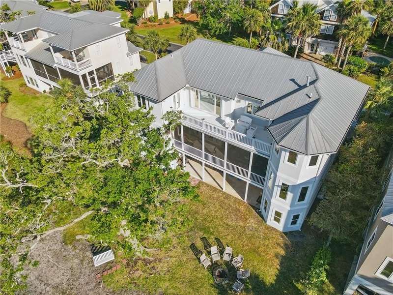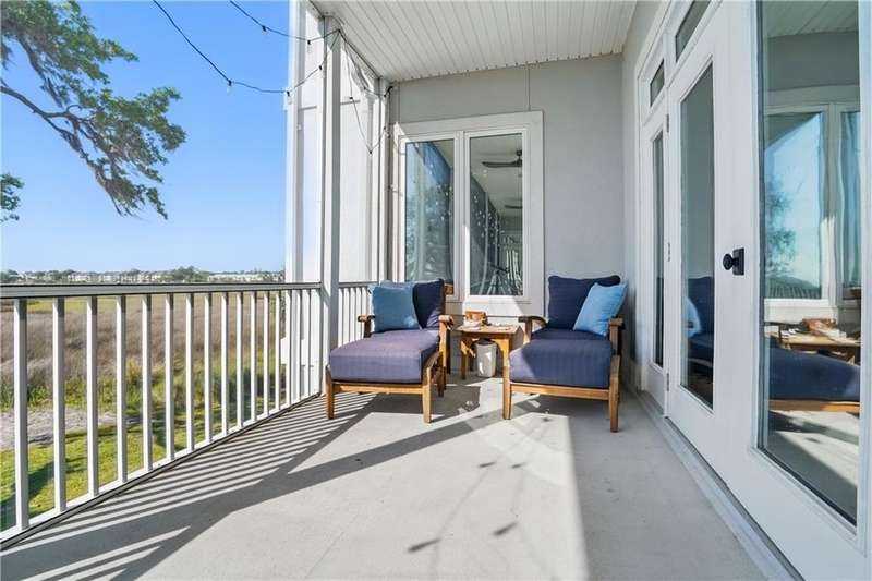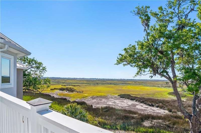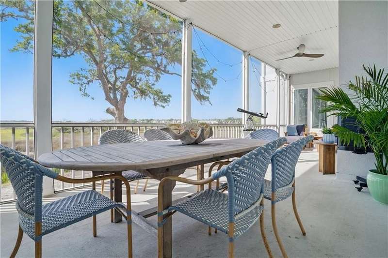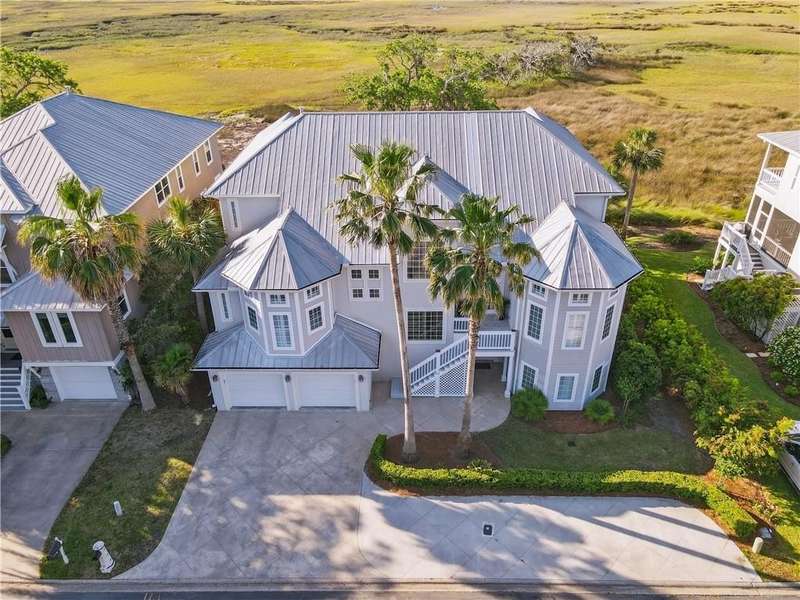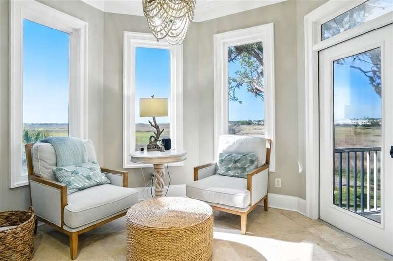 Awaken each morning to the stunning spectacle of a breathtaking sunrise over the serene marsh, with captivating views of Sea Island and Village Creek from this exquisite 5-bedroom, 6.5-bathroom home, thoughtfully designed for both relaxation and entertaining in the coveted gated community of Sunrise Point. The impeccably maintained main level showcases a grand great room with soaring 20-foot ceilings, creating an inviting atmosphere. The open floor plan seamlessly connects the dining area to a spacious kitchen adorned with elegant hardwood and travertine floors. A chef's dream, the kitchen features top-of-the-line stainless steel Thermador and Bosch appliances, a generous center island, striking granite countertops, and a cozy breakfast nook, all of which flow effortlessly onto a large screened porch that offers panoramic marsh views. On the main level, you'll also find three generously sized guest bedrooms and two and a half well-appointed baths. Ascend to the third floor to discover two luxurious private bedroom suites. The expansive primary suite serves as a personal retreat, complete with his and her baths, each featuring walk-in closets and a cozy fireplace for those cooler evenings. Both suites provide access to a private deck that showcases stunning marsh vistas. The property is complemented by a spacious garage accommodating four vehicles plus a golf cart, equipped with a work area, ample storage, flexible space, and a full bath. An elevator ensures effortless access to all levels of this remarkable home. Located just moments away from exceptional dining and golfing options, this is an unparalleled opportunity you won't want to miss!