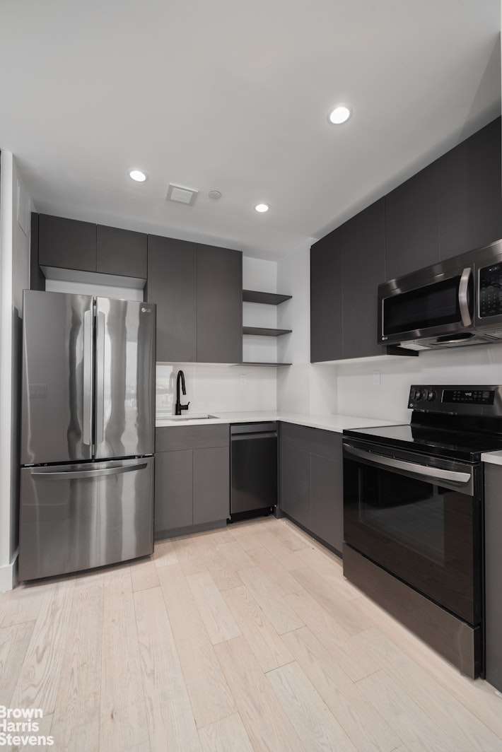Entering through the front door, you'll notice your sizable foyer, and to your right you'll appreciate your sparkling-white bathroom, complete with a rain shower, large, custom-designed vanity / medicine cabinet, and heater. Strolling down your long gallery hallway, you'll find a deep coat closet on your left, and a separate closet for your own Wi-Fi-enabled LG washer / dryer. In front, you'll fall in love with your corner open kitchen, which offer tons of storage and counter space, an LG stainless-steel refrigerator / freezer, a Samsung dishwasher, and an LG oven, range, and microwave.