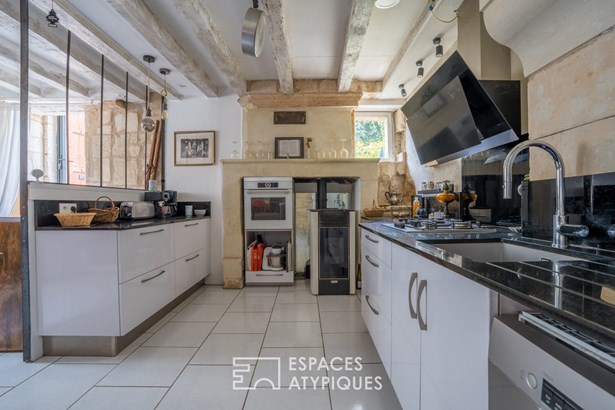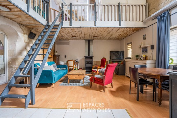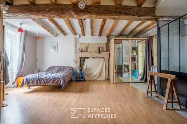 From the entrance, a warm atmosphere emerges thanks to a fully equipped kitchen, decorated with a pellet stove, opening onto a light-filled living-dining room with a wood-burning stove and reversible air conditioning. The cellar staircase leads to a unique space housing an old press and a still-functional bread oven, while a remarkable cellar features Gallo-Roman paving. Upstairs, a bedroom with an en-suite shower, a bathroom with a bathtub, and a multipurpose space dedicated to sewing make up this level. The top floor houses two attic bedrooms, each accessible by a separate staircase, offering privacy and a unique charm.