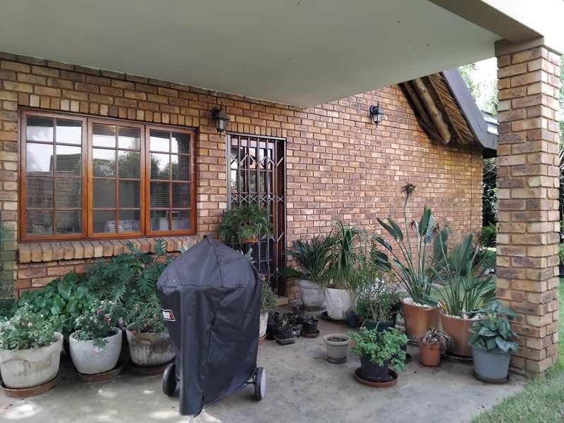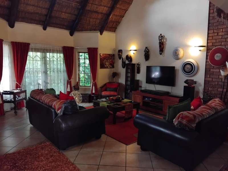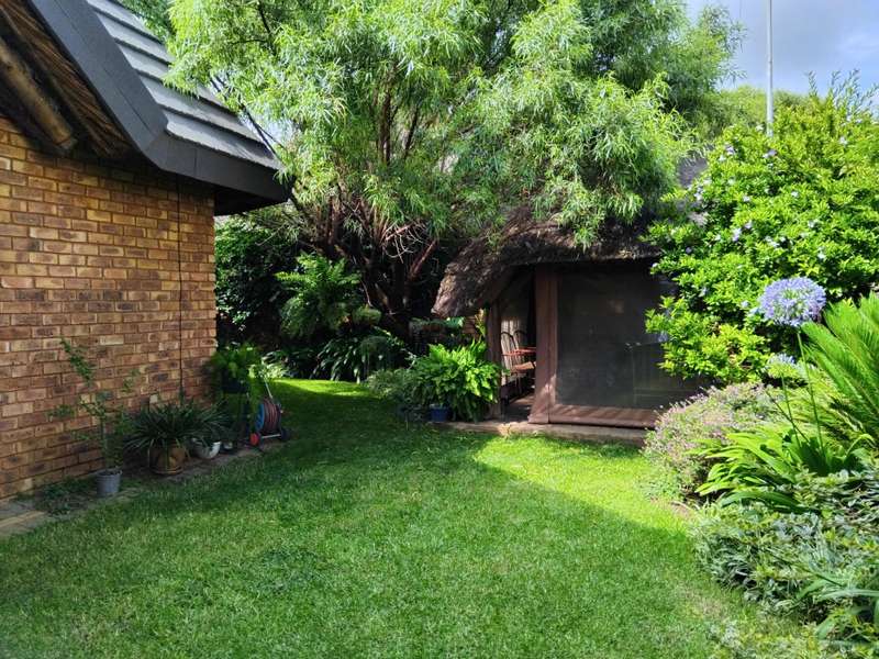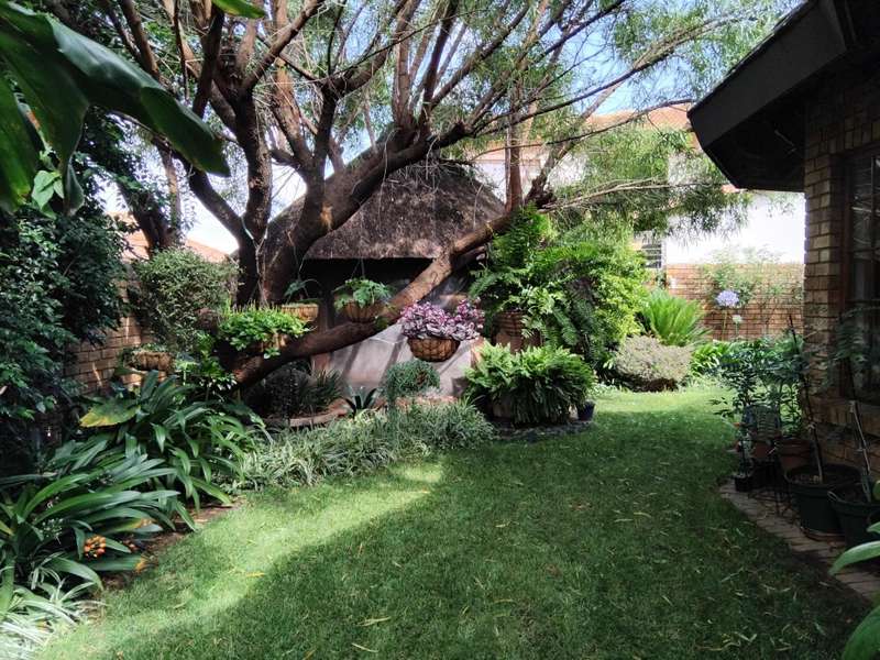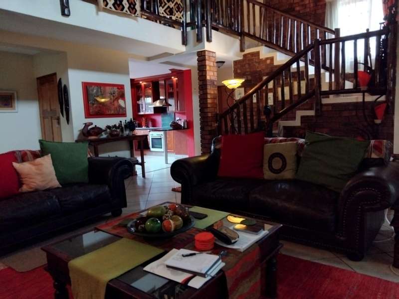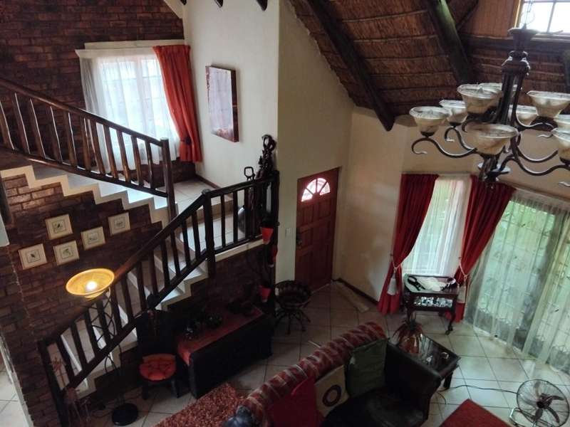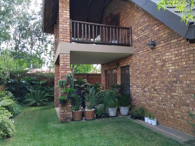 SPACIOUS AND IMMACULATE FACEBRICK 4 BEDROOM CLUSTER ?Çô FULL TITLE This home welcomes you with it?ÇÖs natural ambiance and warmth of an African Lodge feel. Tulusisa Terrace is a full title security complex, well positioned in Rynfield, with easy access to major routes, shopping centres, schools and local amenities. This exquisite home has so much to offer; 4 Bedrooms ?Çô two downstairs and two upstairs. Large main bedroom with dressing room and en-suite bathroom and balcony. The second upstairs bedroom has it?ÇÖs own large private patio. 2 Full bathrooms, one downstairs and one upstairs. 2 Large living rooms ?Çô one downstairs and one upstairs. The upper living room could easily be divided into two more bedrooms ?Çô this could become a six bedroom home! Lovely double volume open plan living room, ease of flow to the open plan kitchen. The kitchen is enriched with solid wooden cabinetry, has granite tops, separate laundry and scullery area, plus pantry cupboard. The thatched roof has newly been Marley tiled over ?Çô so no maintenance is required, however, the thatch is still visible internally and hence the natural ambiances. Ample storage areas that include a linen cupboard and storage cupboard under the stairs. Double automated garage with direct access into the home. The home is surrounded by a picturesque, well established and maintained garden, complete with irrigation. Pre-paid electricity. Live in safety with fantastic 24/7 security guarded system, with intercom access. To view this accommodating family home by appointment, please call Carron today. Land size : 408sqm Floor Area : 245sqm Rates + Taxes : R1 757 HOA Levy : R800 Water : Approximately R700 Security Levy : R800 ENJOY THE GARDEN FROM THE THATCHED ENTERTAINERS LAPA THAT HAS ROLL DOWN SIDES TO PROTECT FROM THE WEATHER.