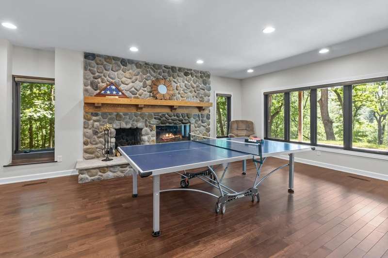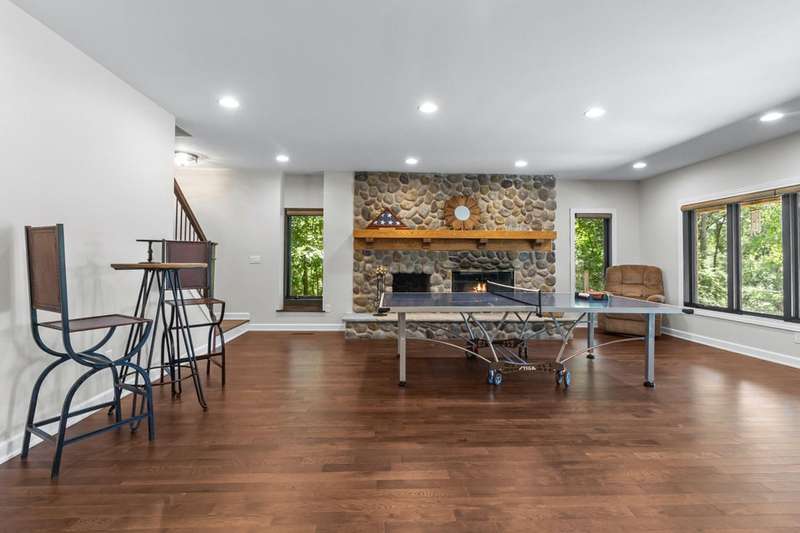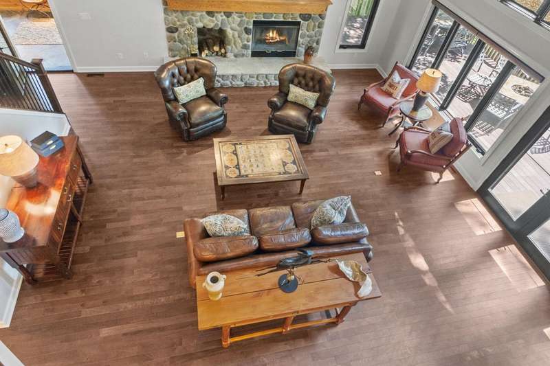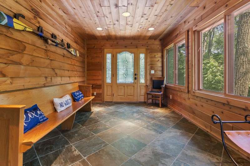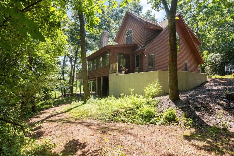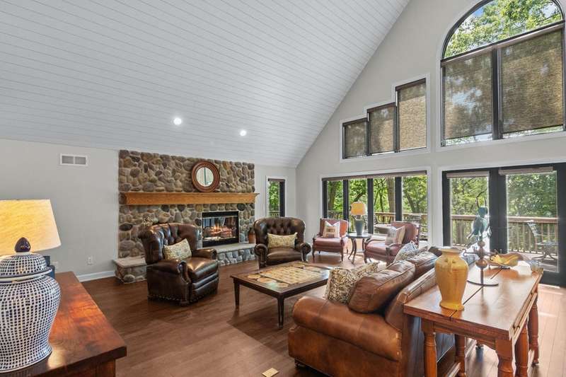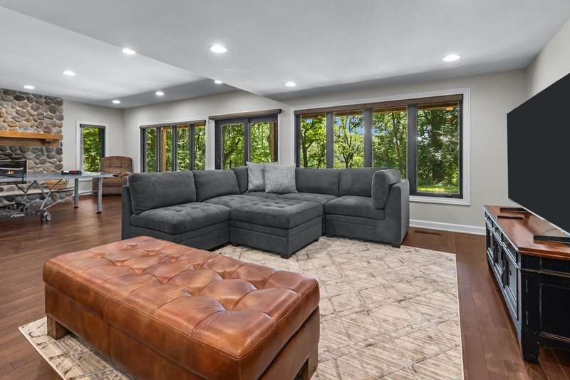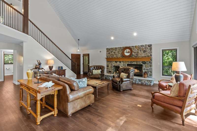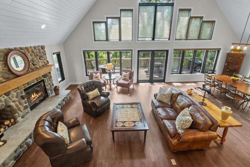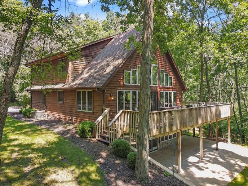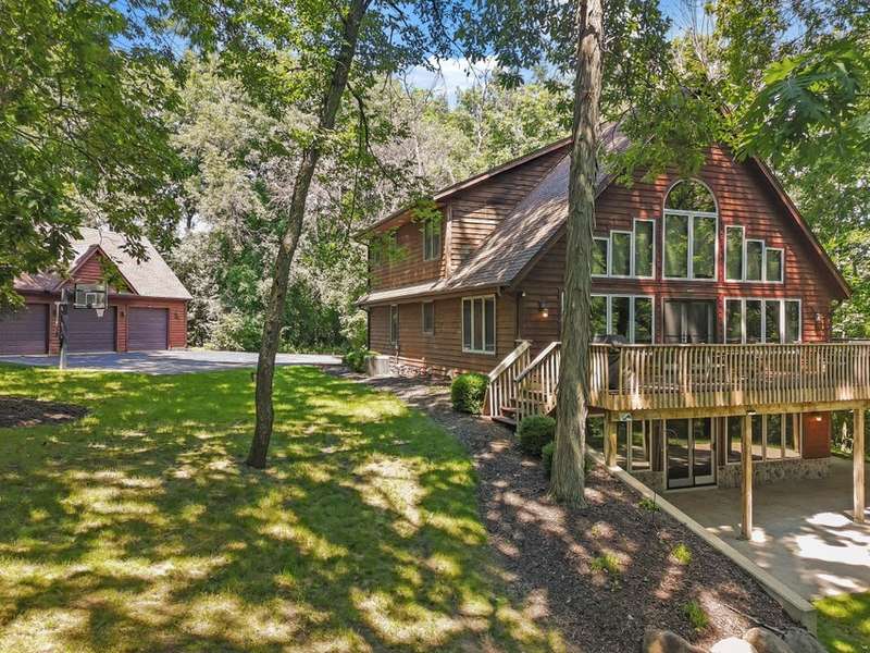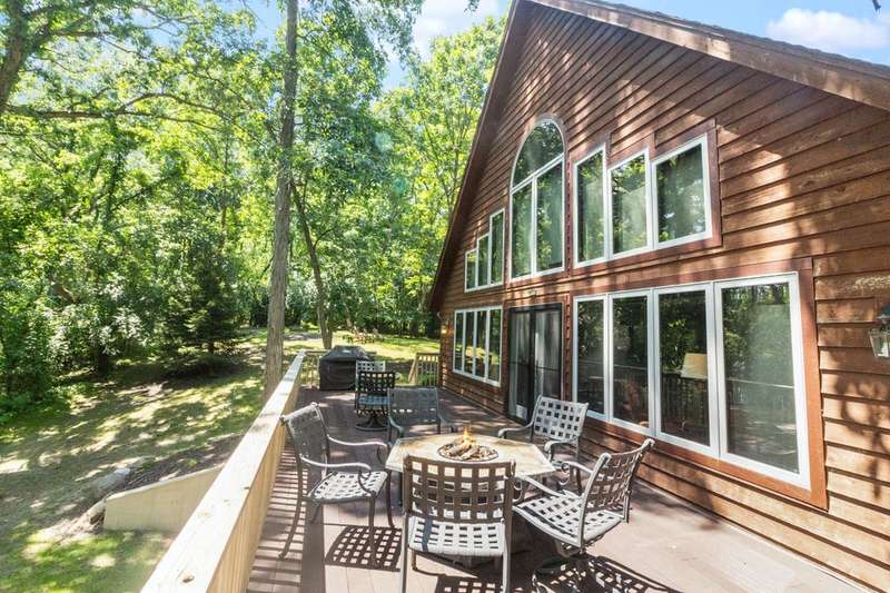 Beautiful Chalet Style home on over 5.5 wooded, glacier-carved terrain giving you the up north feel. This 4-bedroom 3 bath home has been renovated from top to bottom including all new windows throughout. An expansive full wall of windows fills the interior with natural light that walks out to the wrap around deck. 3 finished levels of space, 2 huge stone fireplaces. Upstairs, a versatile loft serves perfectly as a bunk room or a luxurious primary suite, complete with a private bath & walk-in closet. Lower-level offers a large family room with a walk-out wrap around patio. 4 car garage with an upper-level bonus room perfect for the kids or man cave. A custom stone path leads to your private dock/pier. In minutes you'll be on the sparkling waters of all sport Lake Beulah!!