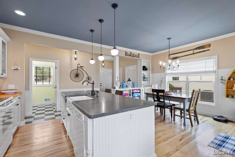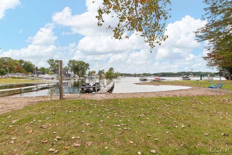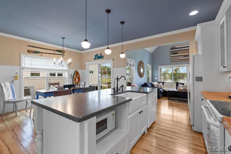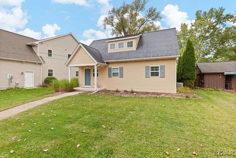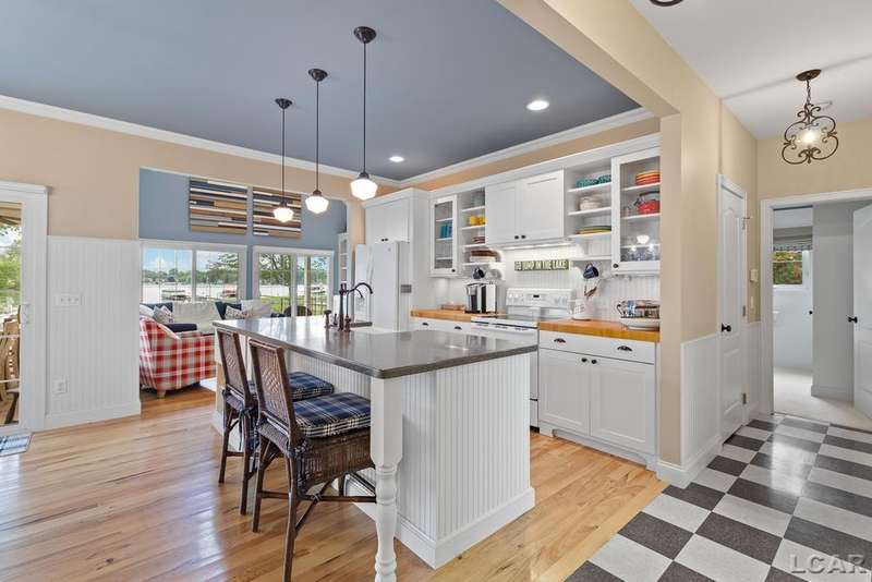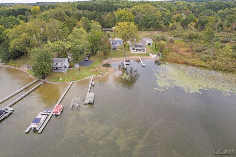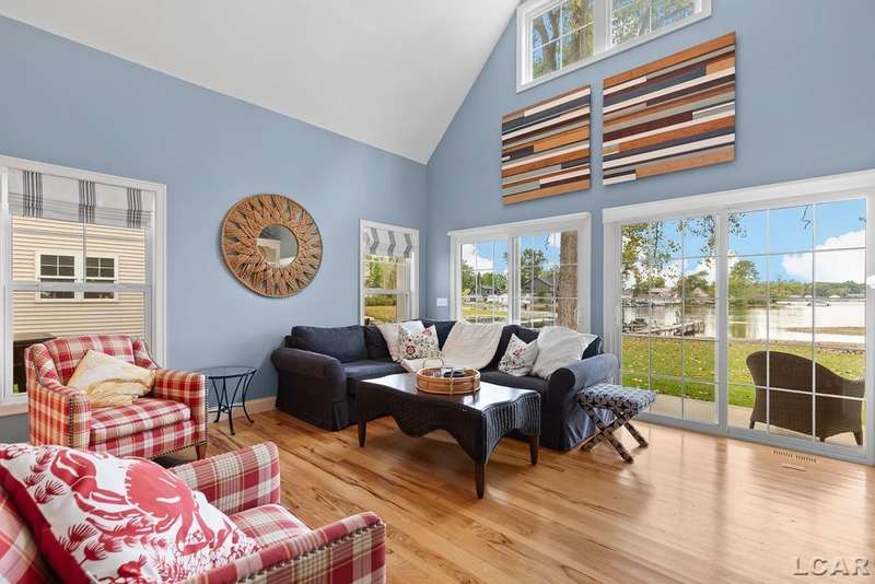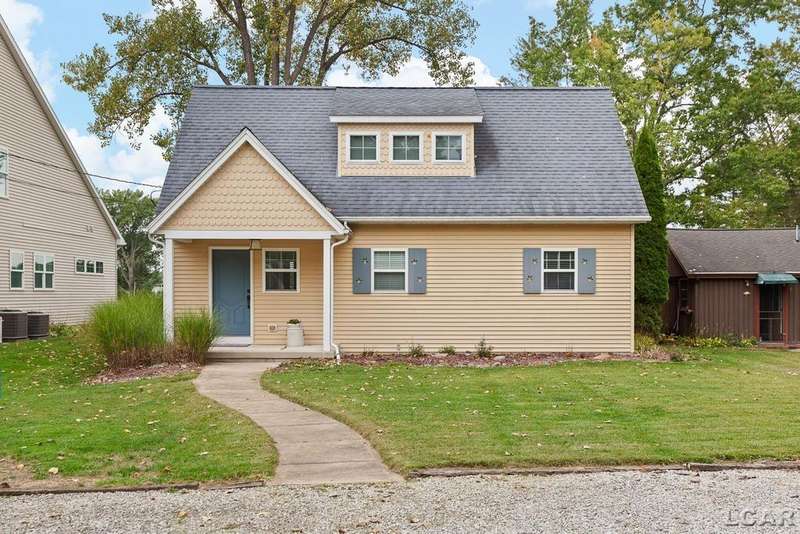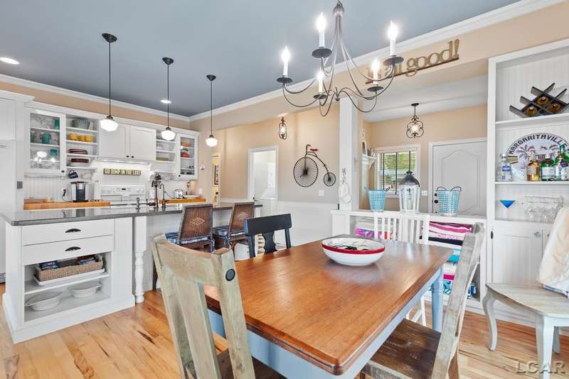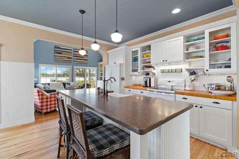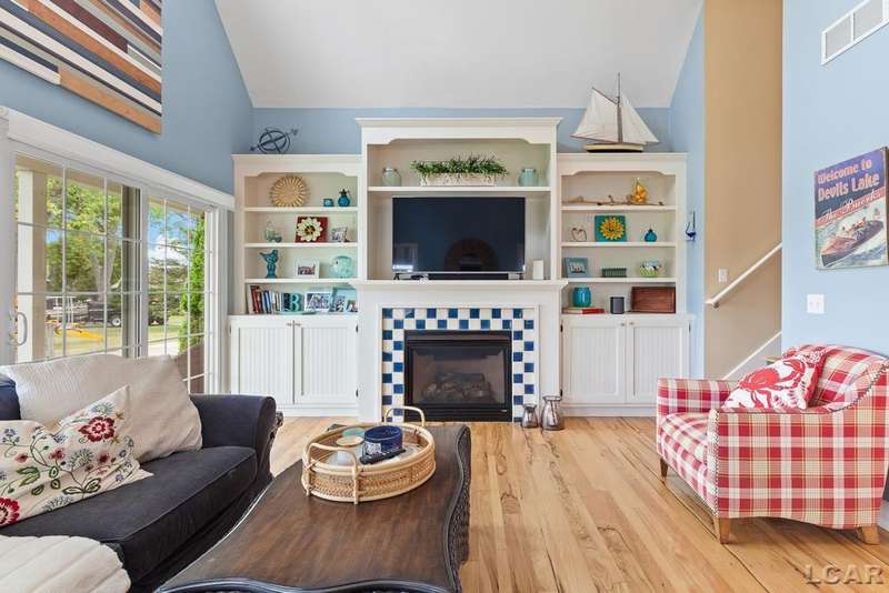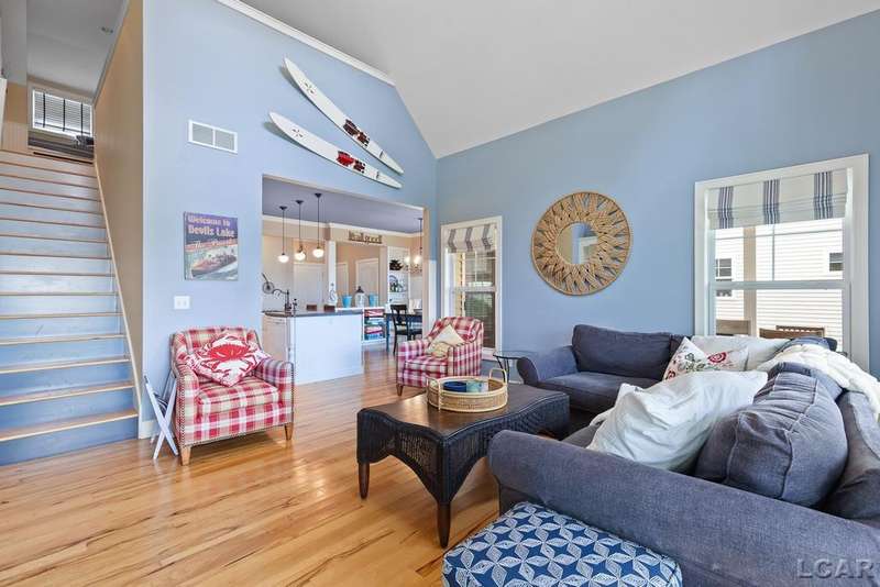 Devil's Lake Waterfront Home with 80' of beachfront property. This gorgeous lakefront home features 1700+ sq. ft of living space with 3 BD 1-1/2 BA offered fully furnished is beautifully maintained inside and out. Hardwood floors throughout with soaring ceilings and walls of windows for natural light. Open concept kitchen with solid surface countertops and large island seating for gathering. The dining and living room overlooking beautiful backyard space for all the activities, with no stair steps to the waterfront. Main floor master bedroom with private patio and views of the lake. Upstairs features two bedrooms, 1/2 bath and loft area with built in day bed and pull-out queen bed sofa for additional sleeping options.