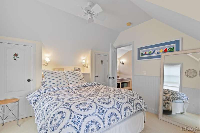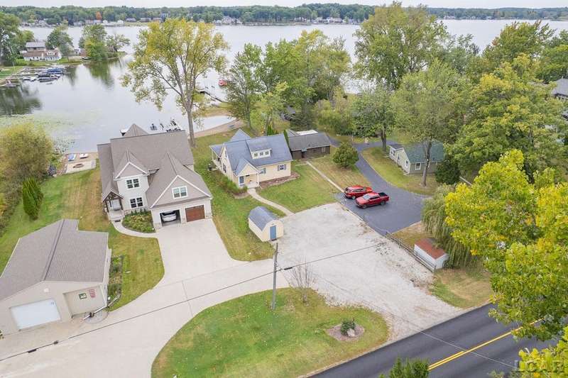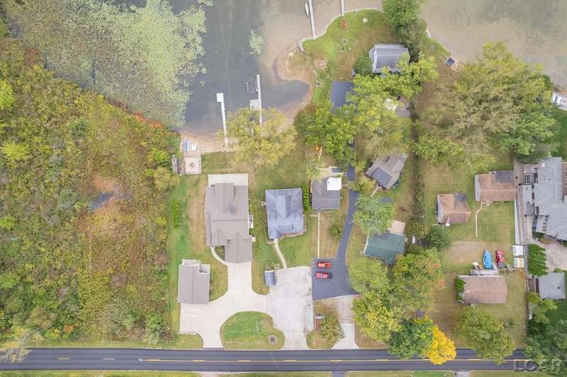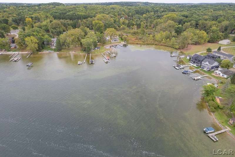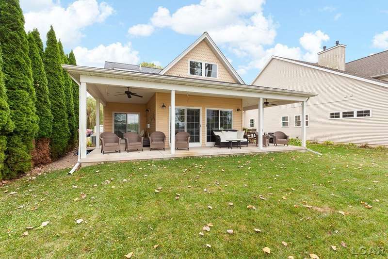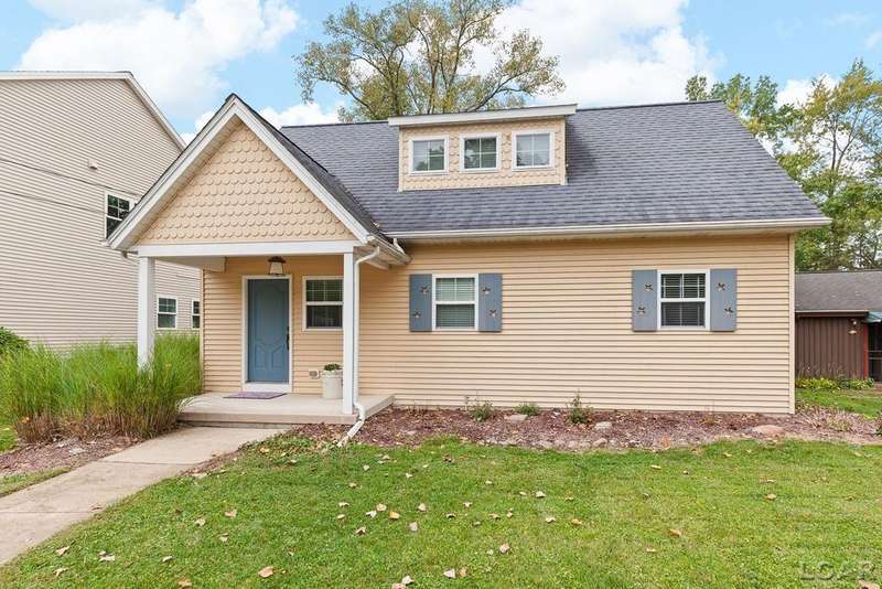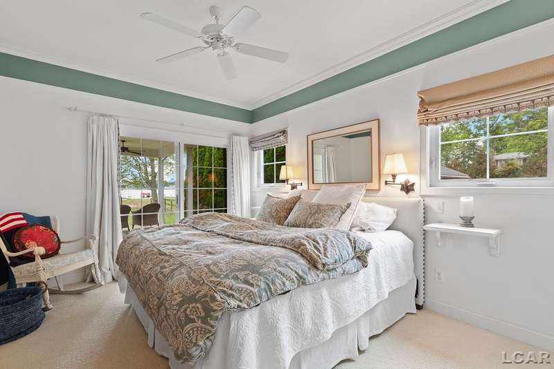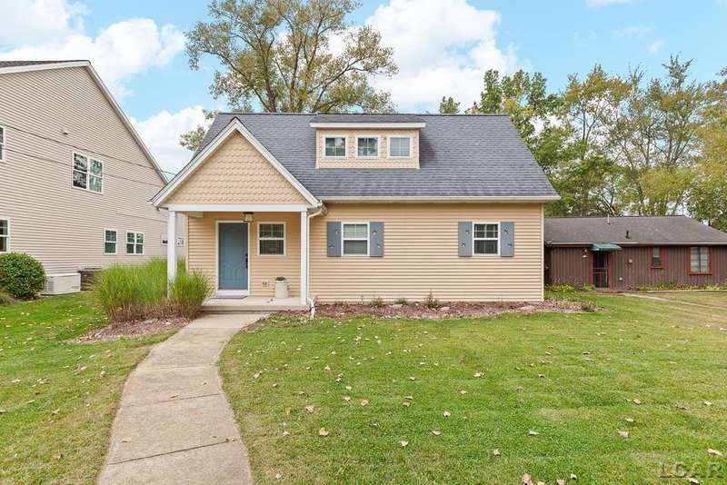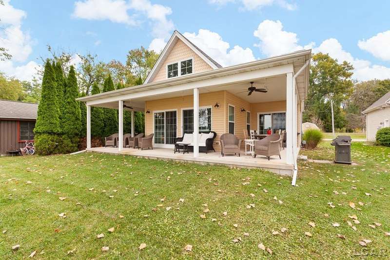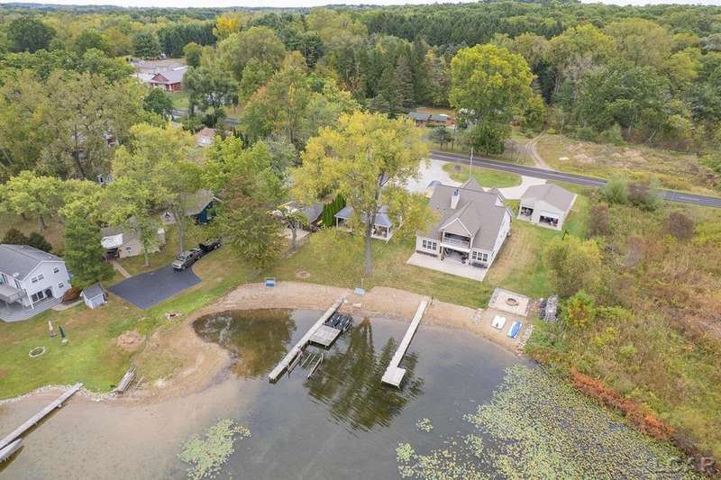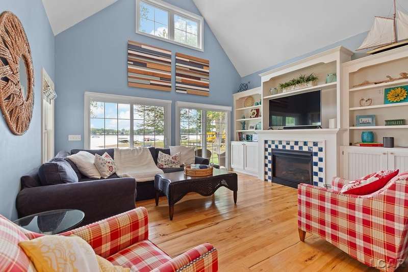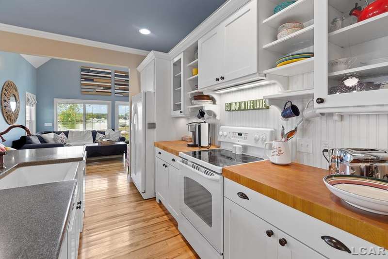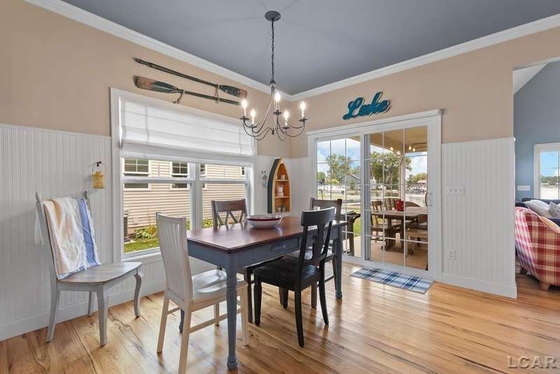 Devil's Lake Waterfront Home with 80' of beachfront property. This gorgeous lakefront home features 1700+ sq. ft of living space with 3 BD 1-1/2 BA offered fully furnished is beautifully maintained inside and out. Hardwood floors throughout with soaring ceilings and walls of windows for natural light. Open concept kitchen with solid surface countertops and large island seating for gathering. The dining and living room overlooking beautiful backyard space for all the activities, with no stair steps to the waterfront. Main floor master bedroom with private patio and views of the lake. Upstairs features two bedrooms, 1/2 bath and loft area with built in day bed and pull-out queen bed sofa for additional sleeping options.