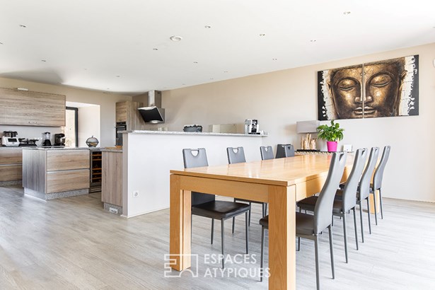 Le rez-de -chaussee abrite les pieces de vie d'environ 90m2 composees d'un salon avec cheminee Polyflam, une salle a manger ainsi qu'une cuisine parfaitement amenagee et equipee.