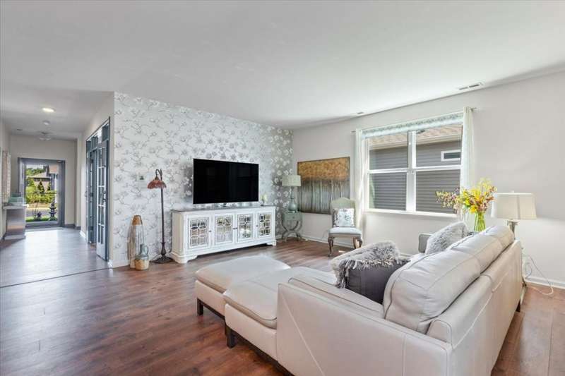 This inviting corner ranch offers the ease of single-story living in the desirable Wentworth neighborhood of Gurnee. With 2 bedrooms plus a versatile den/flex room, the home provides options for a private office, nursery, or hobby space. The open floor plan creates a seamless flow between the living, dining, and kitchen areas, filled with natural light from large windows and sliding doors. The kitchen is a true centerpiece, featuring a generous island and walk-in pantry, while the adjacent laundry room adds everyday convenience. The spacious primary suite is a retreat of its own, boasting a luxurious bath with double vanity, soaking tub, separate shower, and an enviable 10x12 walk-in closet, plus an additional smaller walk-in closet for even more storage. A three-season room opens to a block-paver patio and tree-dotted yard, perfect for both quiet mornings and relaxed entertaining.Additional highlights include a 2-car garage and the low-maintenance lifestyle provided by the HOA, covering landscaping and snow removal. Ideally located just 2 miles from shopping, dining, Gurnee Mills, and highways 94 and 120, this move-in ready home combines comfort, privacy, and convenience in a welcoming community.