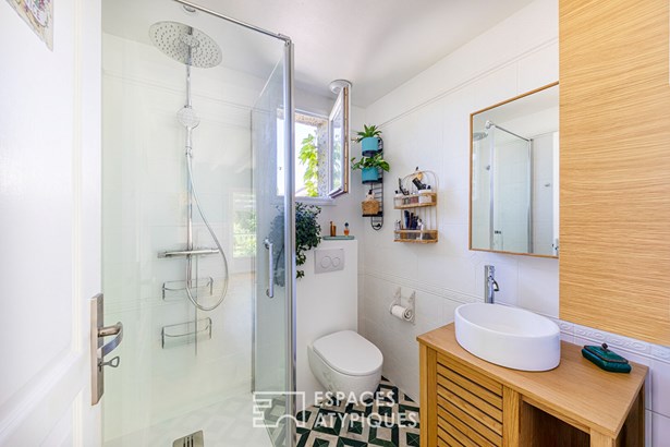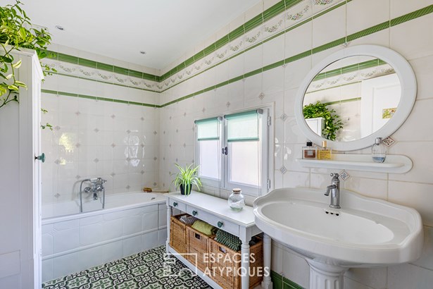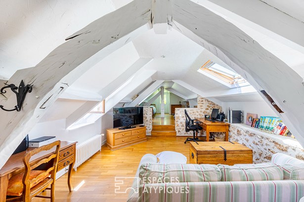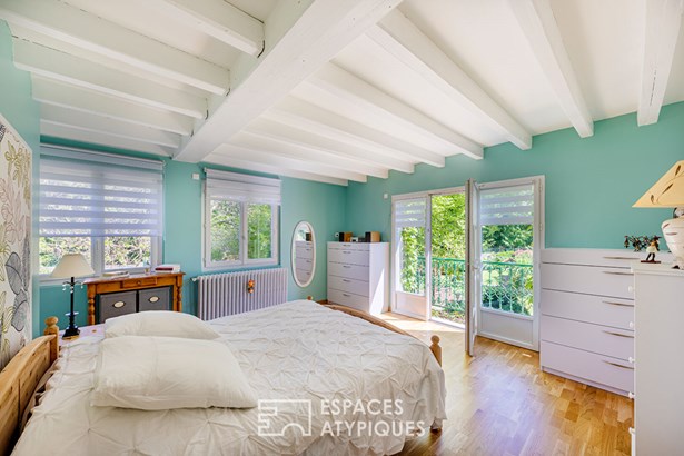 A beautiful wrought iron staircase leads upstairs, distributed by a landing fitted under slopes with several wardrobes and shoe rack serving a master suite with a balcony overlooking the superb view of the garden, a dressing room and a bathroom and suspended toilet. A large bedroom under exposed attic roof beams is accompanied by a toilet (all the arrivals are in place to create a bathroom).