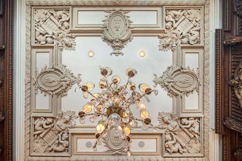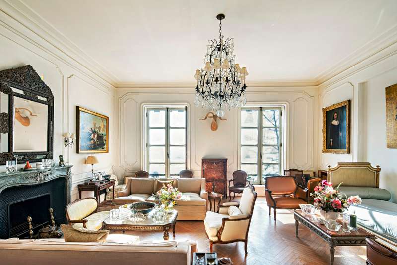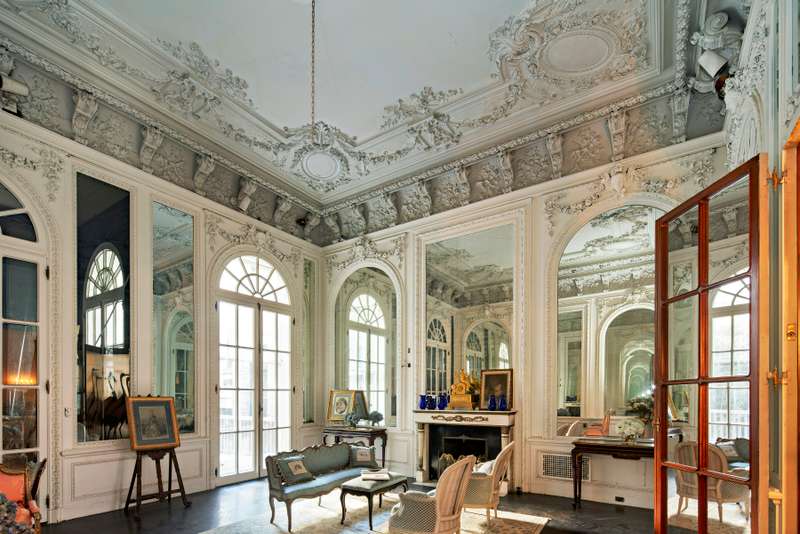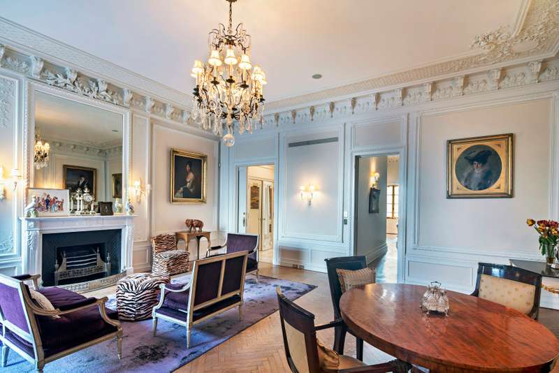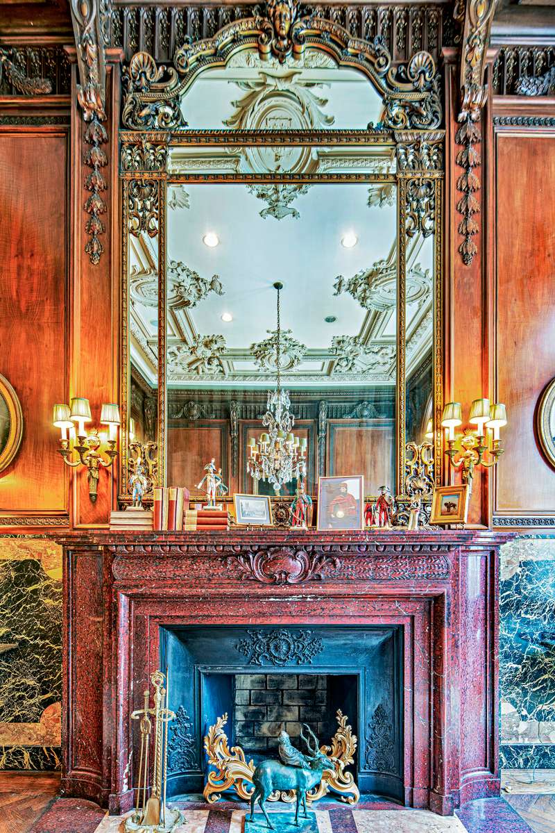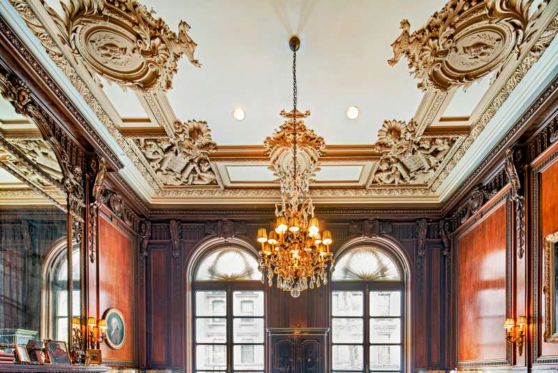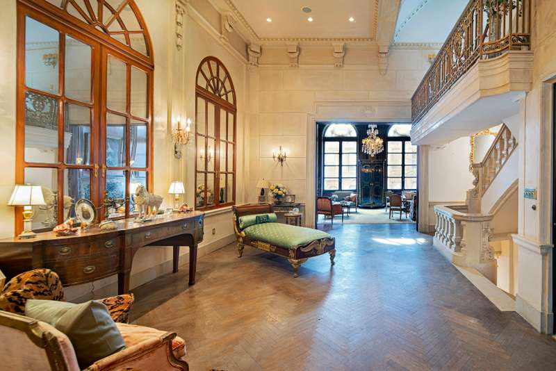 A grand paneled library with a fireplace and two huge, south-facing Palladian French windows overlooks 63rd Street. Opposite the landing is a resplendent drawing room with a fireplace, mirrored walls, intricate moldings, and ornate stonework extending to the ceilings. Beyond are an Anteroom, Bar area and Pantry. French door lead to an entertaining terrace and complete this level.