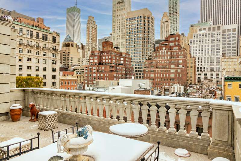 The sixth floor features a balcony and atrium overlooking the sitting room below, along with an additional and large, sunny bedroom with ensuite bath. This floor boasts two terraces: a north-facing terrace with views of the Upper East Side's landmarks and a south-facing terrace offering breathtaking panoramas of Midtown's skyline including Billionaires'Row to the west and partial views of Central Park.