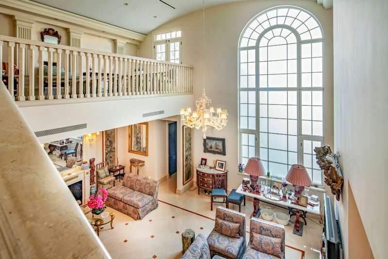 Designed as an opulent master suite, this floor features 12" ceilings and includes a front-facing sitting room with two tall French windows, a spacious dressing area, and two luxurious marble bathrooms.