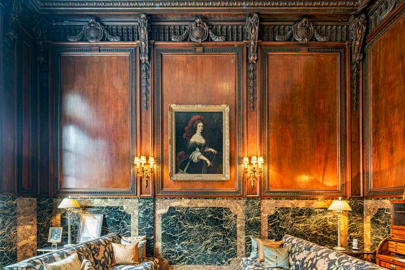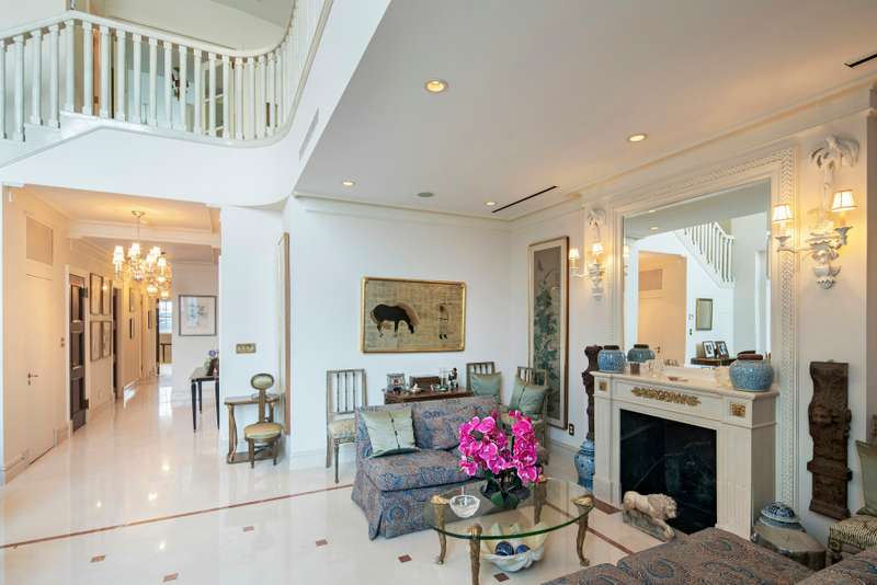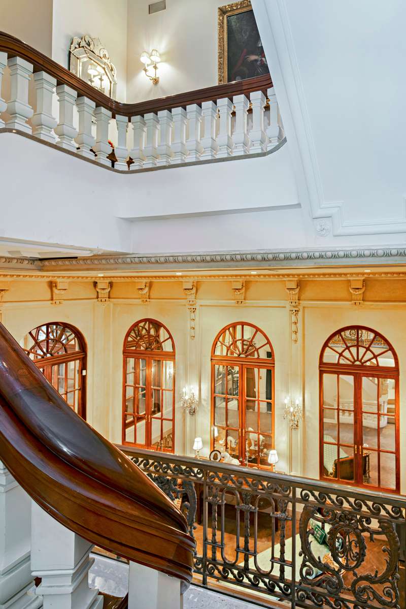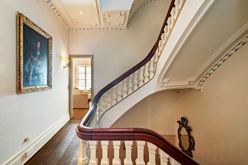 A remarkable double-height sitting room with a fireplace and a dramatic Palladian window defines the fifth floor. This level also includes two additional bedrooms with dressing areas and ensuite baths, as well as a kitchenette and dining area.